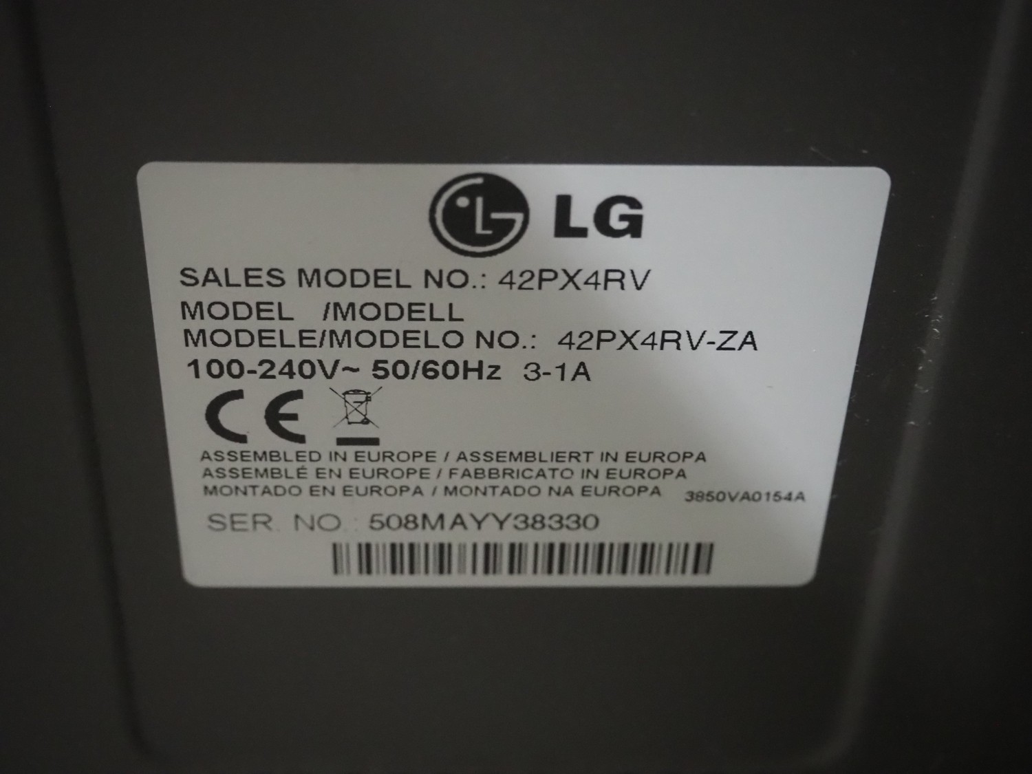LG television, model: 42PX4RV, serial number: 508MAYY38330, 100-240 V, 50/60 Hz, dimensions: 1250 mm x 300 mm x 710 mm. Technical condition unknown.