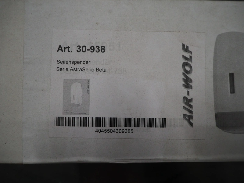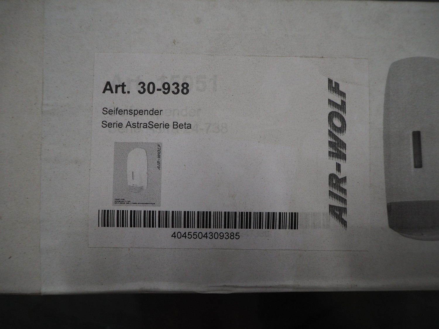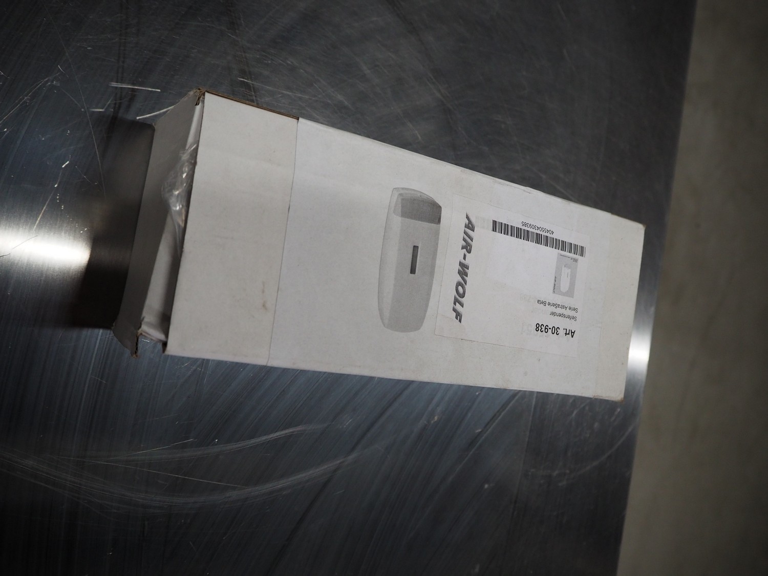 Pallet with 17 boxes with Air-Wolf soap dispensers, dimensions each dispenser: 290 mm x 110 mm x 110 mm, total dimensions: 1200 mm x 800 mm x 1850 mm.