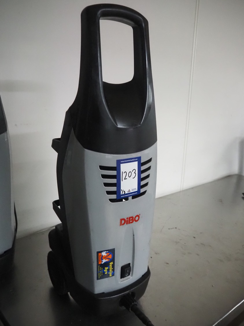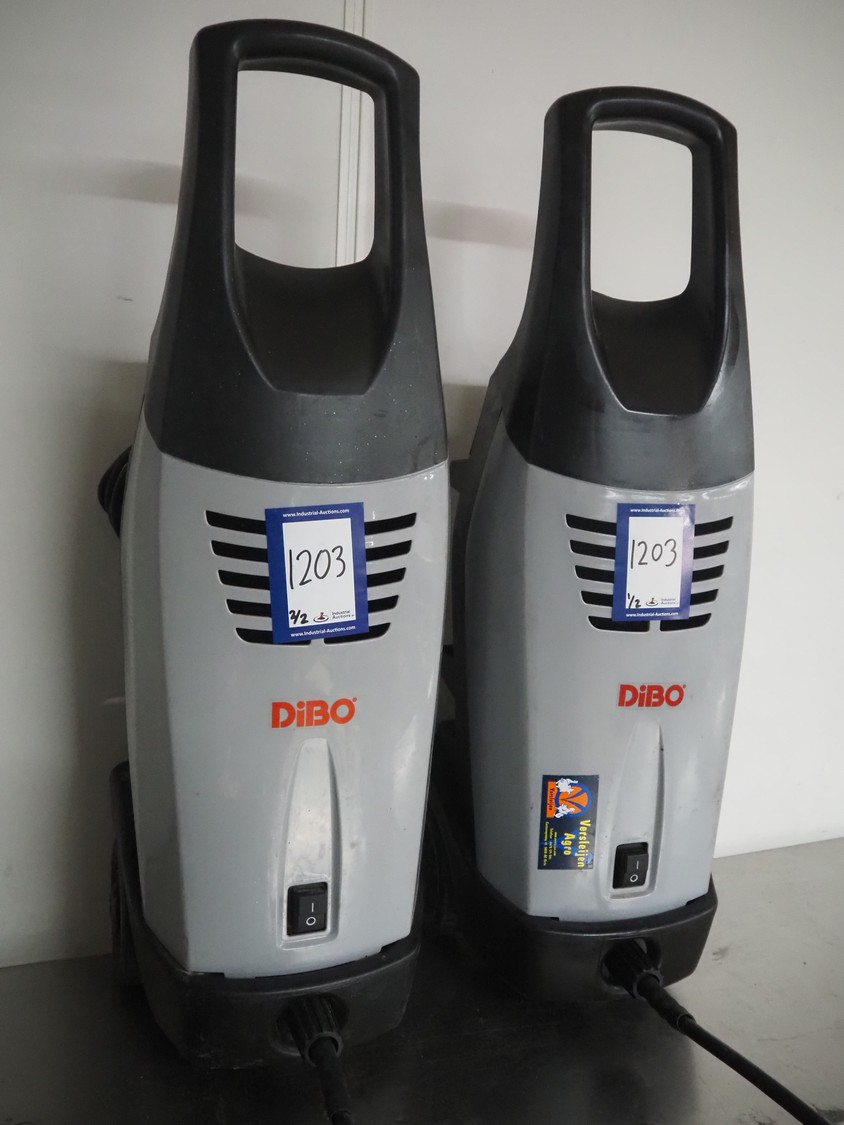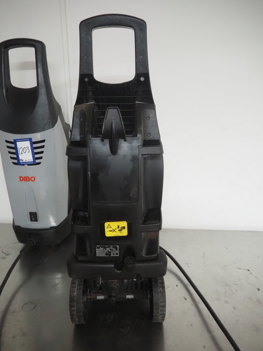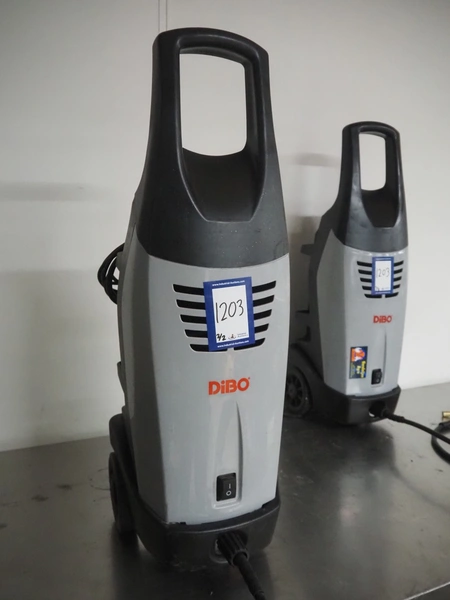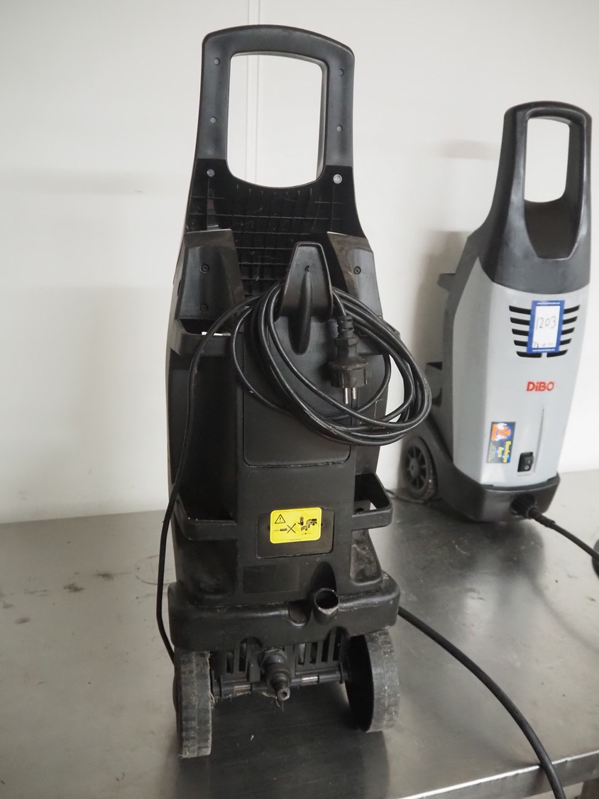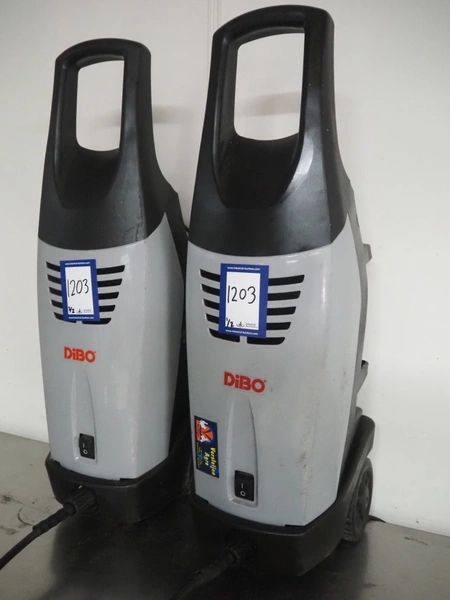 2 Dibo high pressure cleaners, type: H 1900, serial number: 090600092, year of construction: 2009, 230V, 50 Hz, 2.1 kW, 130 bar, 6.8 l/min, dimensions: (2x) 420 mm x 310 mm x 850 mm. Including 1 high pressure lance and 4 spare lance attachments, 1 wheel is broken.