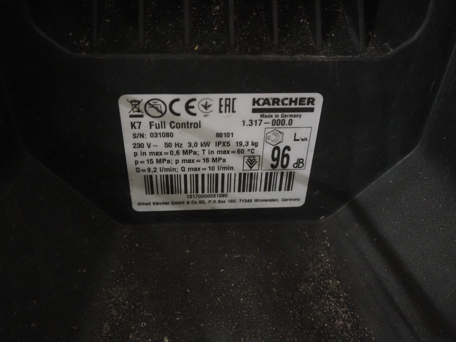 Kärcher high pressure cleaner, type: K7 full control, serial number: 031080, 230 V, 50 Hz, 3 kW, dimensions: 470 mm x 330 mm x 1000 mm.
