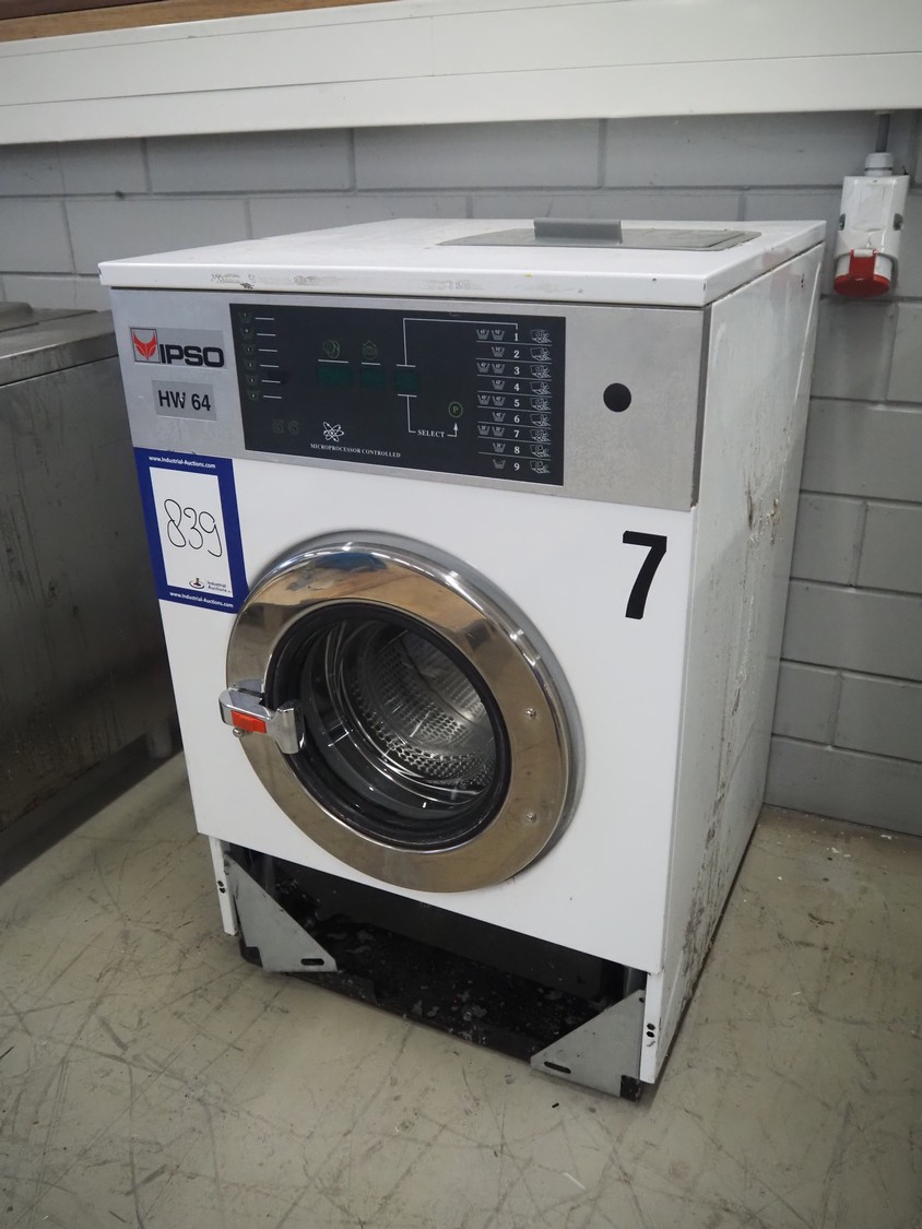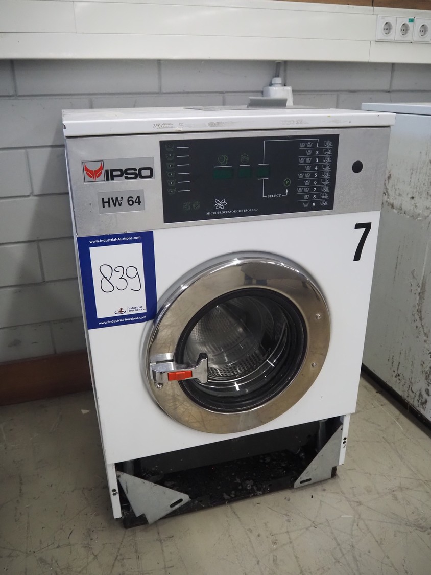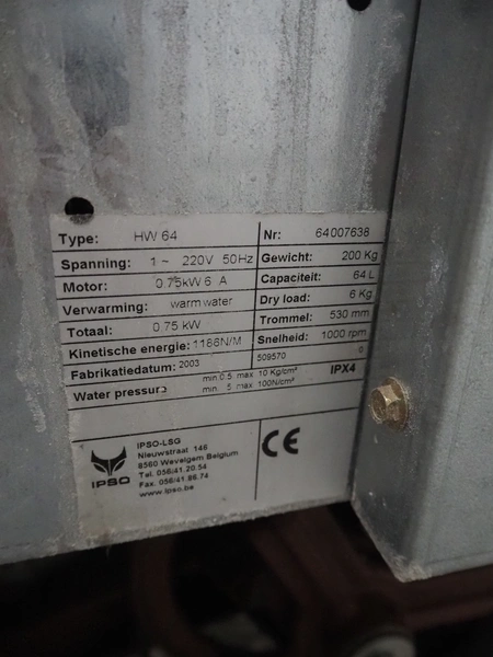 IPSO washing machine, type: HW 64, number: 64007638, year of construction: 2003, 220 V, 1 Ph, 50 Hz, 6 A, 0.75 kW, capacity: 6 kg, weight: 200 kg, dimensions: 660 mm x 820 mm x 1030 mm.