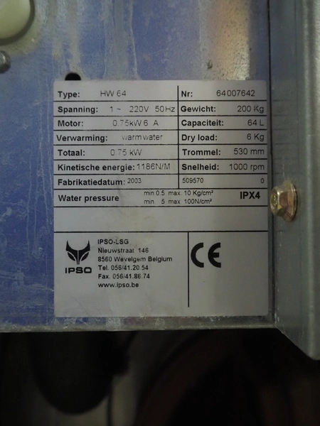 IPSO washing machine, type: HW 64, number: 64007642, year of construction: 2003, 220 V, 1 Ph, 50 Hz, 6 A, 0.75 kW, capacity: 6 kg, weight: 200 kg, dimensions: 660 mm x 820 mm x 1030 mm.