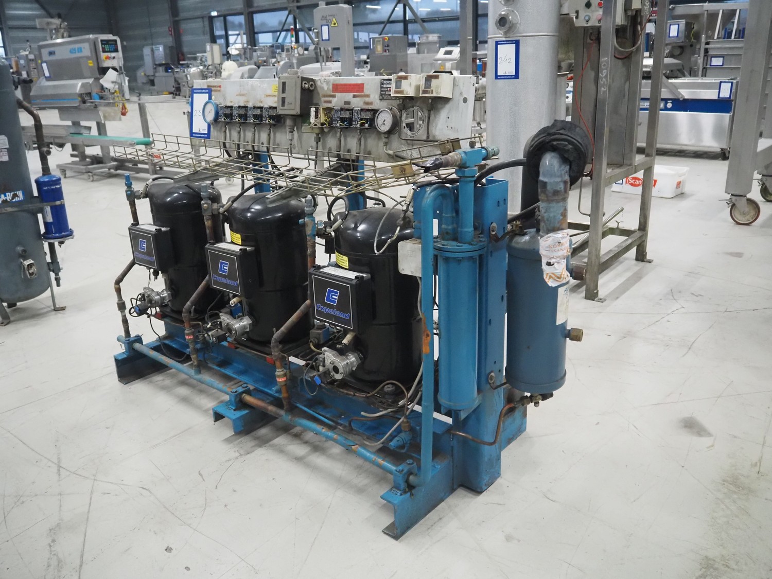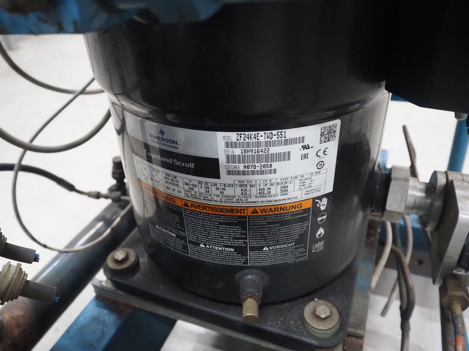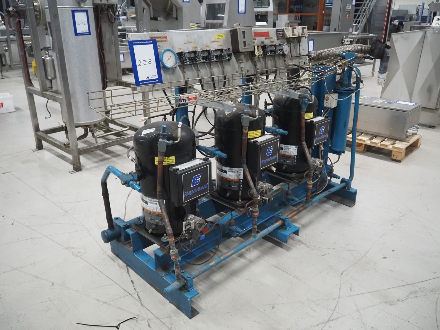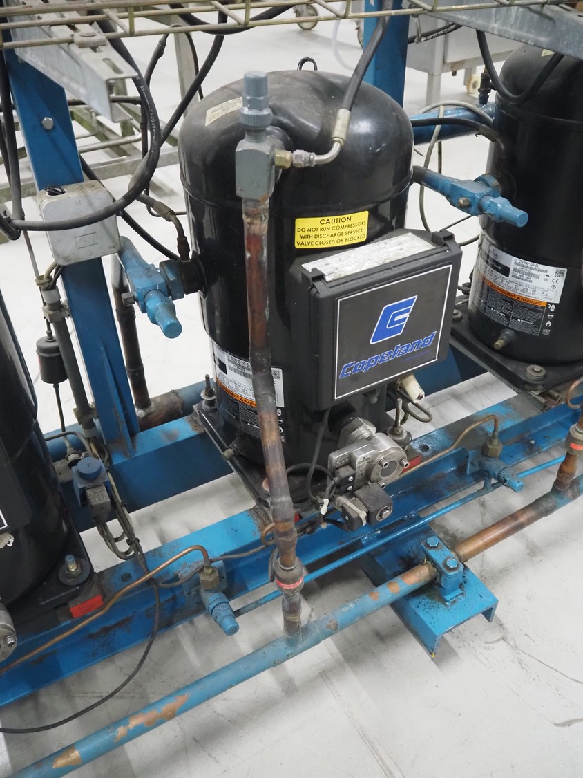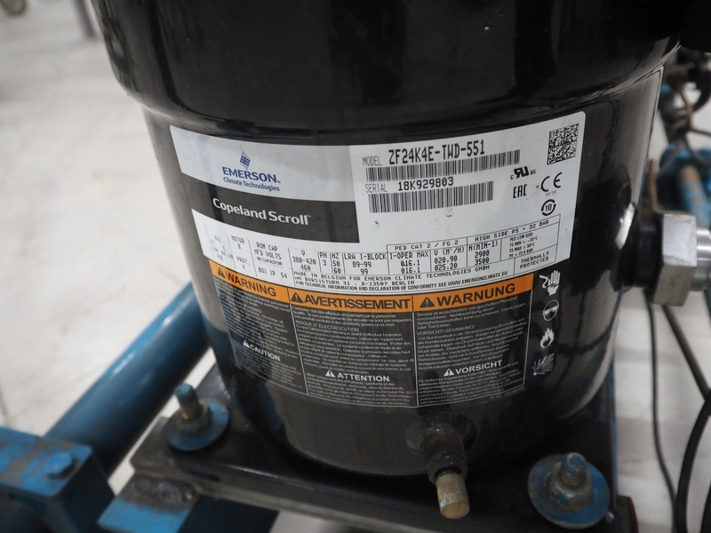 Copeland Scroll compressor rack with 3 scroll cooling compressors, model: ZF24K4E-TWD-551, serial number: 18K929803, 17C929753 and 18H916422, refrigerant: R449, dimensions: 2150 mm x 600 mm x 1200 mm.