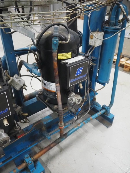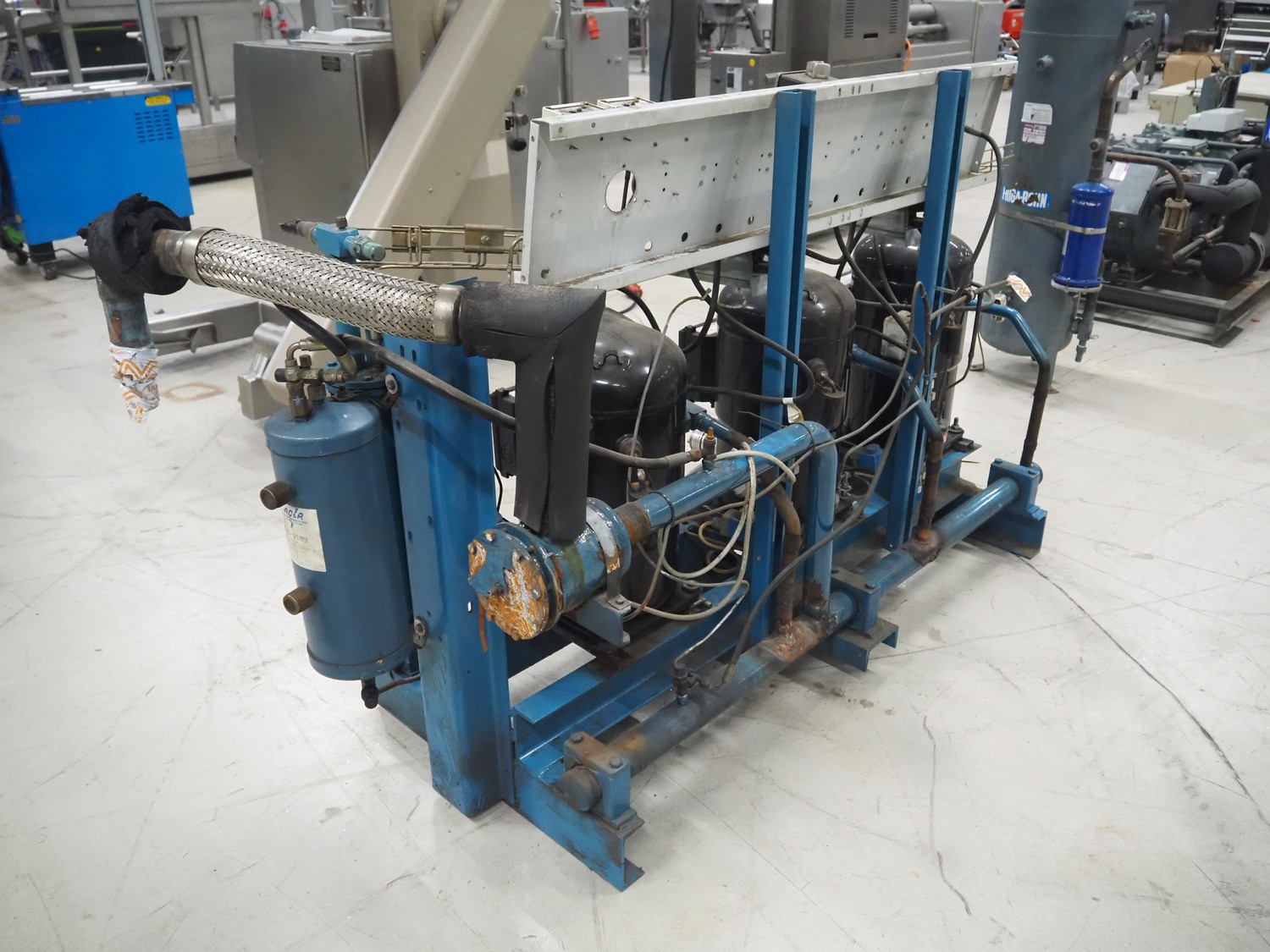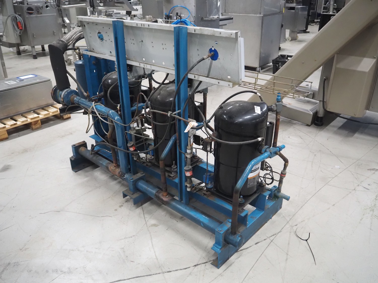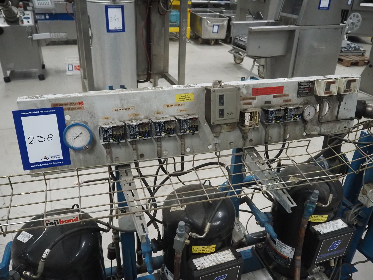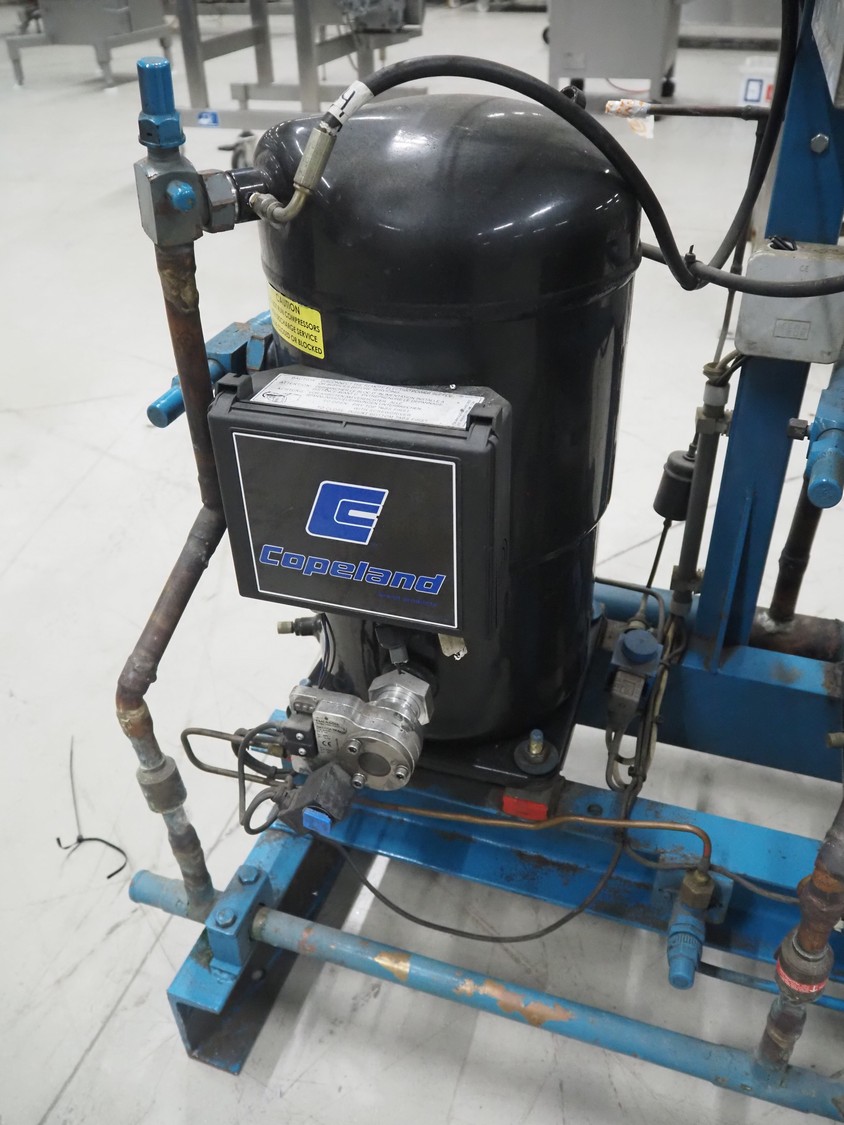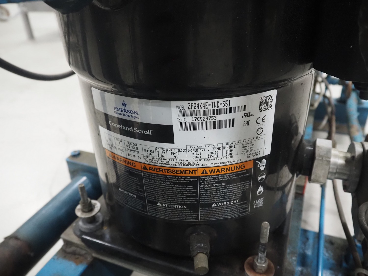 Copeland Scroll compressor rack with 3 scroll cooling compressors, model: ZF24K4E-TWD-551, serial number: 18K929803, 17C929753 and 18H916422, refrigerant: R449, dimensions: 2150 mm x 600 mm x 1200 mm.