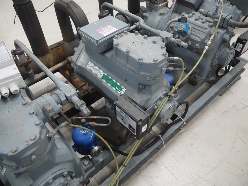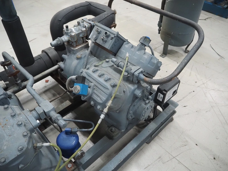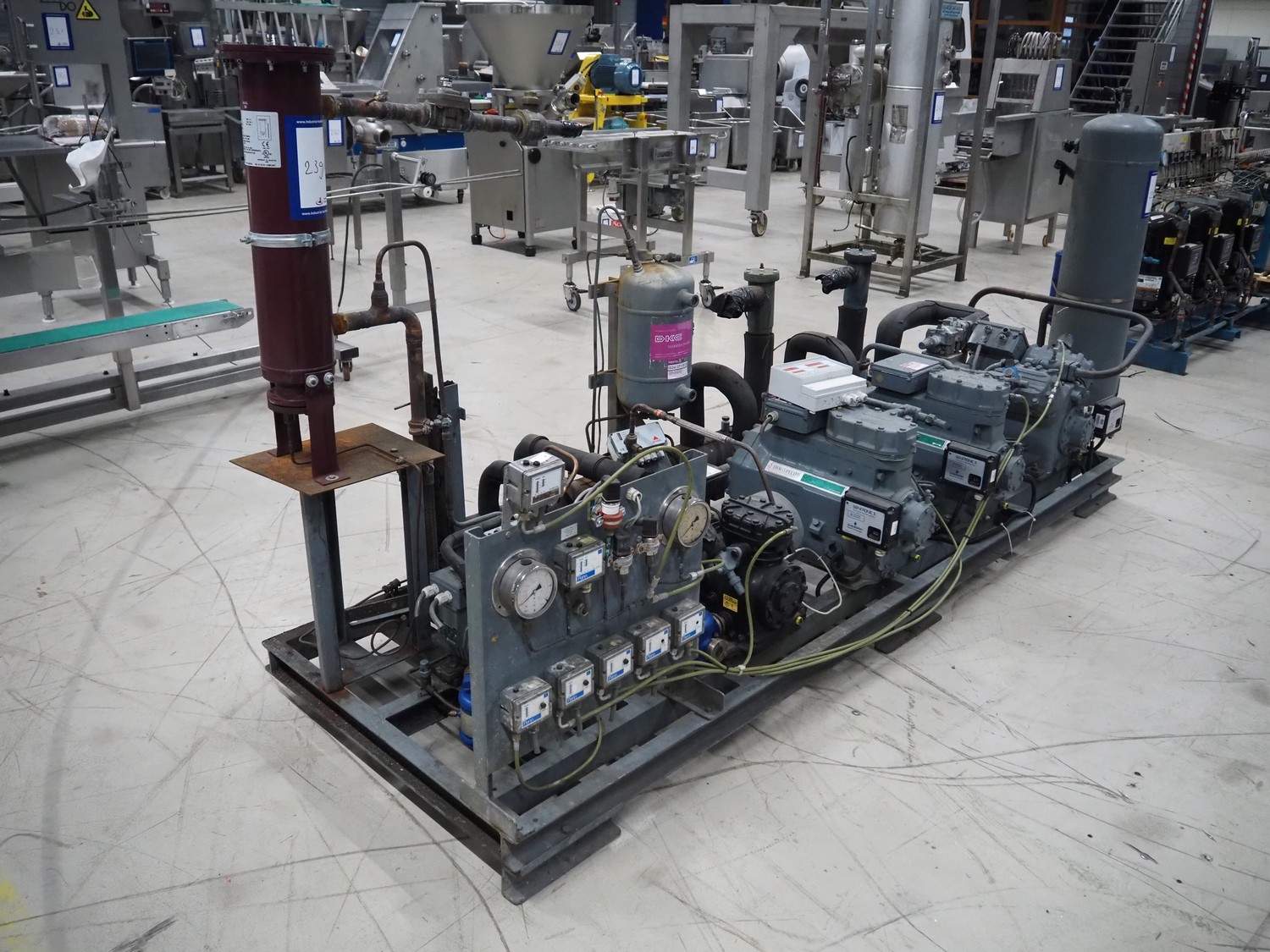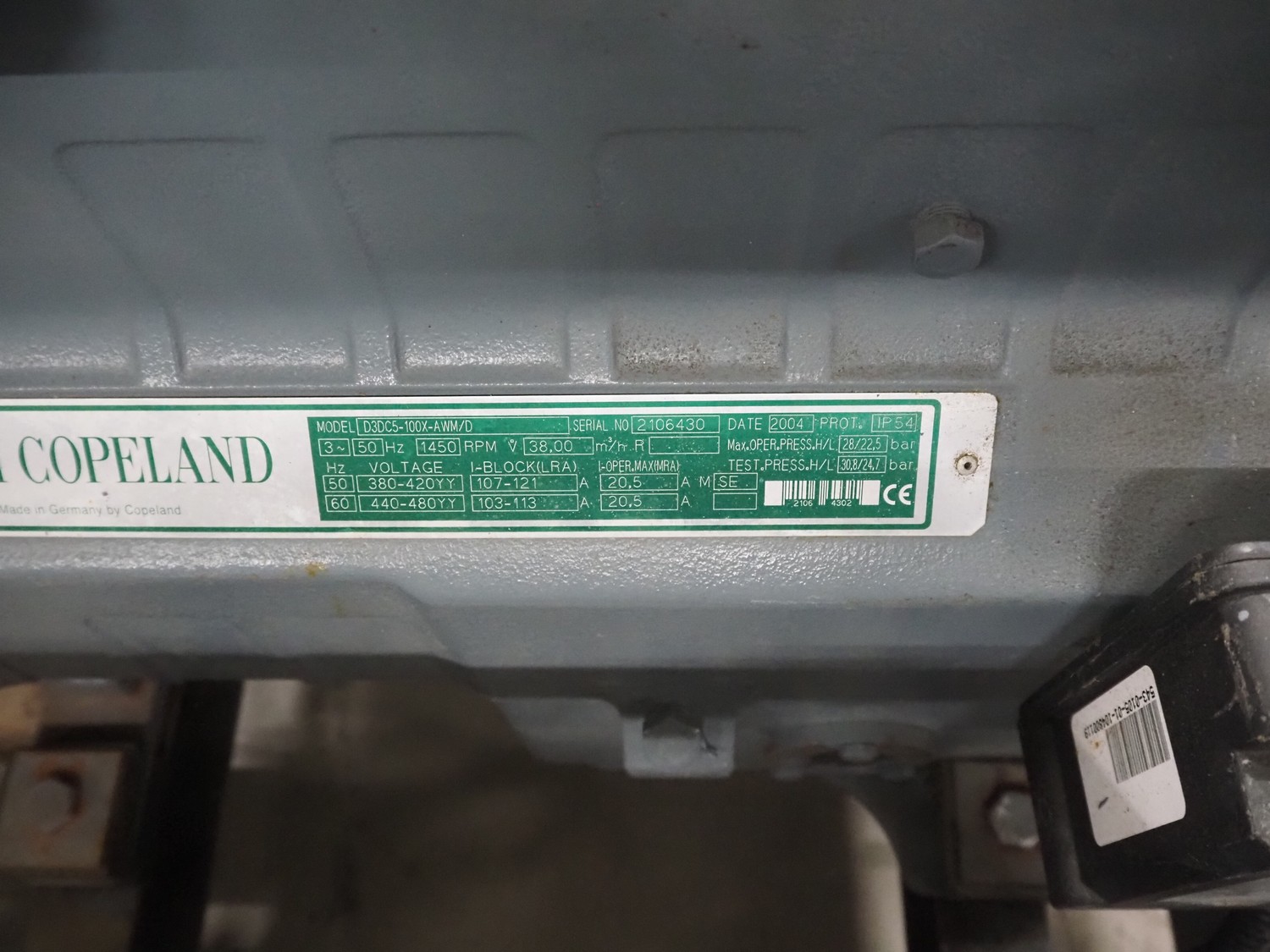 DWM Copeland compressor rack consisting of: 4 DWM Copeland cooling compressor type: (1x) D4DH3-2500-EWM, capacity: 70.9 m³ per hour, (1x) D3DC5-100X-AWM/D, capacity: 38 m³ per hour, (1x) D3DA5-75X-AWM/D, capacity: 32.2 m³ per hour, (1x) DKSJP-15X-EWL, capacity: 6.33 m³ per hour, dimensions compressor rack: 3150 mm x 1100 mm x 1400 mm, dimensions pressure vessel: 480 mm x 480 mm x 1450 mm, dimensions switch cabinet: 1680 mm x 420 mm x 2200 mm.