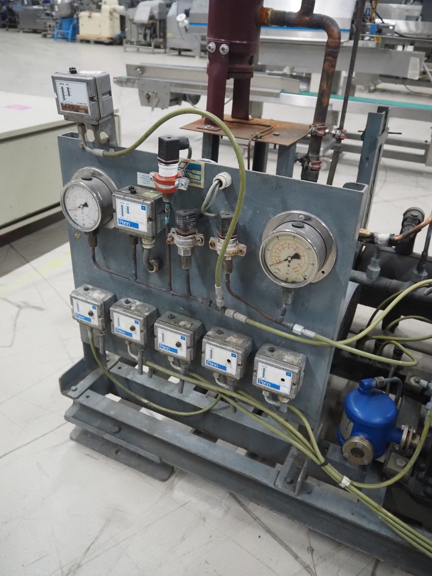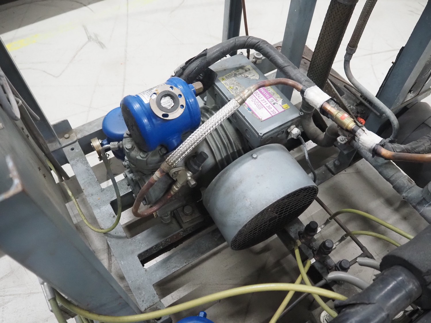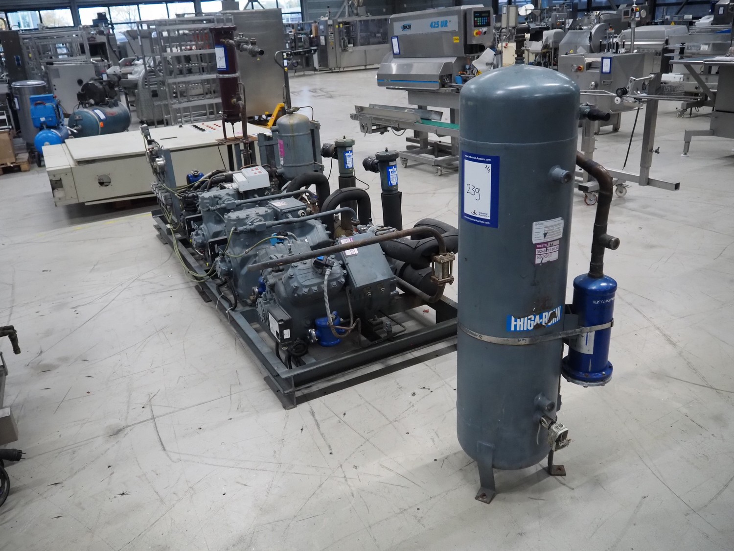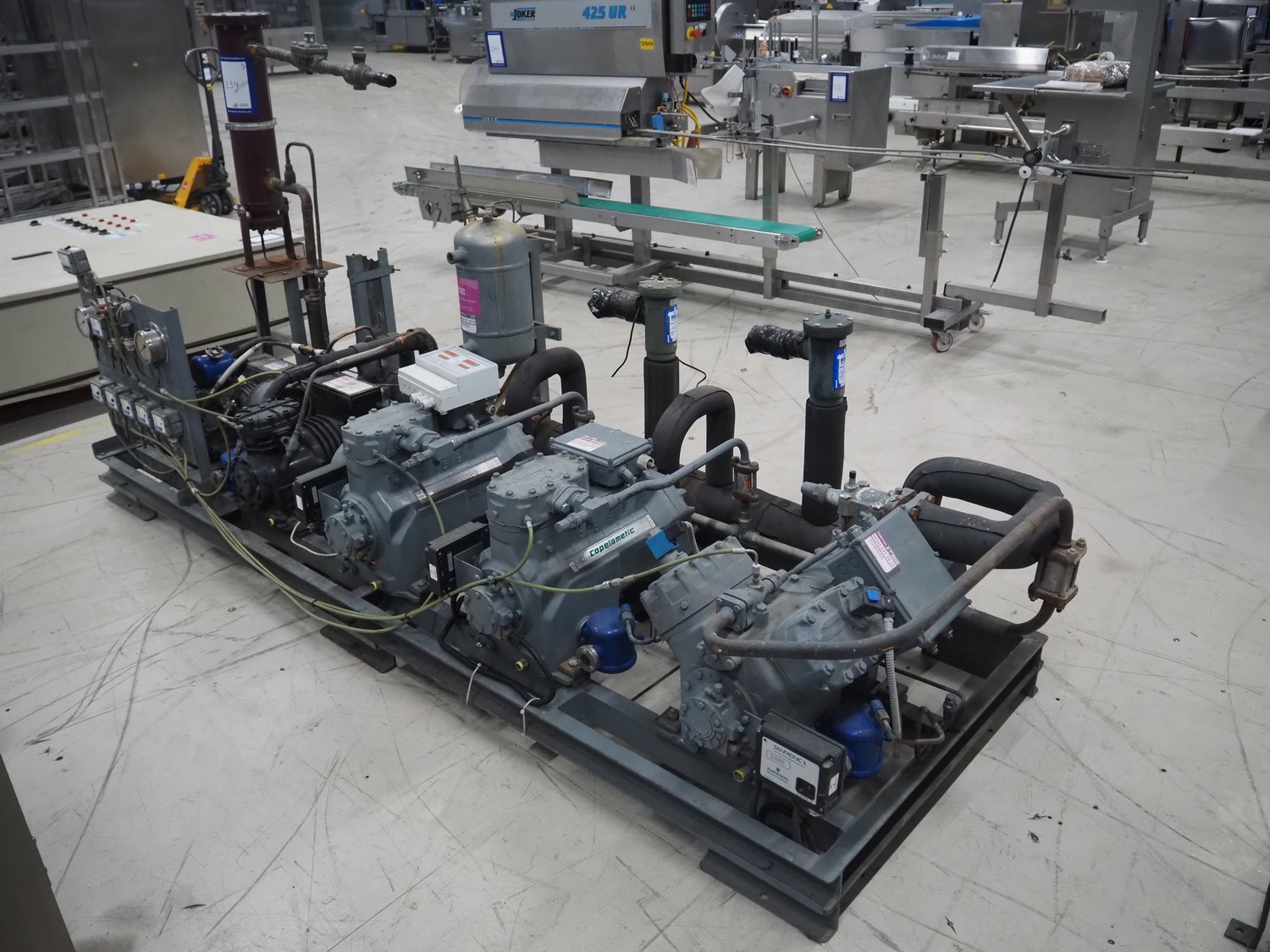DWM Copeland compressor rack consisting of: 4 DWM Copeland cooling compressor type: (1x) D4DH3-2500-EWM, capacity: 70.9 m³ per hour, (1x) D3DC5-100X-AWM/D, capacity: 38 m³ per hour, (1x) D3DA5-75X-AWM/D, capacity: 32.2 m³ per hour, (1x) DKSJP-15X-EWL, capacity: 6.33 m³ per hour, dimensions compressor rack: 3150 mm x 1100 mm x 1400 mm, dimensions pressure vessel: 480 mm x 480 mm x 1450 mm, dimensions switch cabinet: 1680 mm x 420 mm x 2200 mm.