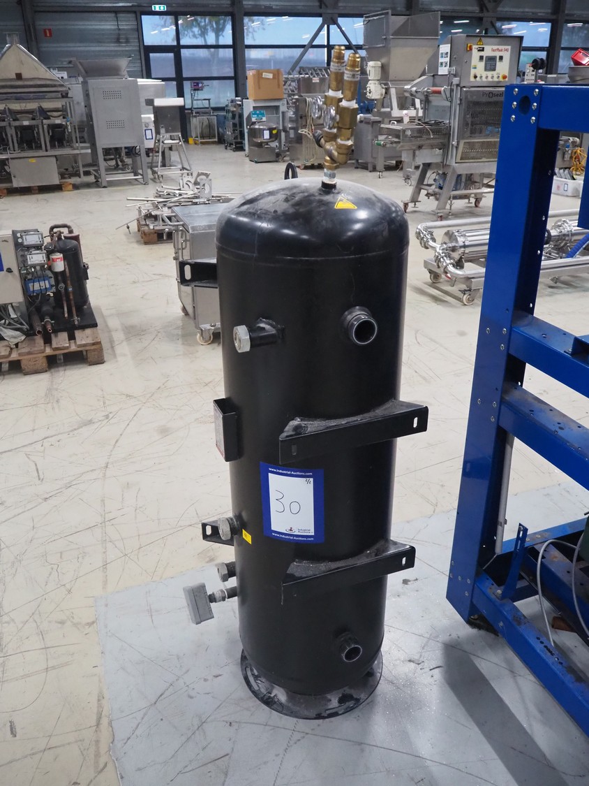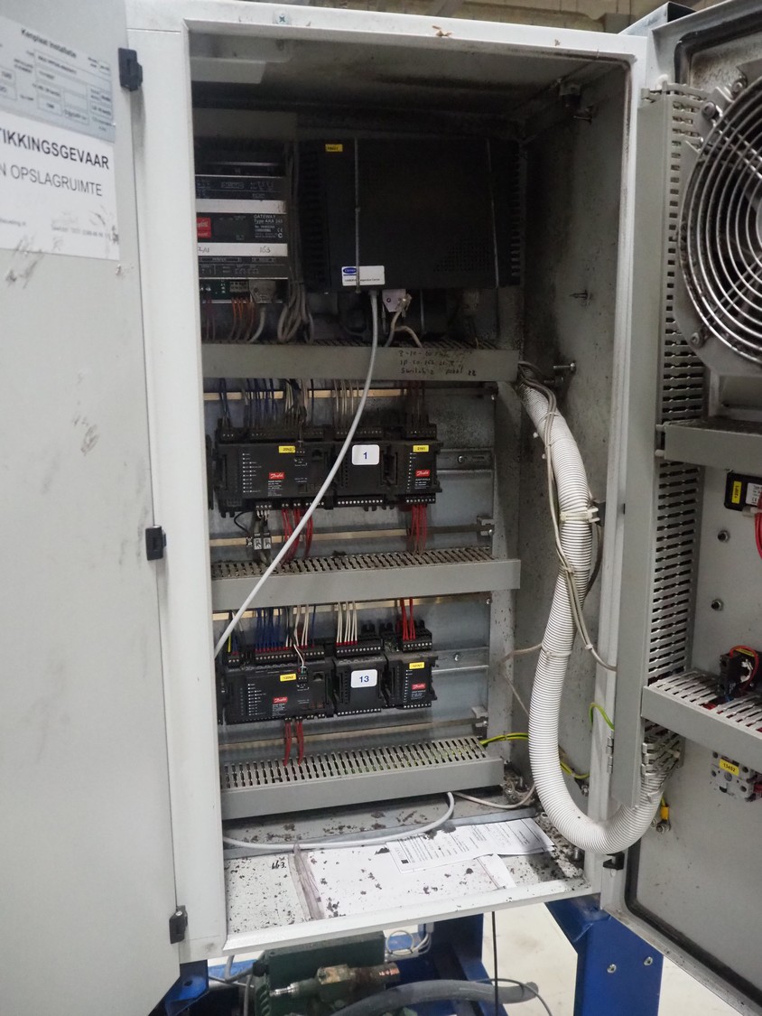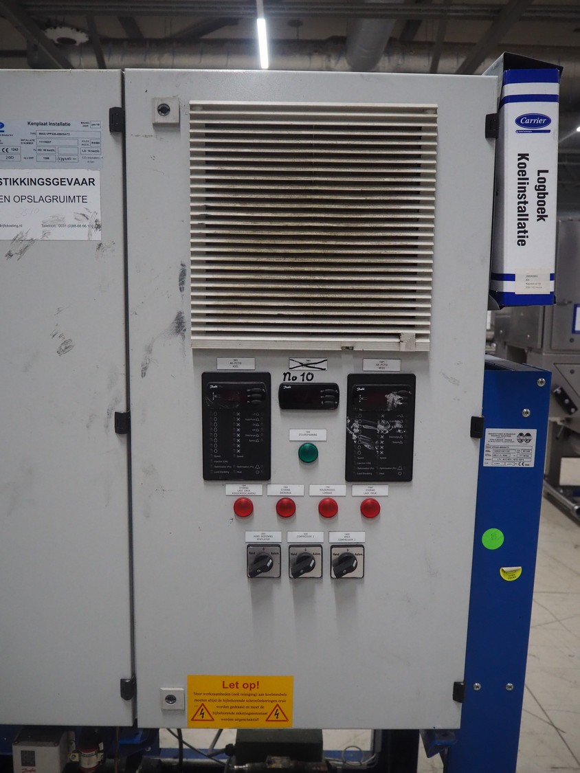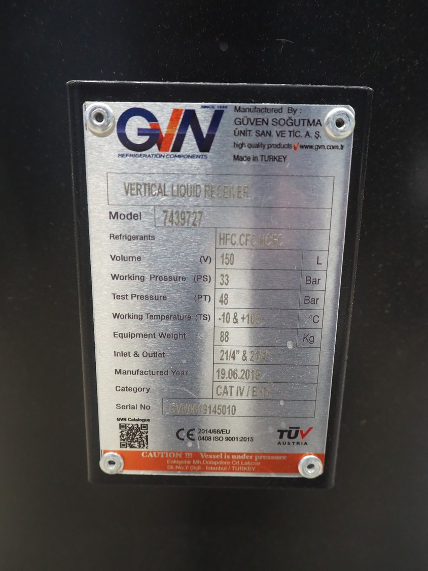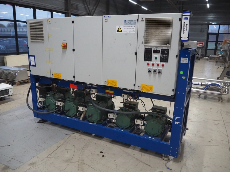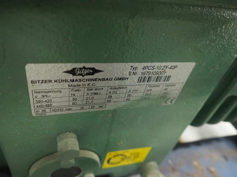 Profoid compressor rack with 5 Bitzer Kühlmaschinenbau GmbH cooling compressors, type: (2x) 4CES-6Y-40S, and (3x) 4PCS-10.2Y-40P, refrigerant: R448A, 200 kg, dimensions: 2750 mm x 900 mm x 1950 mm. With vertical liquid receiver, dimensions: 580 mm x 480 mm x 1580 mm. Technical condition unknown. Copper pipings between compressors already been removed.