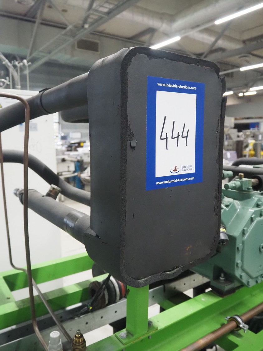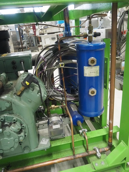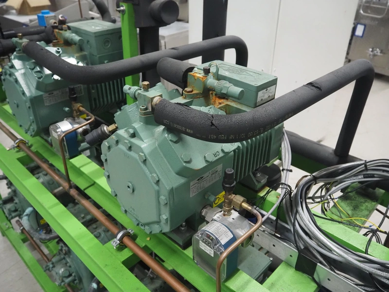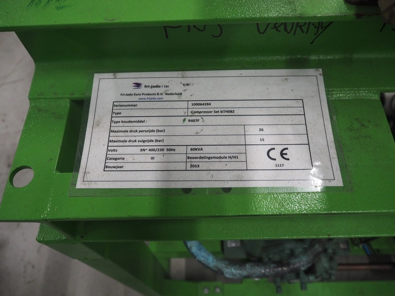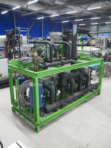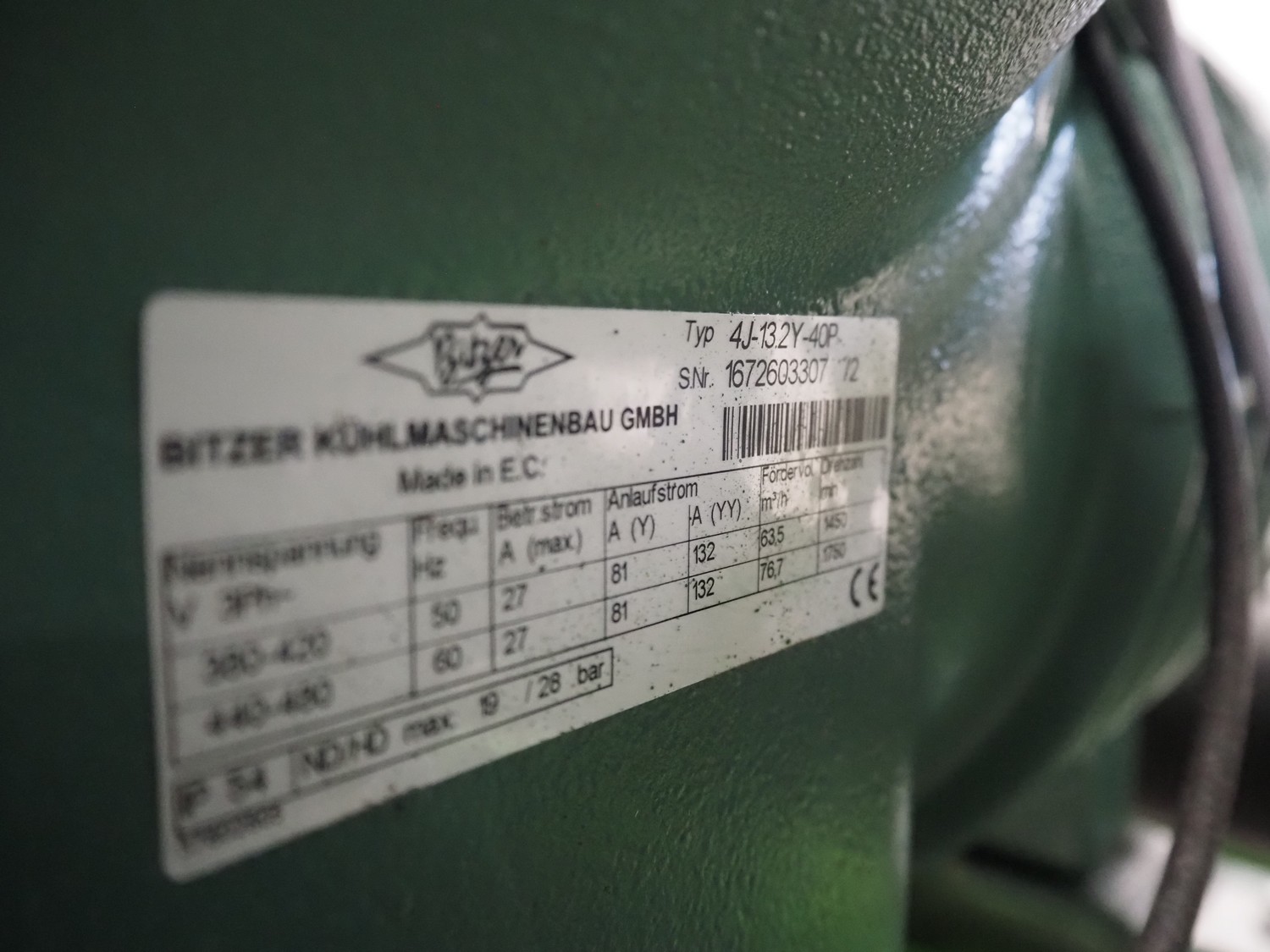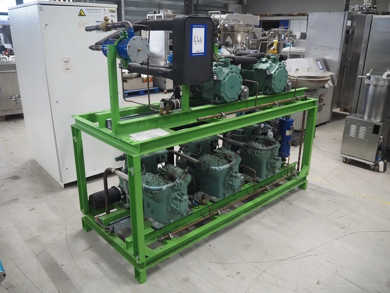 Fri-Jado compressor rack with 5 Bitzer Kühlmaschinenbau GmbH colling compressors, type: 4DC-5.2Y-40S, 4DES-5Y-40S, (2x) 4J-13.2Y-40P, 4G-30.2Y-40P, capacity: (2x) 26.8/32.4, (2x) 63.5/76.7, 84.6/102.1 m³ per hour, dimensions: 2200 mm x 910 mm x 1730 mm.