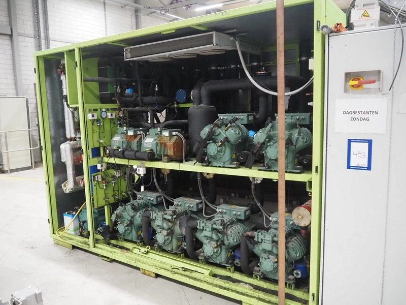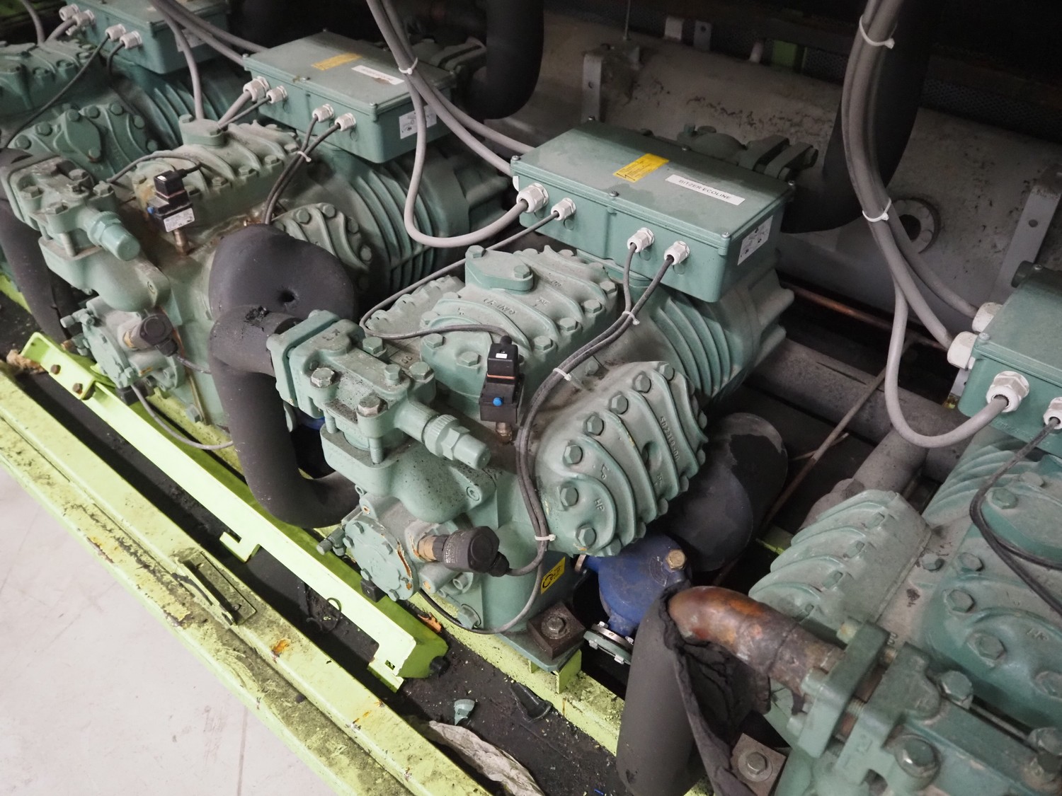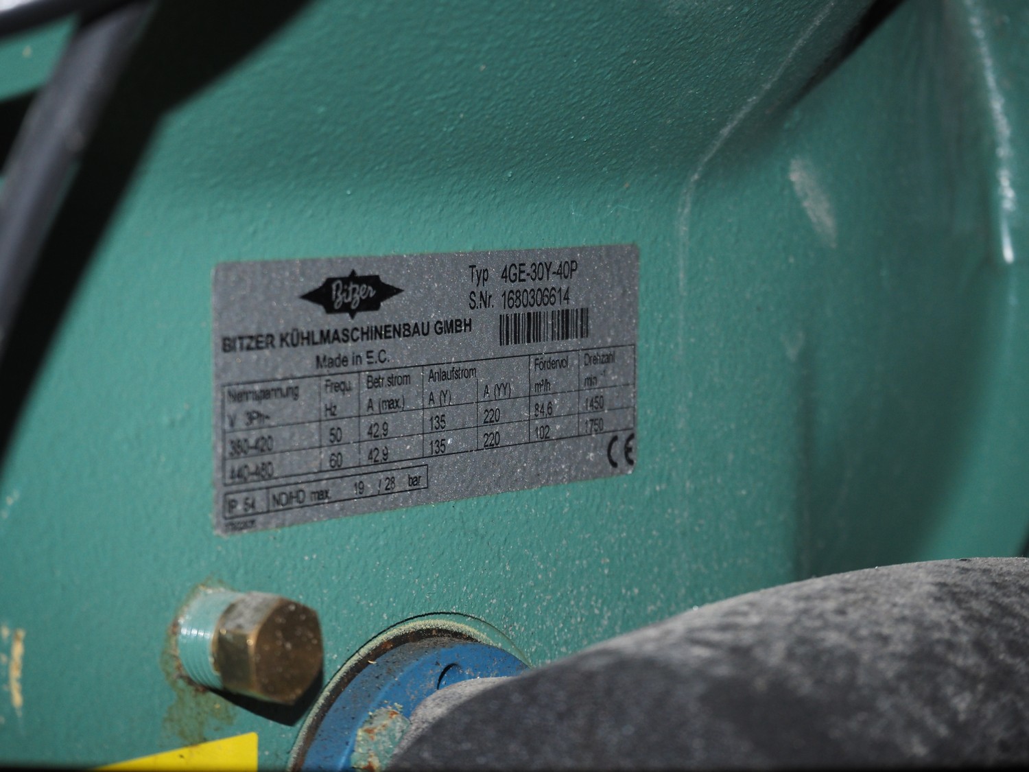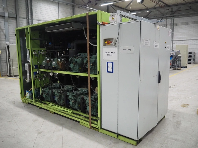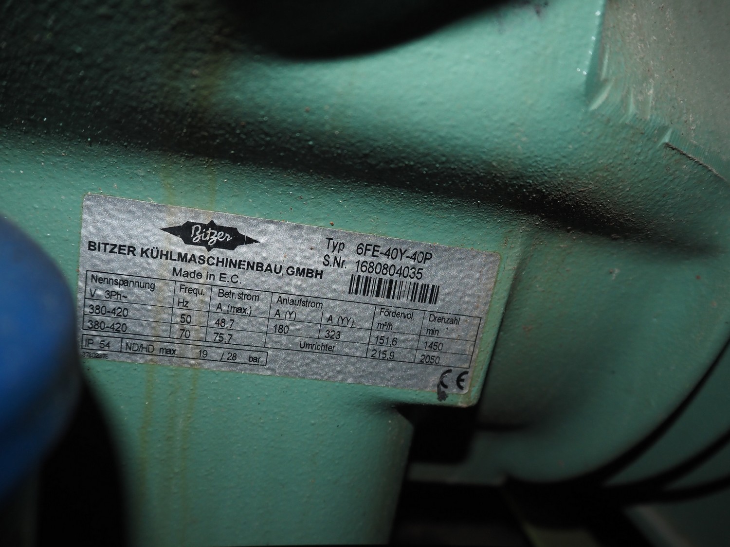 Bitzer Kühlmaschinenbau GmbH compressor rack in noiseless cabinet with 8 Bitzer Kühlmaschinenbau GmbH and 1 Green Poin compressors, type: (3x) 6FE-40Y-40P, 6GE-30Y-40P, 6JE-33Y-40P, 4GE-30Y-40P, (2x) 2DSL-5K-40S and 4PES-15-40P, dimensions: 4100 mm x 1650 mm x 2400 mm. Missing some panels.