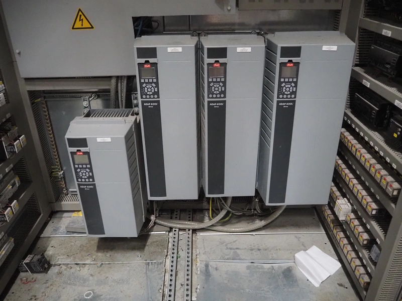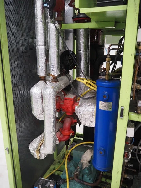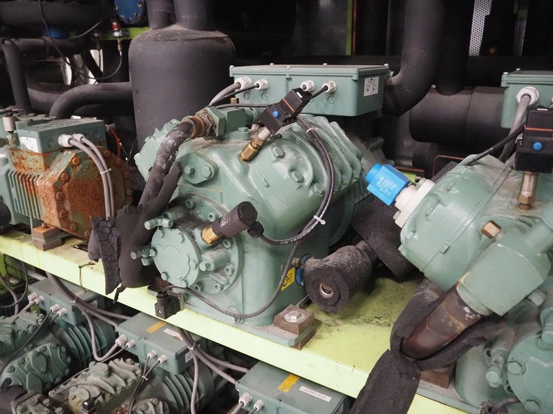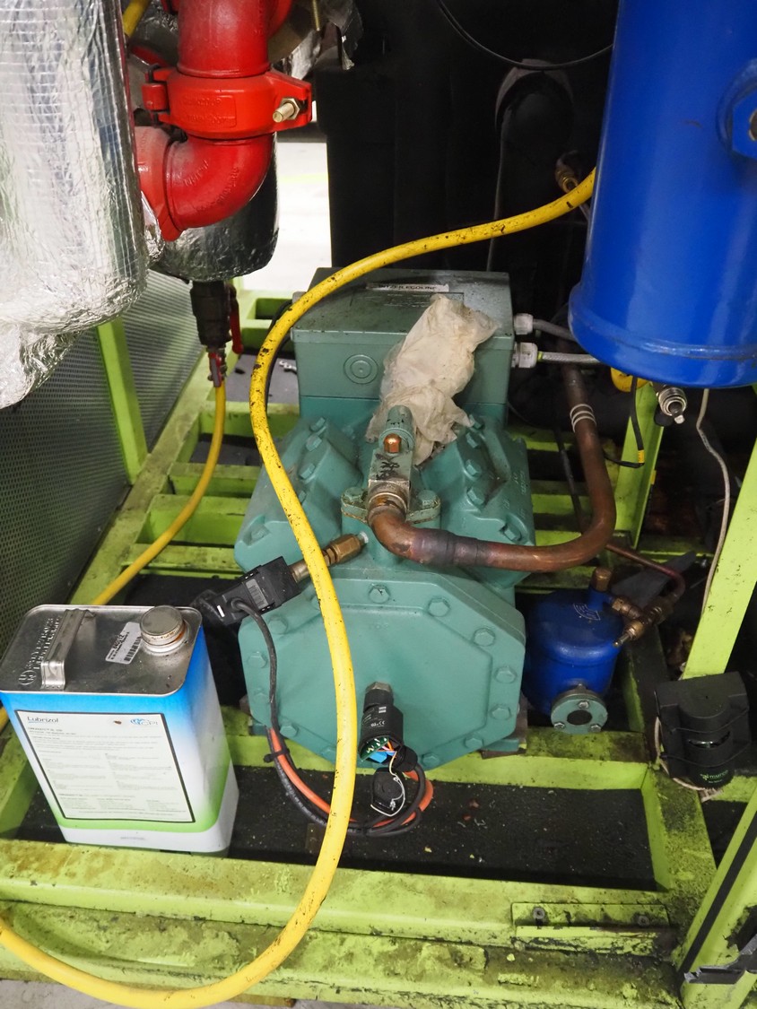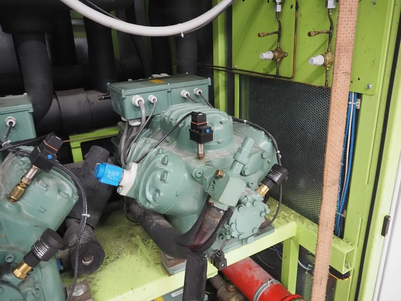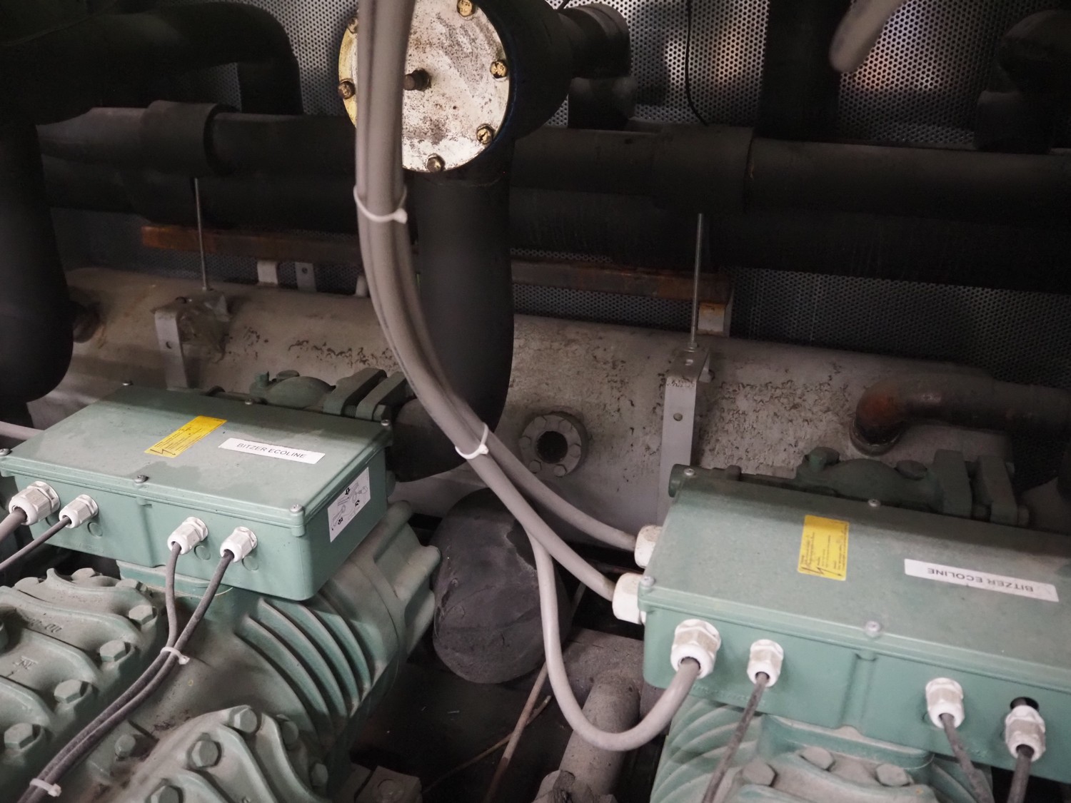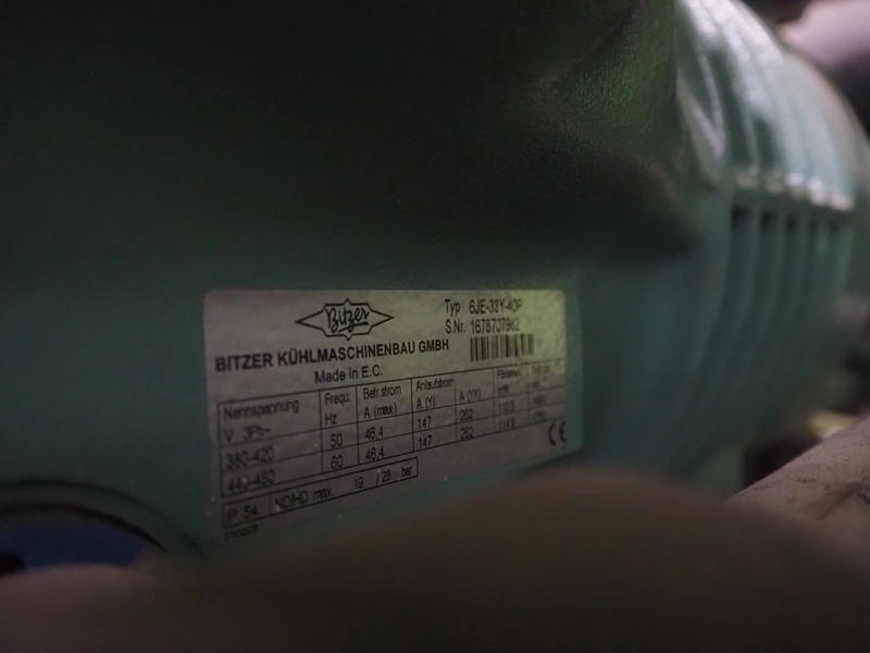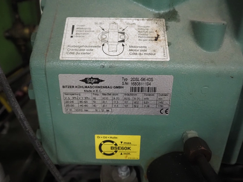 Bitzer Kühlmaschinenbau GmbH compressor rack in noiseless cabinet with 8 Bitzer Kühlmaschinenbau GmbH and 1 Green Poin compressors, type: (3x) 6FE-40Y-40P, 6GE-30Y-40P, 6JE-33Y-40P, 4GE-30Y-40P, (2x) 2DSL-5K-40S and 4PES-15-40P, dimensions: 4100 mm x 1650 mm x 2400 mm. Missing some panels.