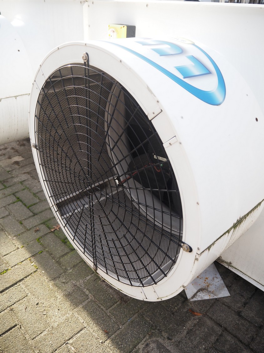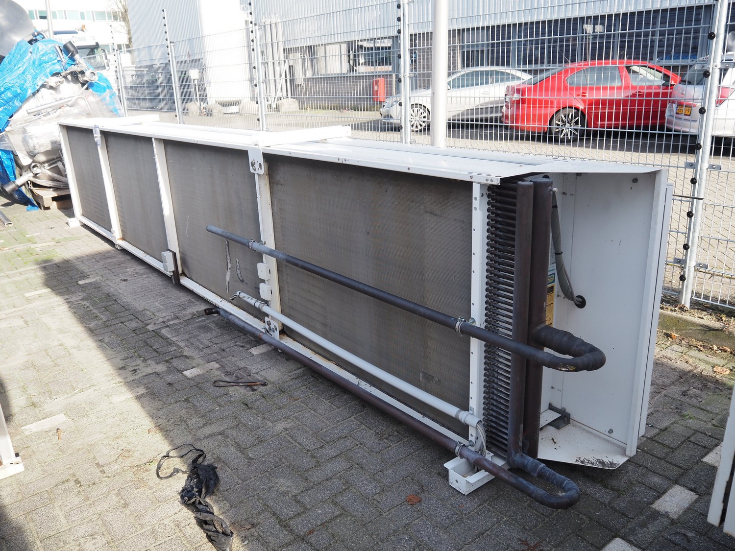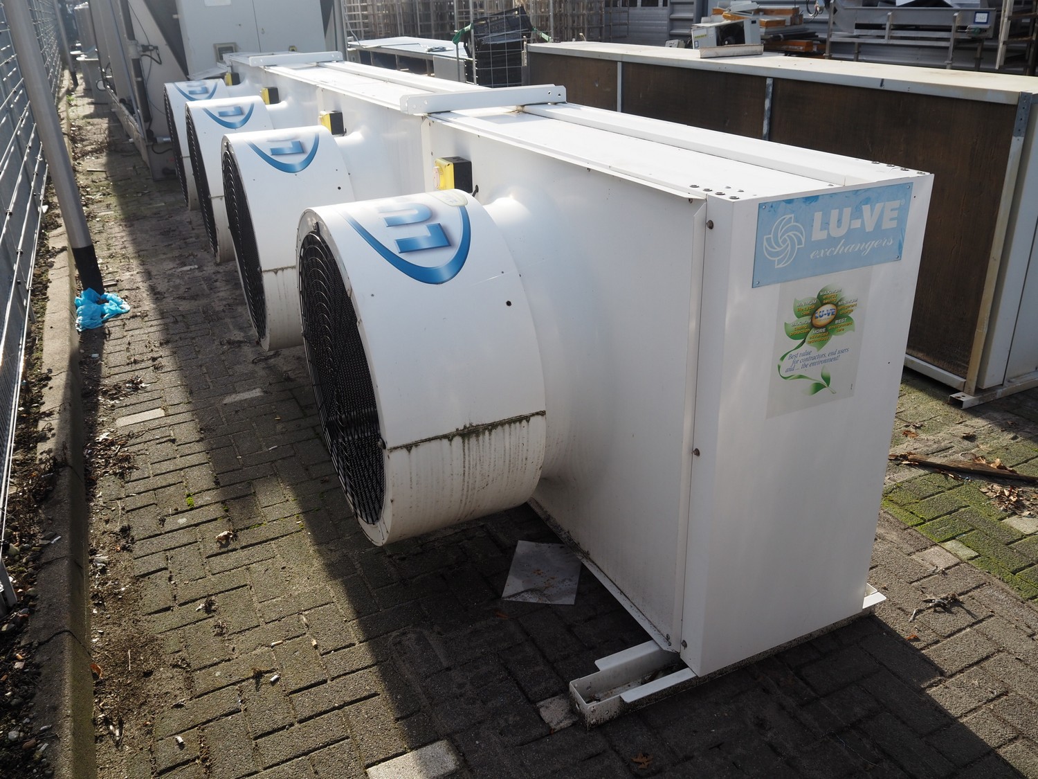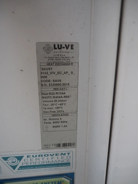 LU-VE S.p.A. condenser, model: SAV8T, serial number: 5335890, year of construction: 2019, 400 V, 50 Hz, 1.4 A, 840 W, refrigerant: R22-R134a-R407C-R404A-R507, volume: 86 dm³, 4 fans, dimensions: 6930 mm x 1350 mm x 1200 mm.