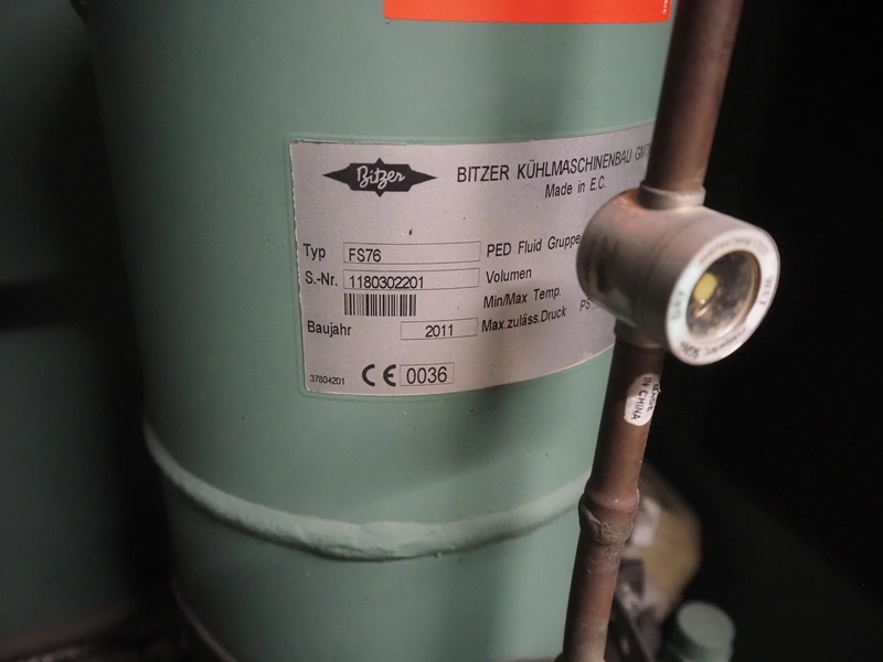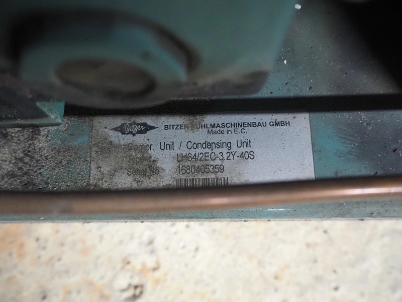 Bitzer Kühlmaschinenbau GmbH condensing unit with cooling compressor, compressor type: 2EC-3.2Y-40S, serial number: 1680402324, capacity: 11.4/13.7 m³ per hour, dimensions: 700 mm x 980 mm x 920 mm.