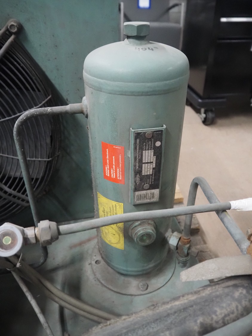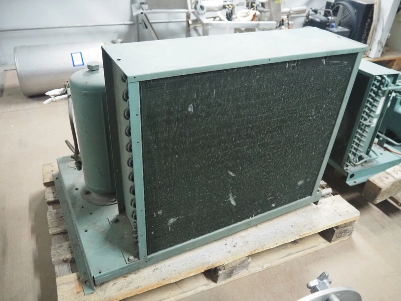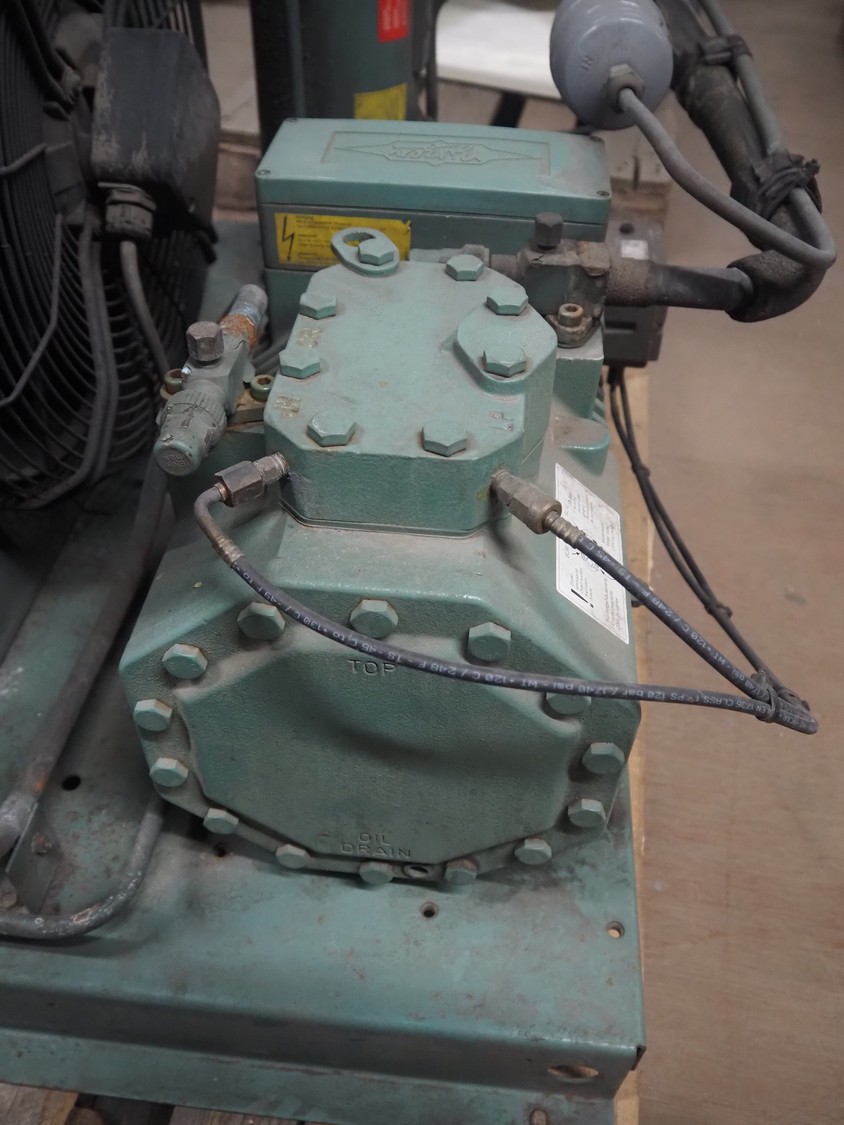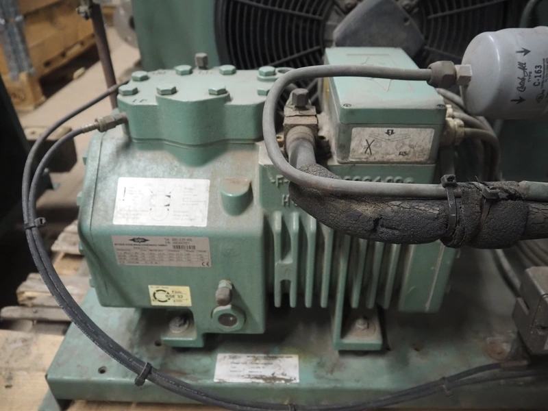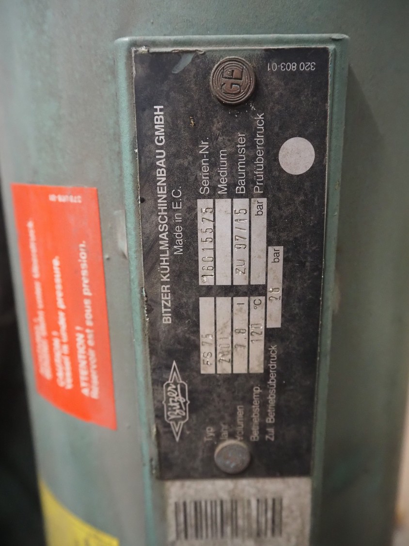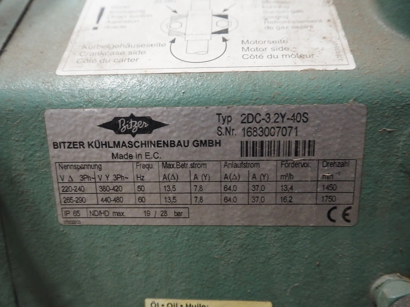 Bitzer Kühlmaschinenbau GmbH condensing unit with cooling compressor, type: LH64/FS 75, serial number: 66023205, type cooling compressor: 2DC-3.2Y-40S, serial number: 1683007071, capacity: 13.4/16.2 m³ per hour, dimensions: 750 mm x 700 mm x 560 mm.