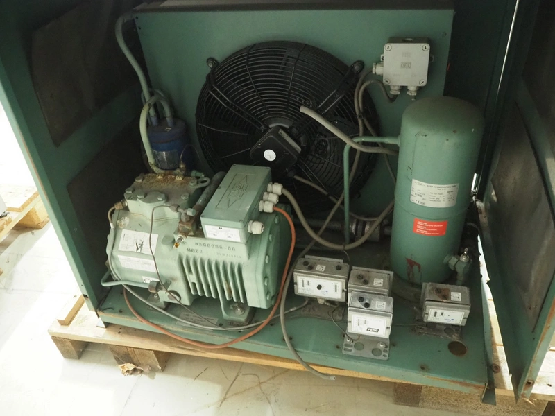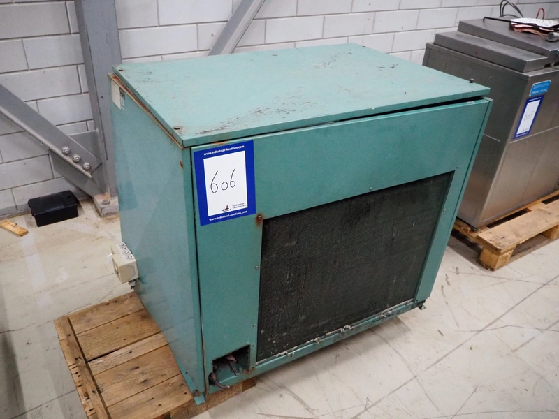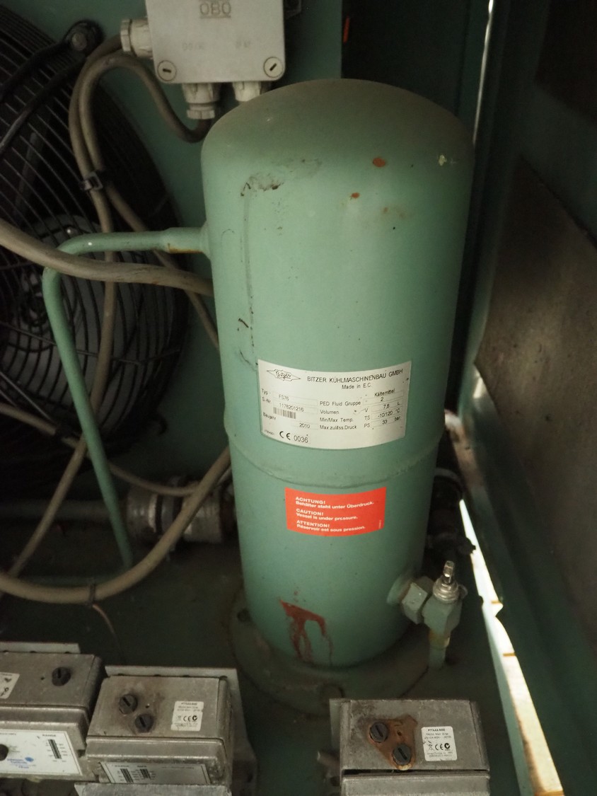 Bitzer Kühlmaschinenbau GmbH condensing unit with cooling compressor, type condensing unit: FS76, serial number: 1678310039, type cooling compressor: 2CC-3.2Y-40S, serial number: 1677012201, capacity: 16.2/19.6 m³ per hour, dimensions: 670 mm x 940 mm x 920 mm.