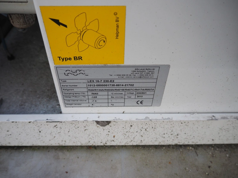 Alfa Laval evaporator, type: LEX 16-7 230-E2, serial number: 1012-0500001735-8814-21702, year of construction: 2010, machine weight: (empty) 61 kg, 230 V, 1 Ph, 50 Hz, 1 fan, volume: 4 liter, dimensions: 1100 mm x 780 mm x 700 mm.