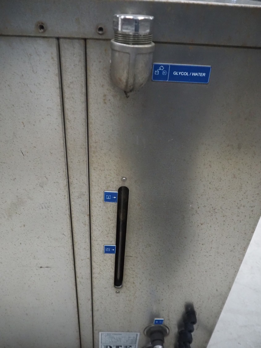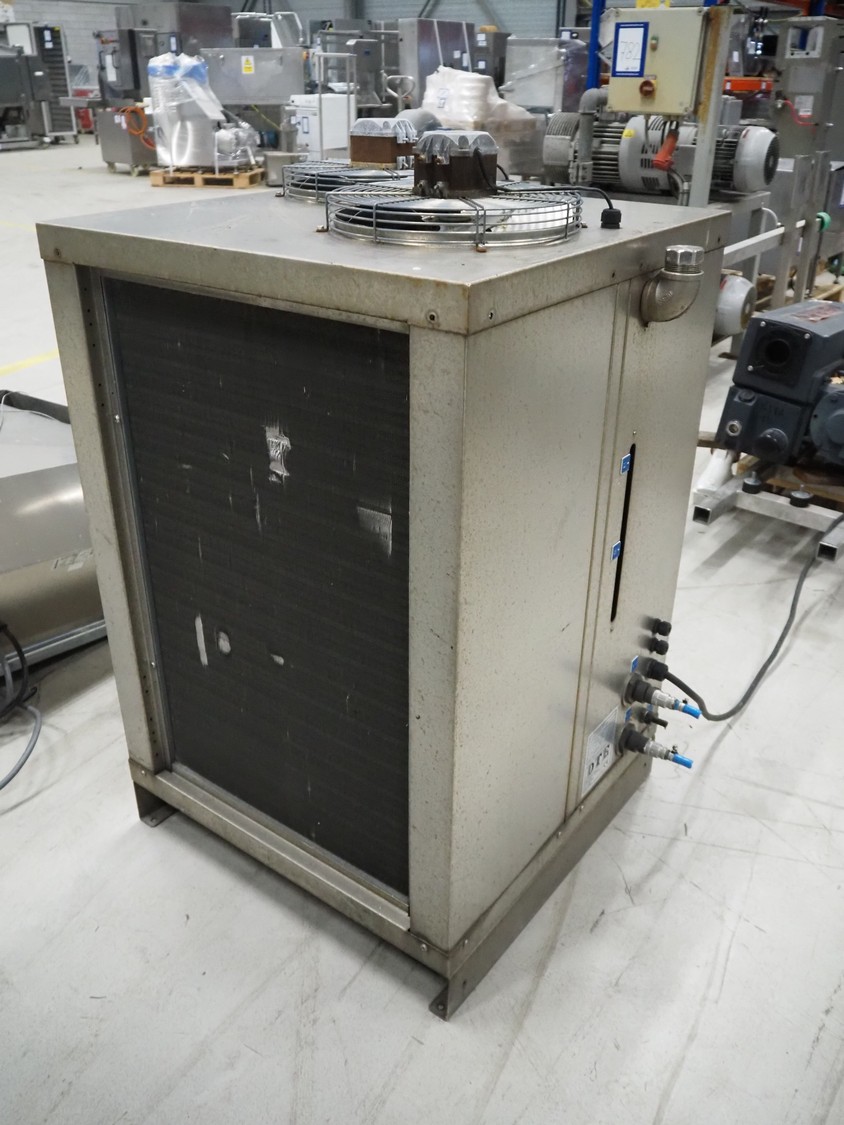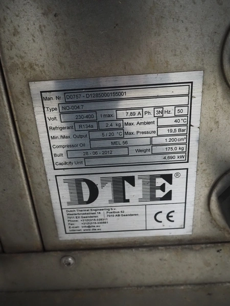 DTE water chiller, type: NO-004.7, manufacturing number: D0757-D1285000155001, year of construction: 28-06-2012, 230-400 V, 3 Ph, 50 Hz, 7.89 A ,refrigerant: R134a, 2.4 kg, dimensions: 830 mm x 800 mm x 1220 mm.