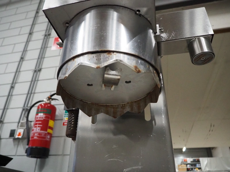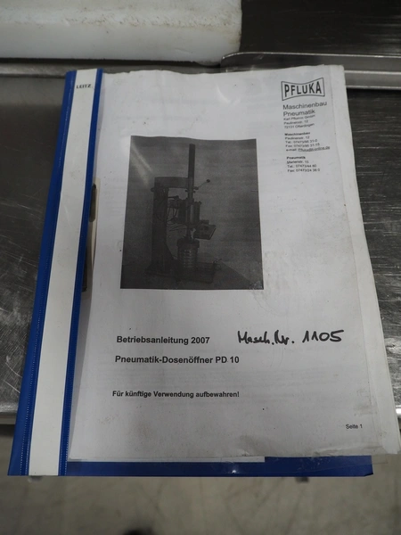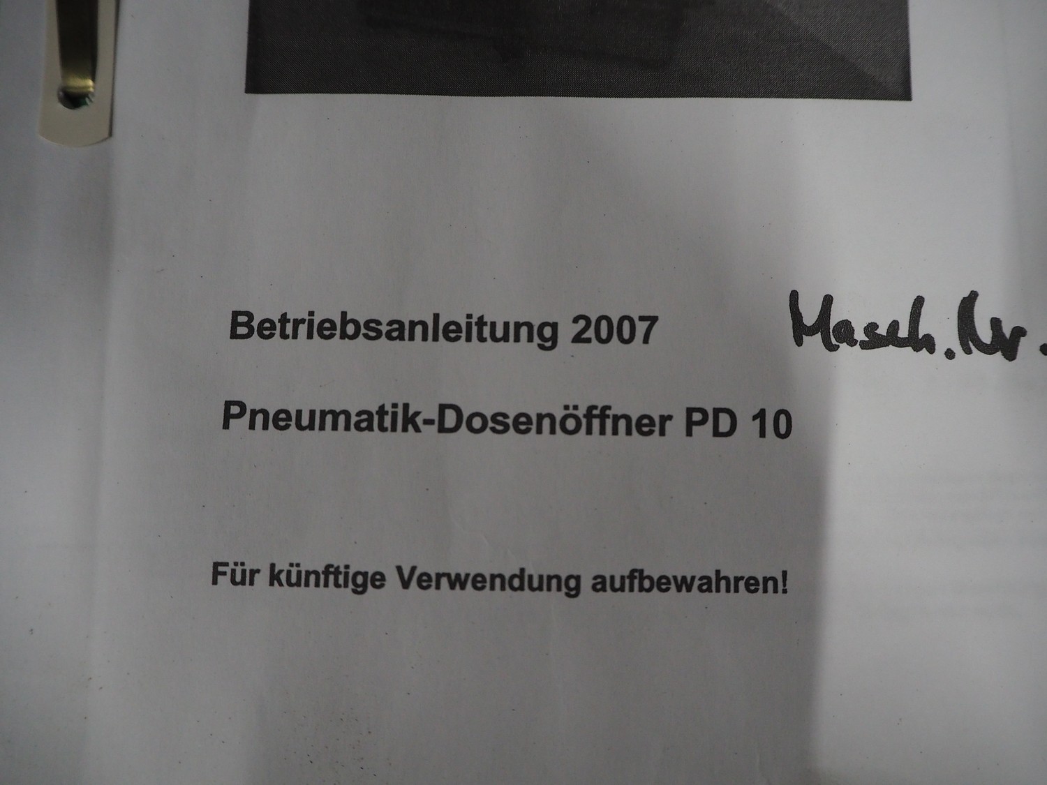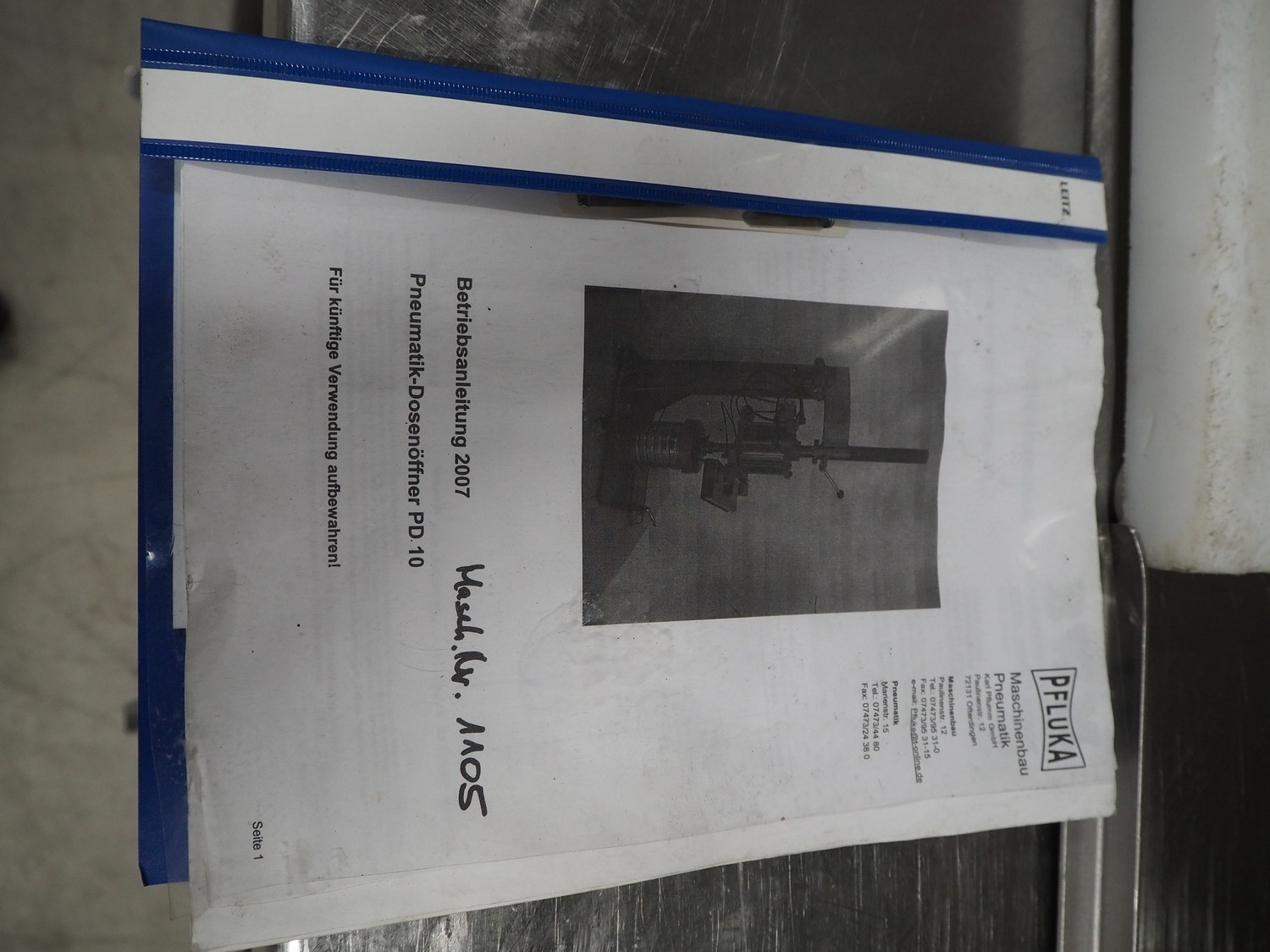 Pfluka can opener, model: PD 10, machine number: 1105, working width: Ø 220 mm, total dimensions: 900 mm x 700 mm x 1800 mm.