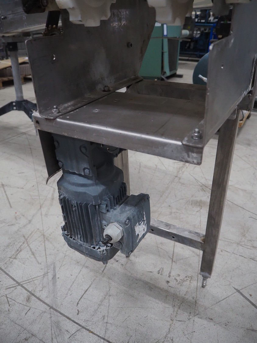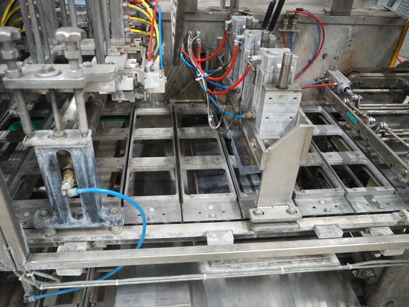 O.G. Hoyer A/S tray filling line, consisting of: Tray denester, plastic belts, belt width: (6x) 30 mm, 3 lanes, lane width: (3x) 150 mm, clearance: (3x) 145 mm x 145 mm, total dimensions: 1940 mm x 770 mm x 1830 mm. O.G. Hoyer A/S tray filler, type: CC2, number: 2502-1903, year of construction: 07-1987, 380 V, 3 Ph, 50 Hz, 10 kW, dimensions dye: (3x) 145 mm x 145 mm, total dimensions: 5550 mm x 1360 mm x 2600 mm. Transport belt, s/s frame, belt width: 140 mm, total dimensions: 4000 mm x 500 mm x 1050 mm. Curve conveyor, s/s frame, bel width: 140 mm, total dimensions: 2250 mm x 1700 mm x 1300 mm. 3 s/s trolleys with parts and dye's, dimensions dye: (3x) 180 mm x 120 mm, total dimensions: 1930 mm x 1000 mm x 1200 mm, 1000 mm x 760 mm x 1120 mm and 1350 mm x 730 mm x 1960 mm. 2 pallets with plastic belts, belt width: 140 mm, total dimensions: 1200 mm x 800 mm x 520 mm and 1200 mm x 800 mm x 380 mm.