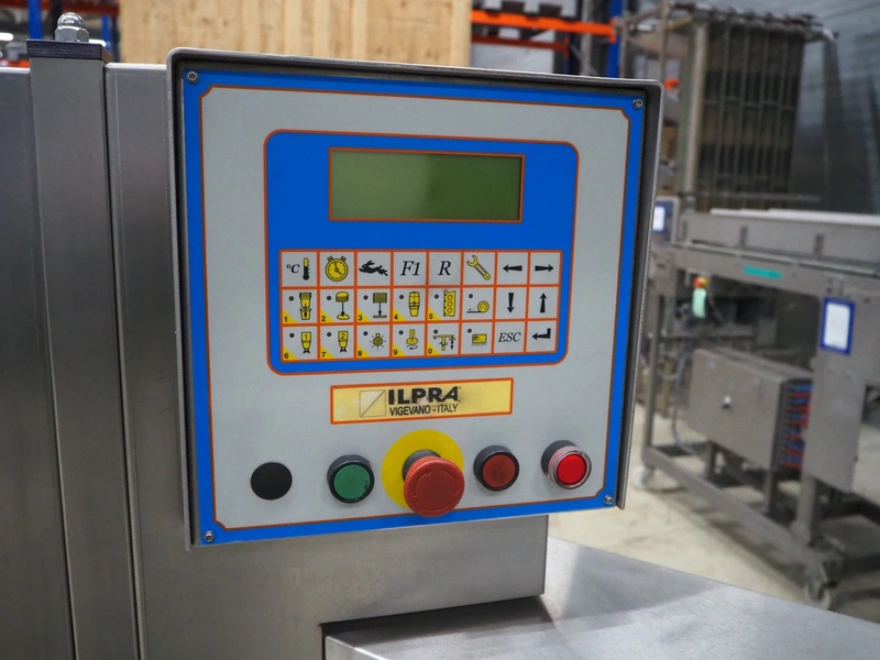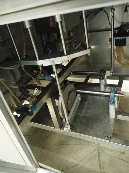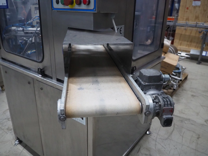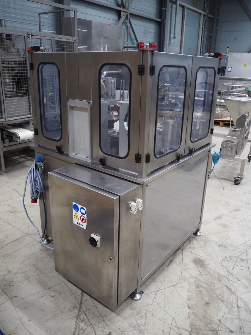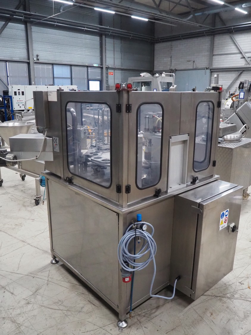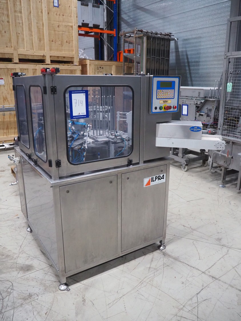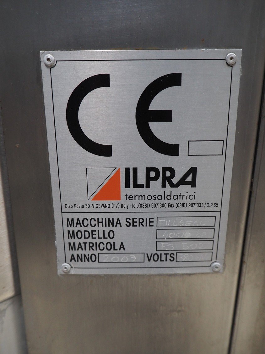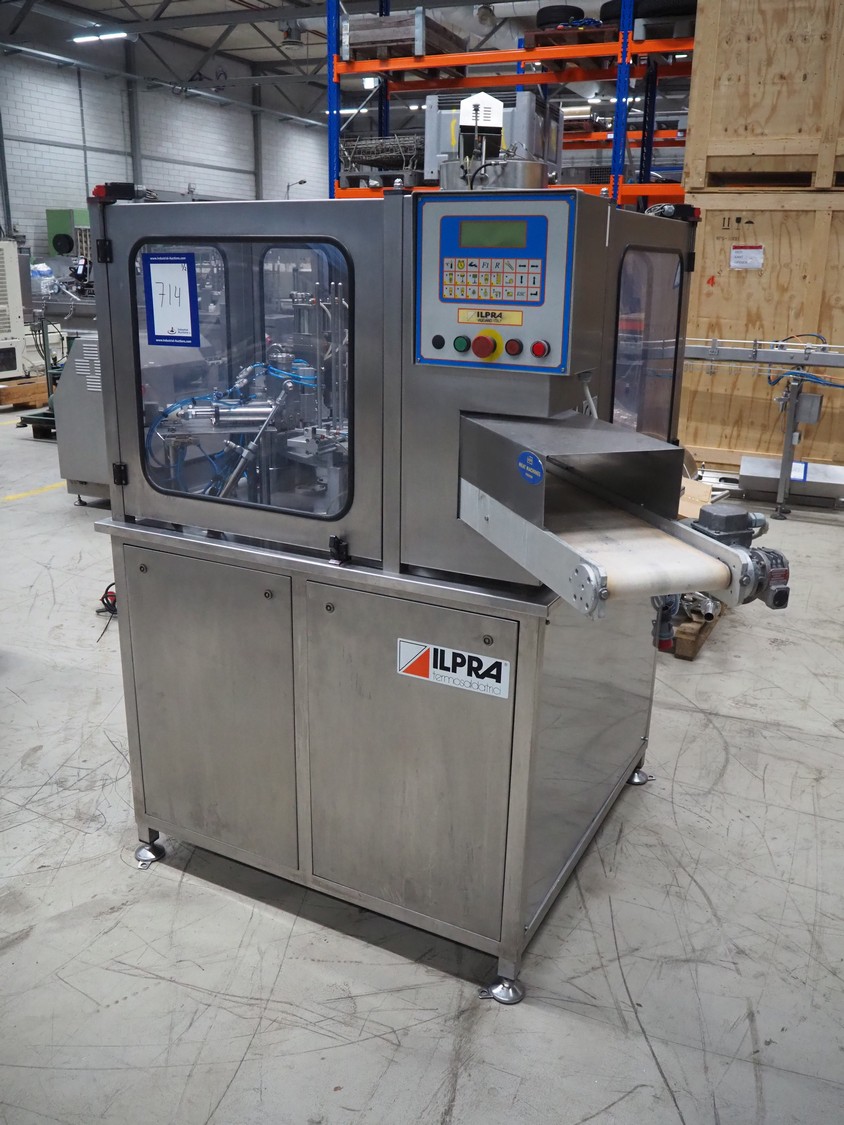 Ilpra cup filling and sealing machine, model: 4000 cip, number: FS 502, year of construction: 2003, 380 V, cup diameter: 70 mm, plastic belt, belt width: 210 mm, total dimensions: 1800 mm x 1600 mm x 1700 mm. Including s/s tank, dimensions: 1100 mm x 500 mm x 600, and pallet with s/s pipes, dimensions: 2700 mm x 1100 mm x 450 mm.