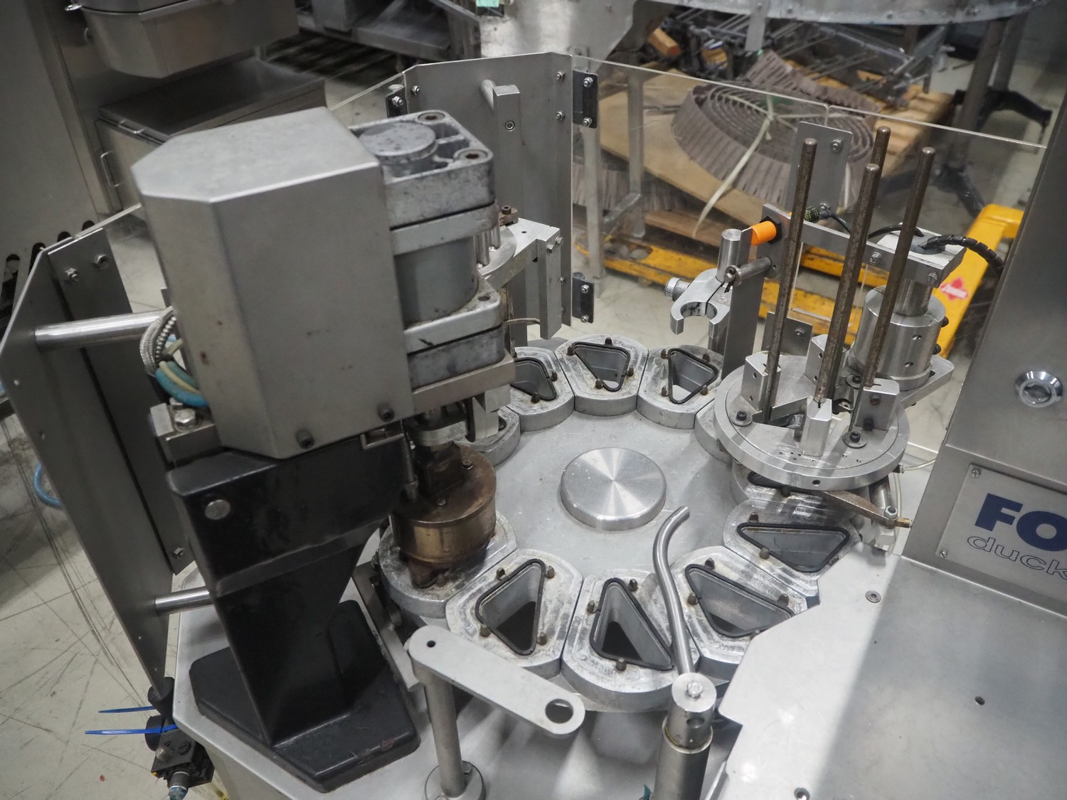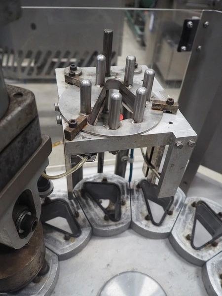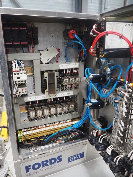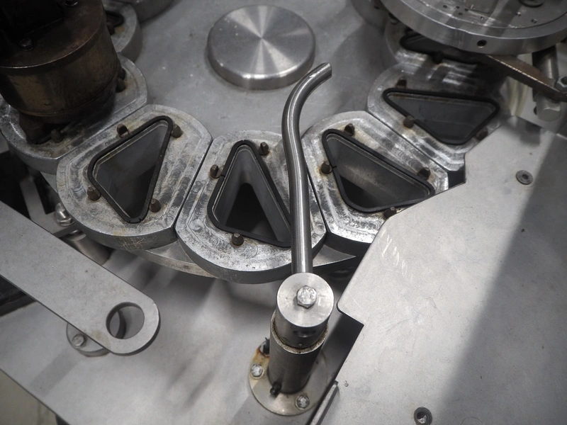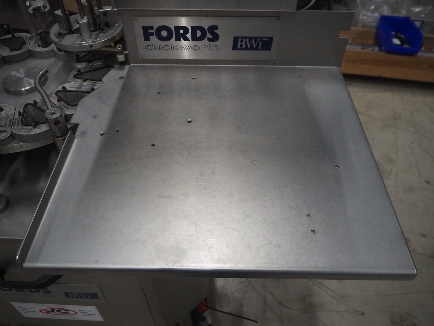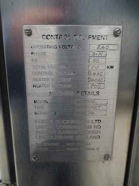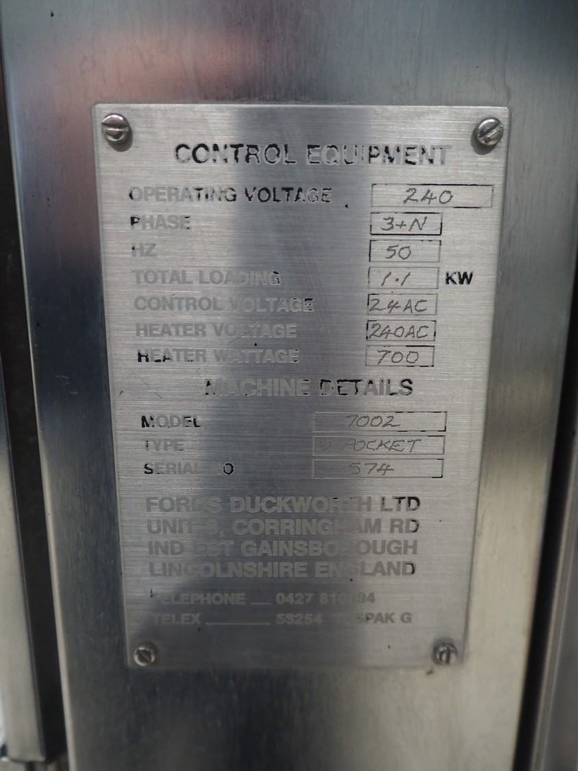 Fords Duckworth pocket filling and sealing machine, model: 1002, serial number: 574, 240 V, 3 Ph, 50 Hz, 1.1 kW, dimensions dye: 90 mm x 40 mm, total dimensions: 1150 mm x 900 mm x 1750 mm.