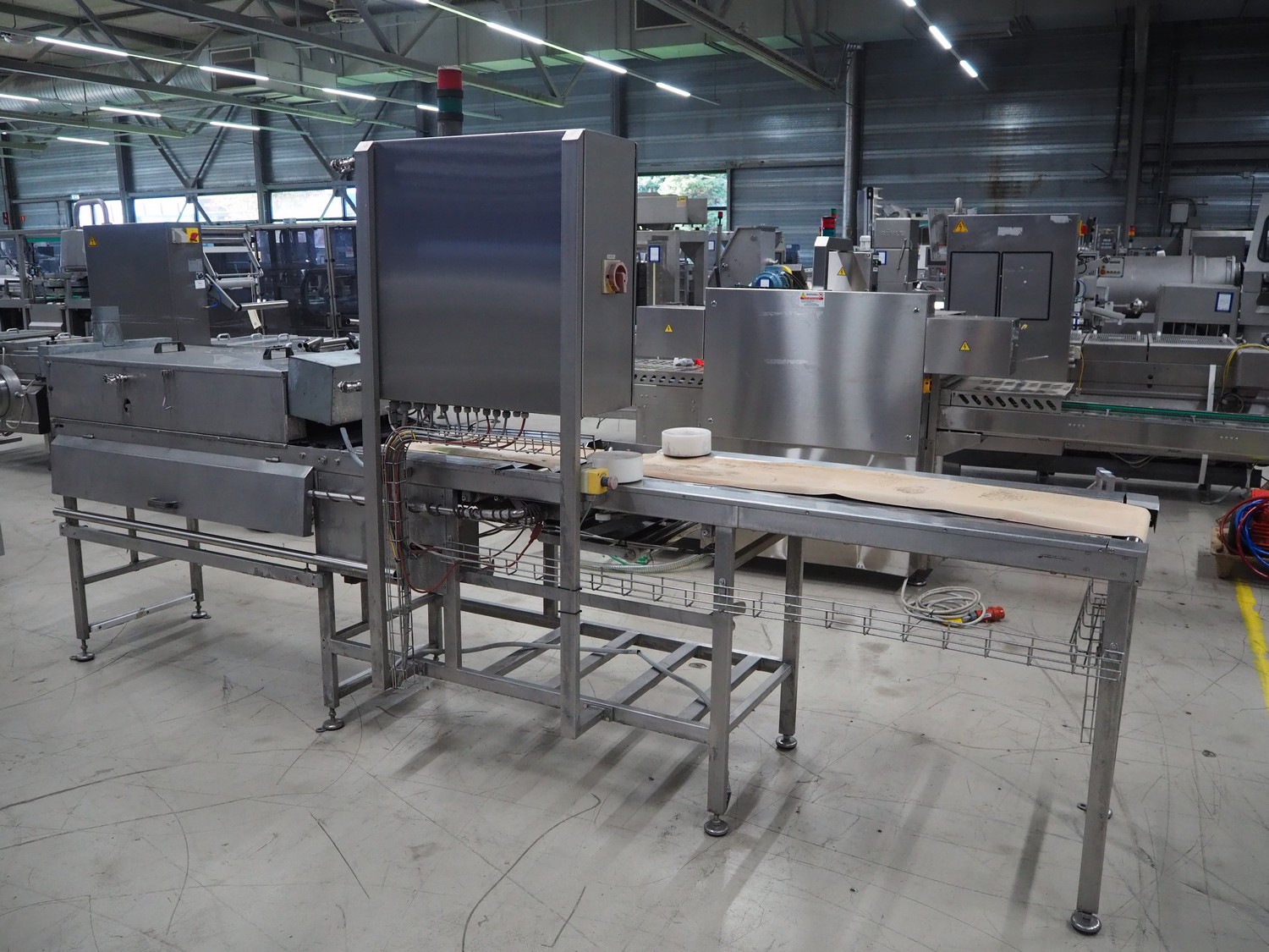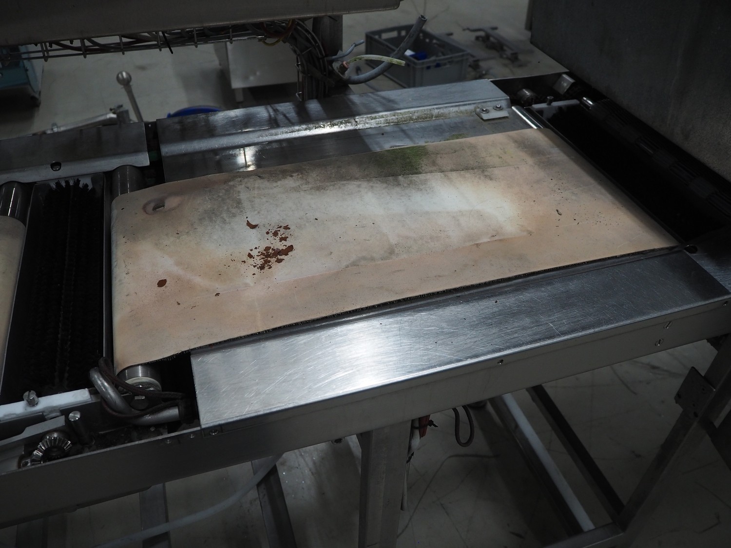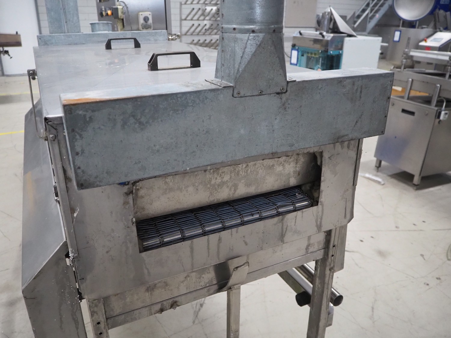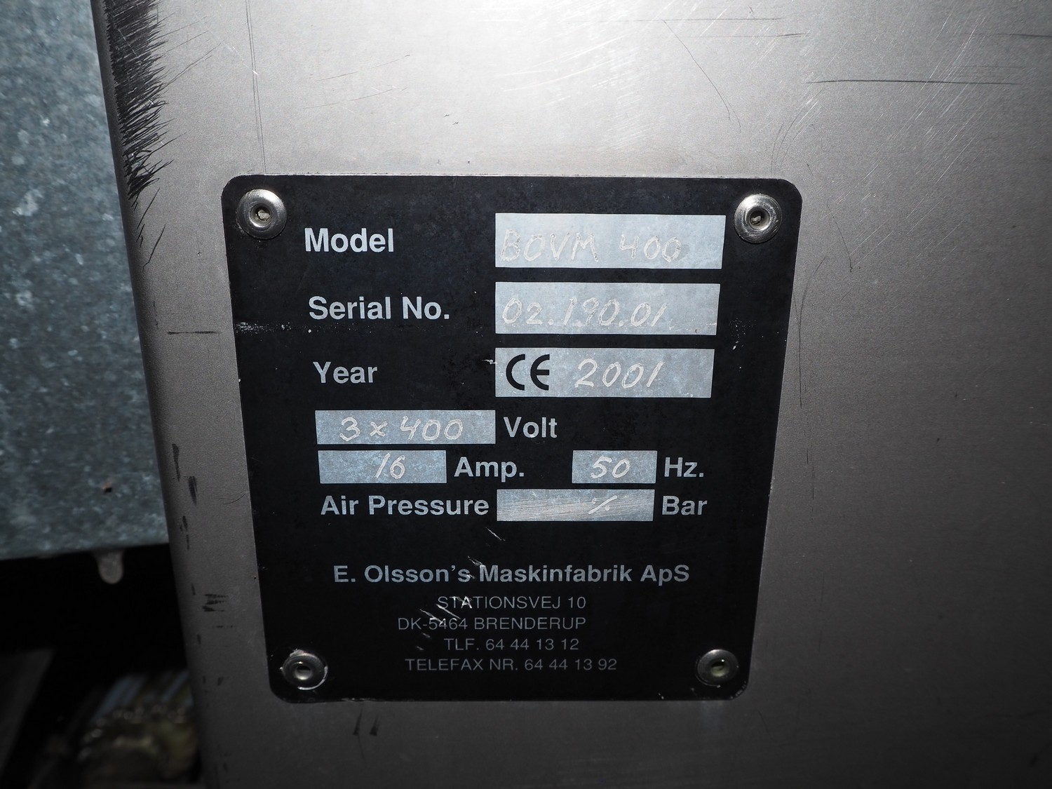E. Olsson's Maskinfabrik ApS paraffine tunnel, model: BOVM 400, serial number: 02.190.01, year of construction: 2001, 400 V, 3 Ph, 50 Hz, 16 A, clothed infeed belt, belt width: 350 mm, brush length: 400 mm, s/s mesh belt, belt width: 410 mm, clearance: 400 mm x 30 mm, total dimensions: 4100 mm x 950 mm x 2200 mm.