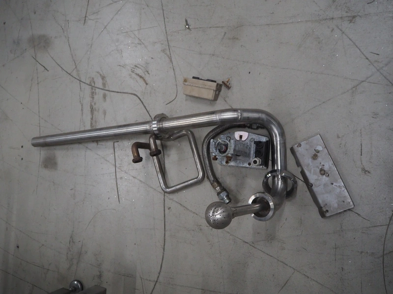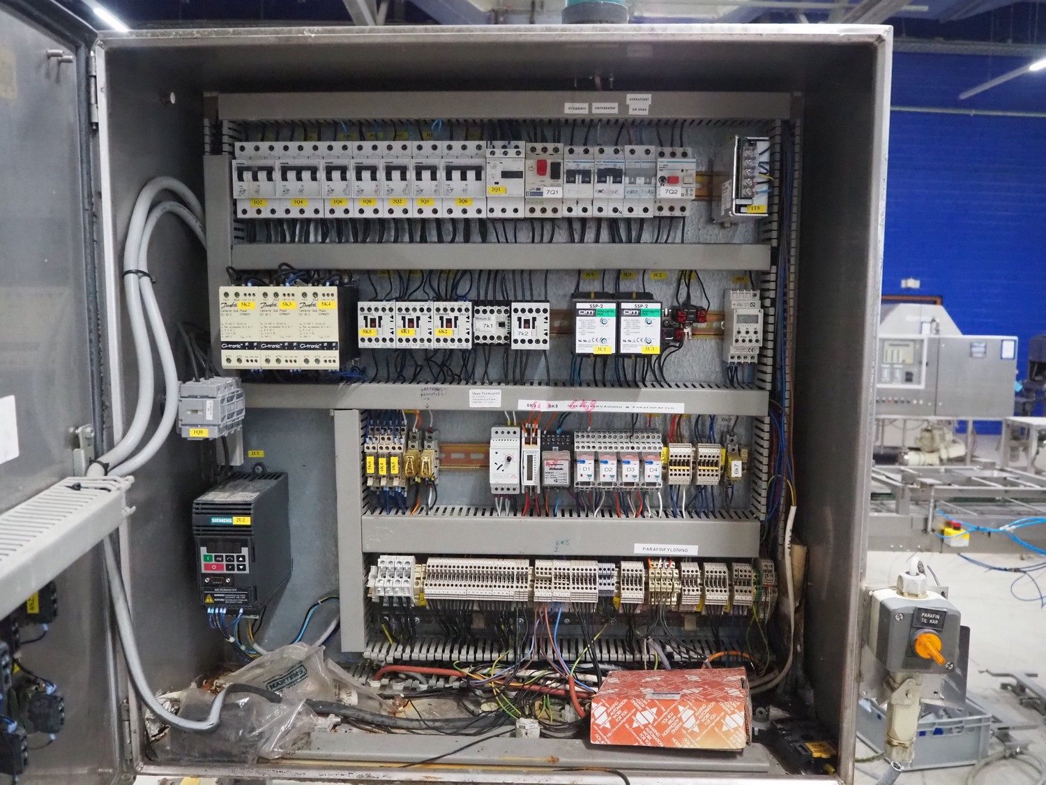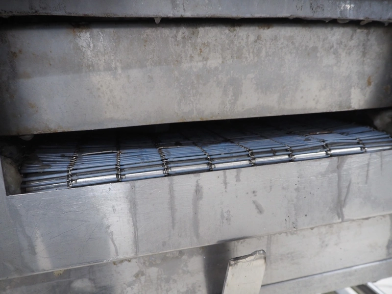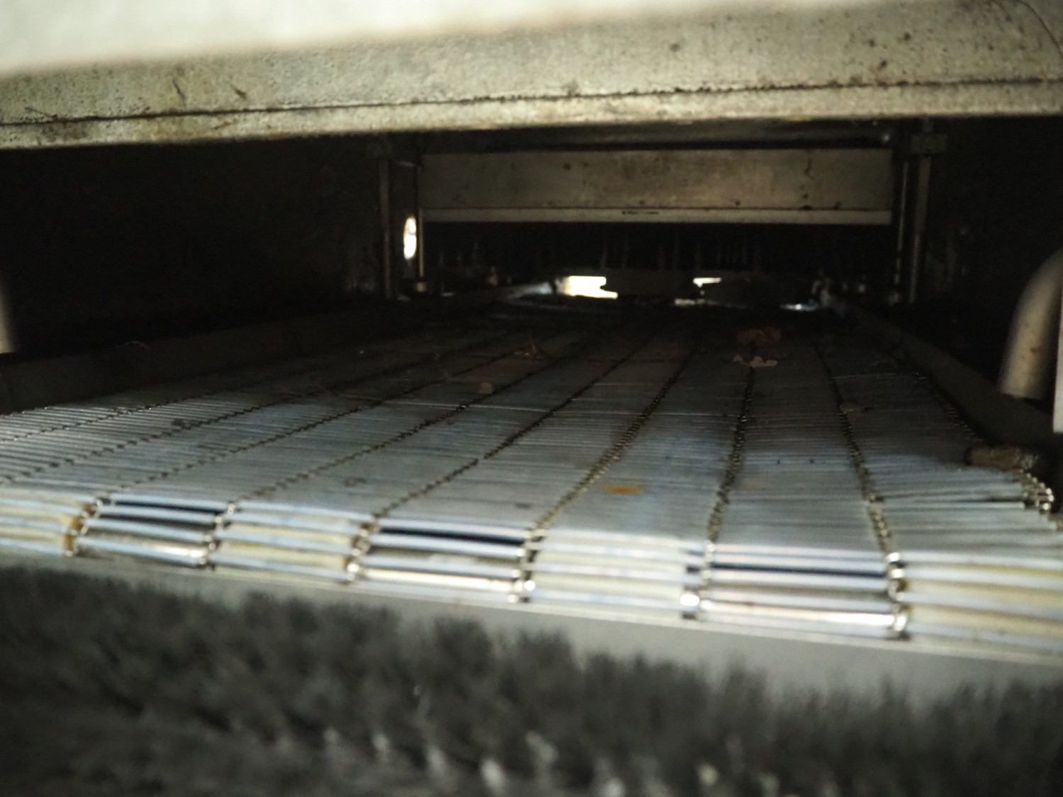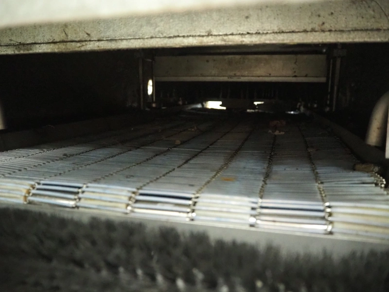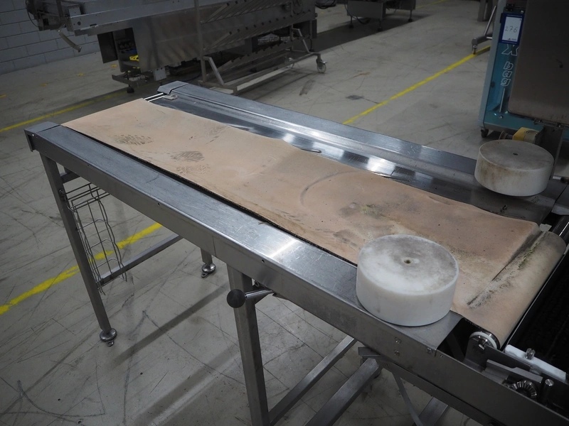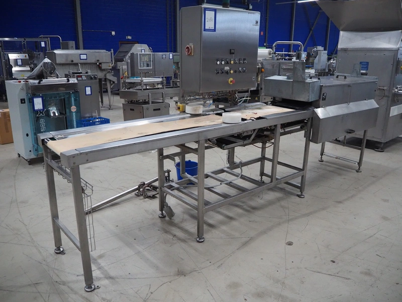E. Olsson's Maskinfabrik ApS paraffine tunnel, model: BOVM 400, serial number: 02.190.01, year of construction: 2001, 400 V, 3 Ph, 50 Hz, 16 A, clothed infeed belt, belt width: 350 mm, brush length: 400 mm, s/s mesh belt, belt width: 410 mm, clearance: 400 mm x 30 mm, total dimensions: 4100 mm x 950 mm x 2200 mm.