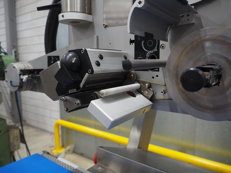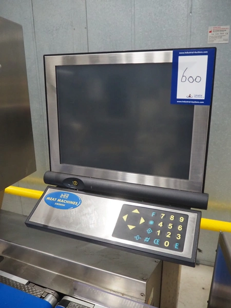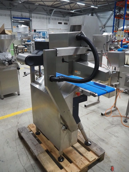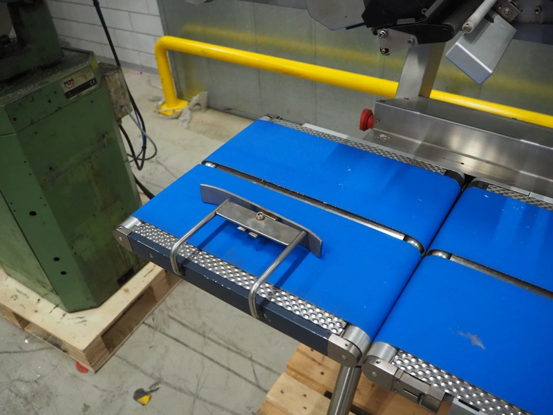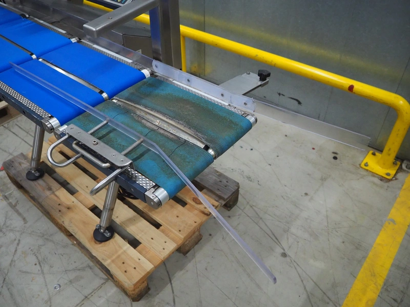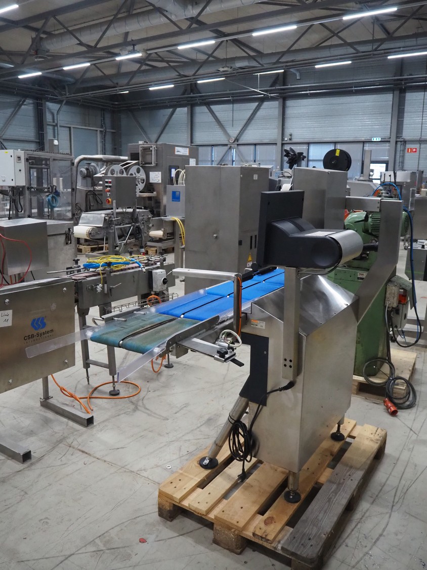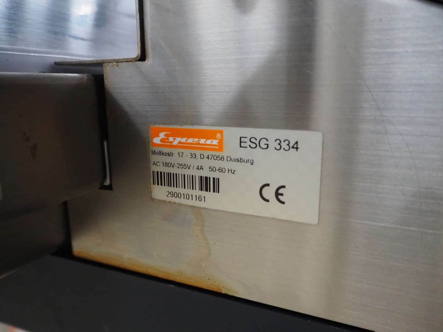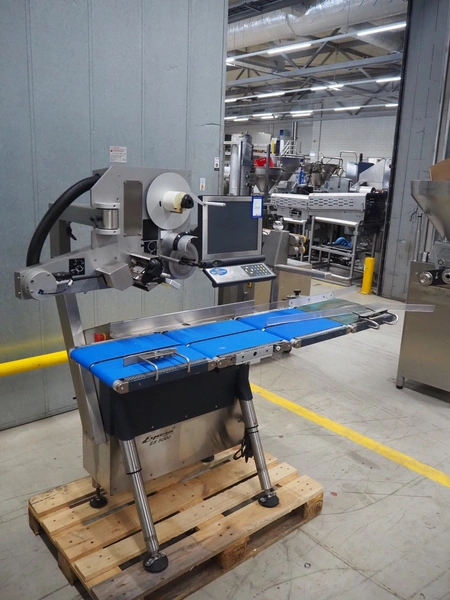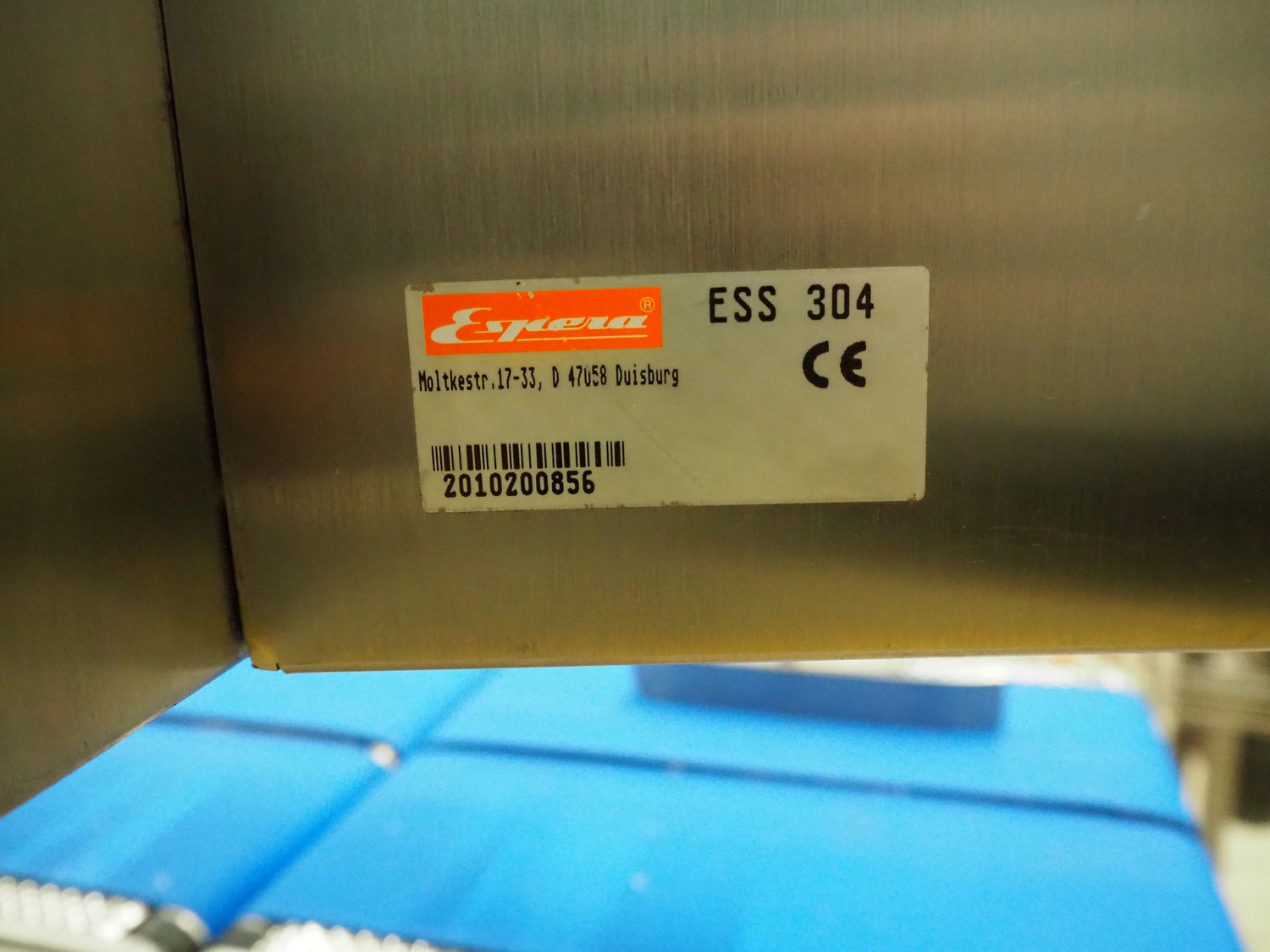 Espera checkweigher with top labeller, type machine: ES 5000, type checkweigher: ESW 2514, maximum weight: 6 kg, minimum weight: 40 gram, e = 2 gram, T = -6000 kg, type labeller, type: ESG 334, plastic belt, belt width: (2x) 150 mm, total dimensions: 1500 mm x 900 mm x 1500 mm.