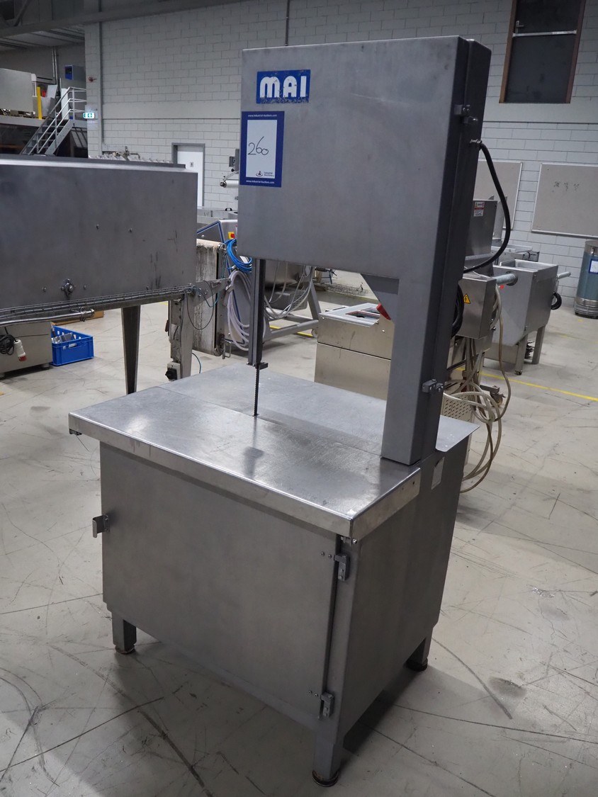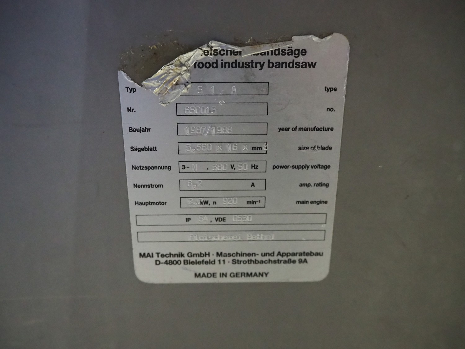 Mai bandsaw, type: 51 A, number: 650013, year of construction: 1987/1988, 380 V, 3 Ph, 50 Hz, 6.2 A, dimensions: 1000 mm x 820 mm x 2000 mm.