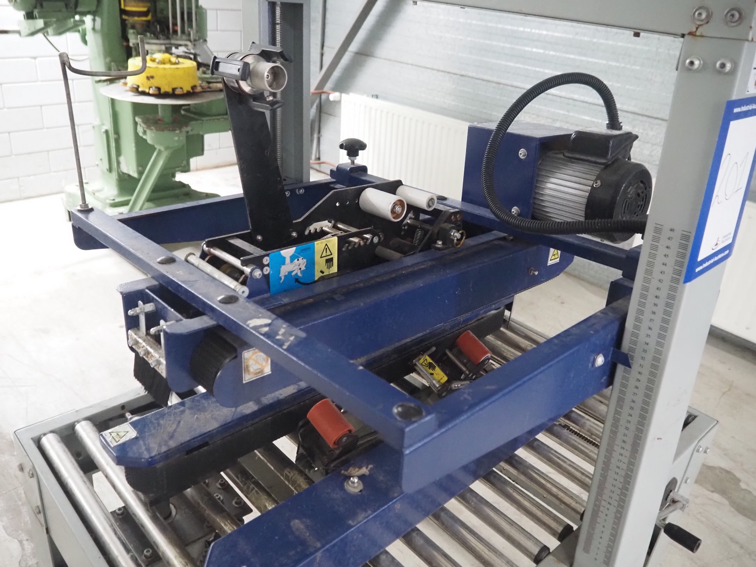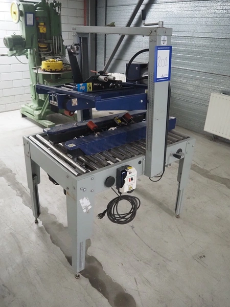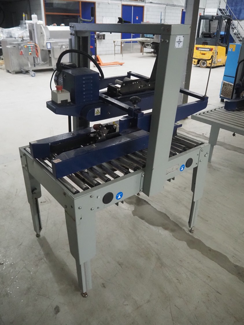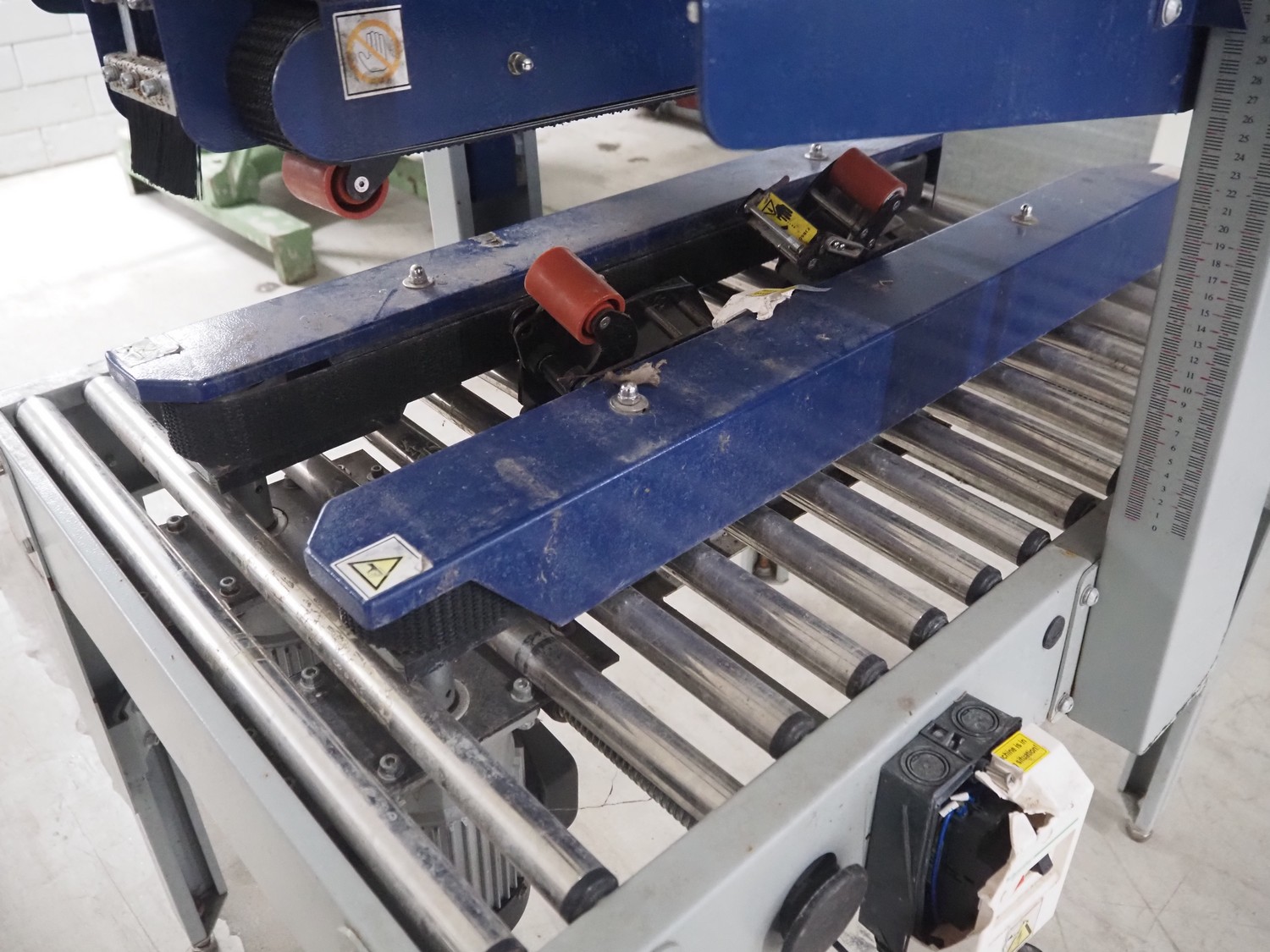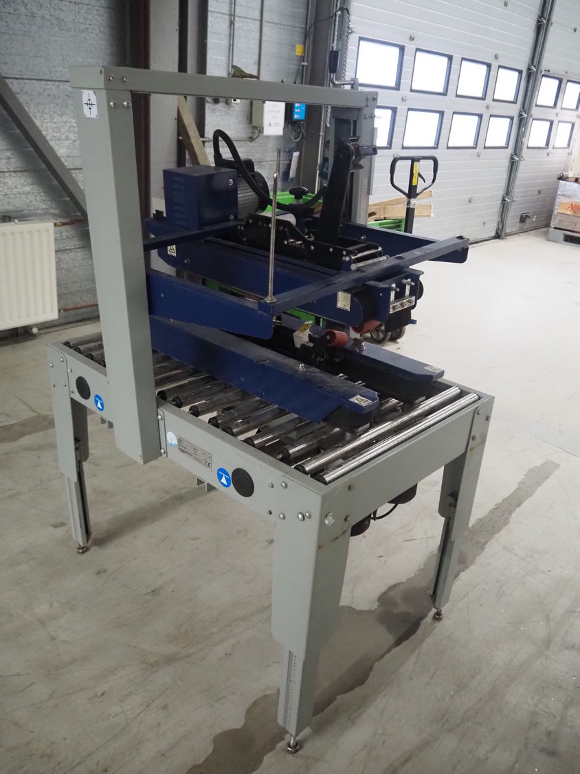 Youngsunpack Europe box closing machine, type: MH-FJ-1A, serial number: 180417CSI-255, year of construction: 4.2018, 220 V, 1 Ph, 50 H, 600 W, s/s rollers, roller width: 680 mm, plastic belts, belt width: 50 mm, total dimensions: 1100 mm x 950 mm x 1580 mm.