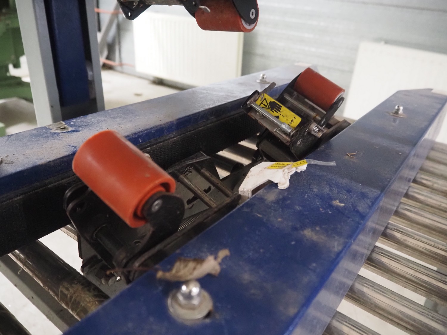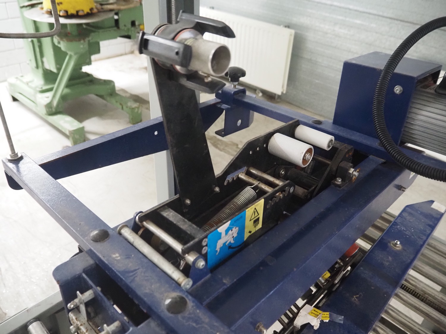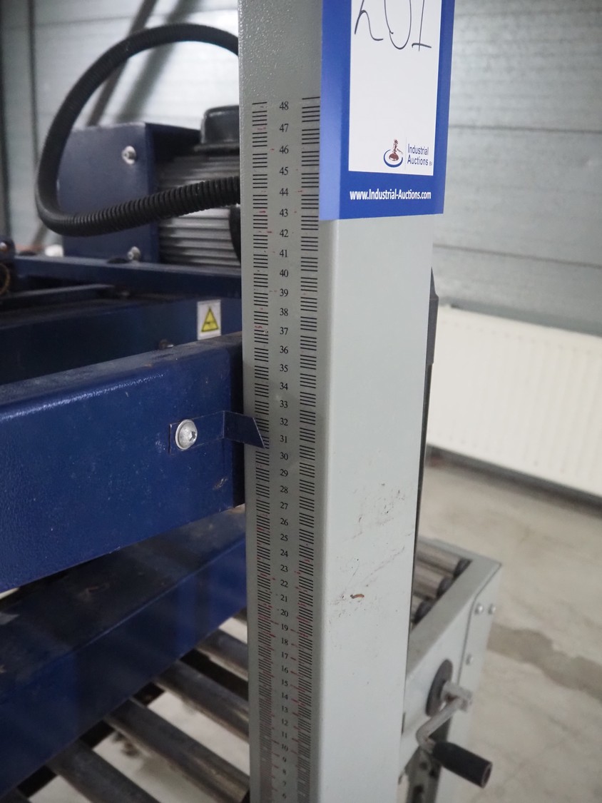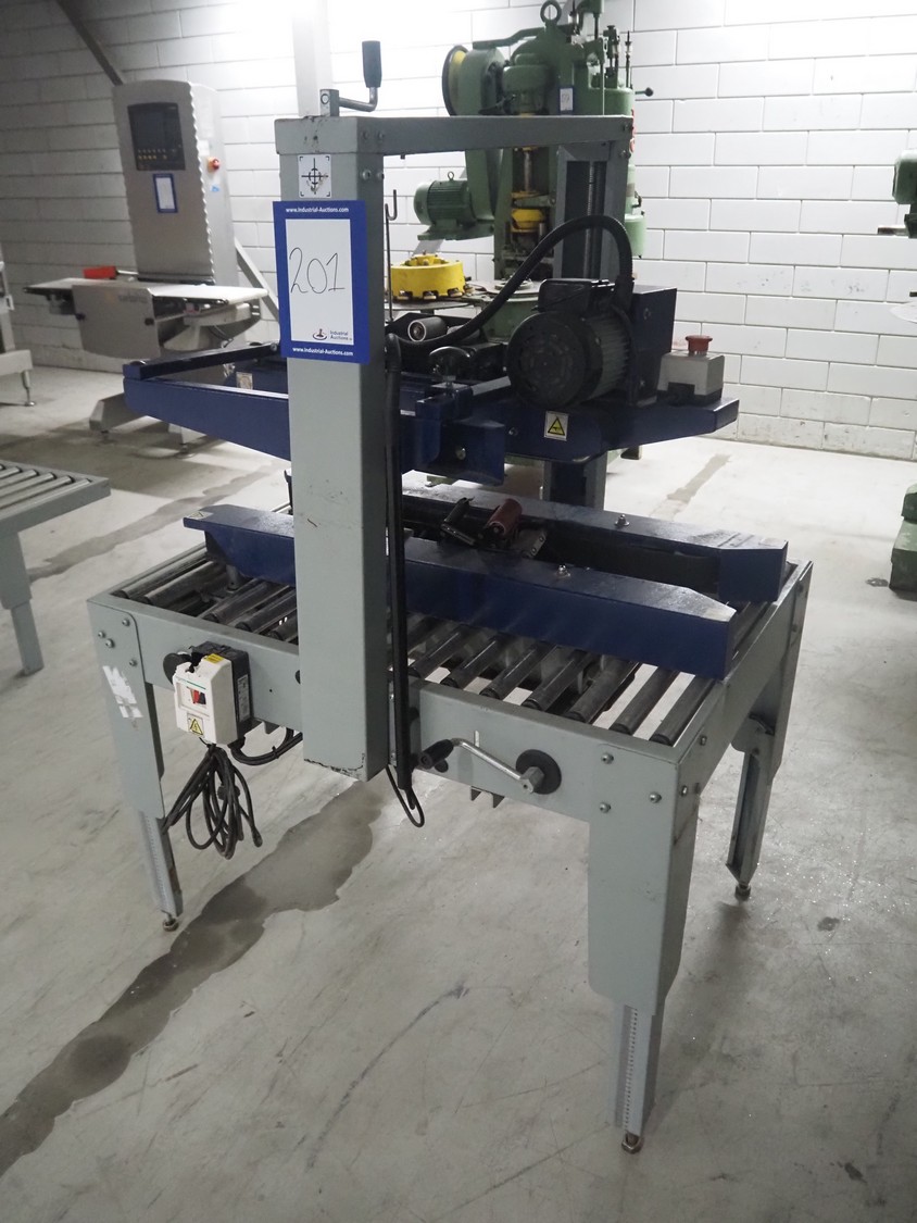 Youngsunpack Europe box closing machine, type: MH-FJ-1A, serial number: 180417CSI-255, year of construction: 4.2018, 220 V, 1 Ph, 50 H, 600 W, s/s rollers, roller width: 680 mm, plastic belts, belt width: 50 mm, total dimensions: 1100 mm x 950 mm x 1580 mm.
