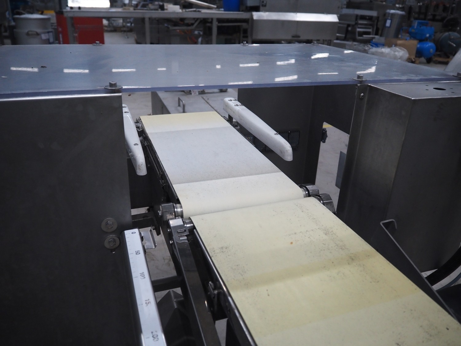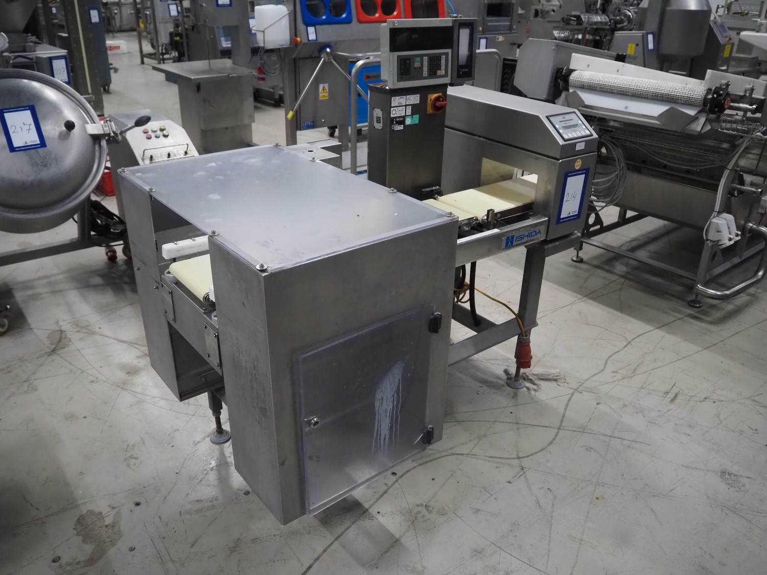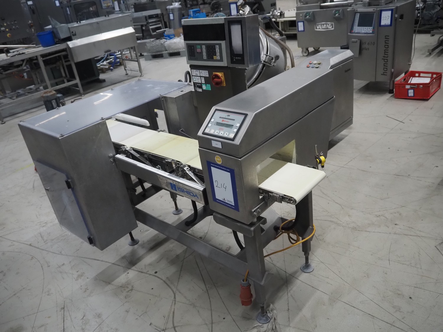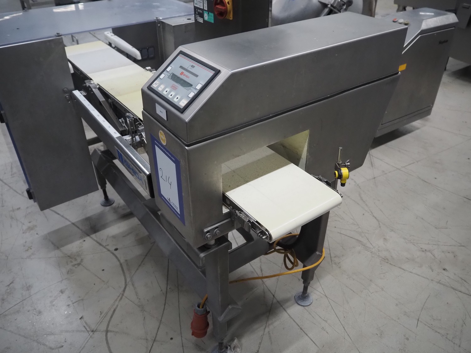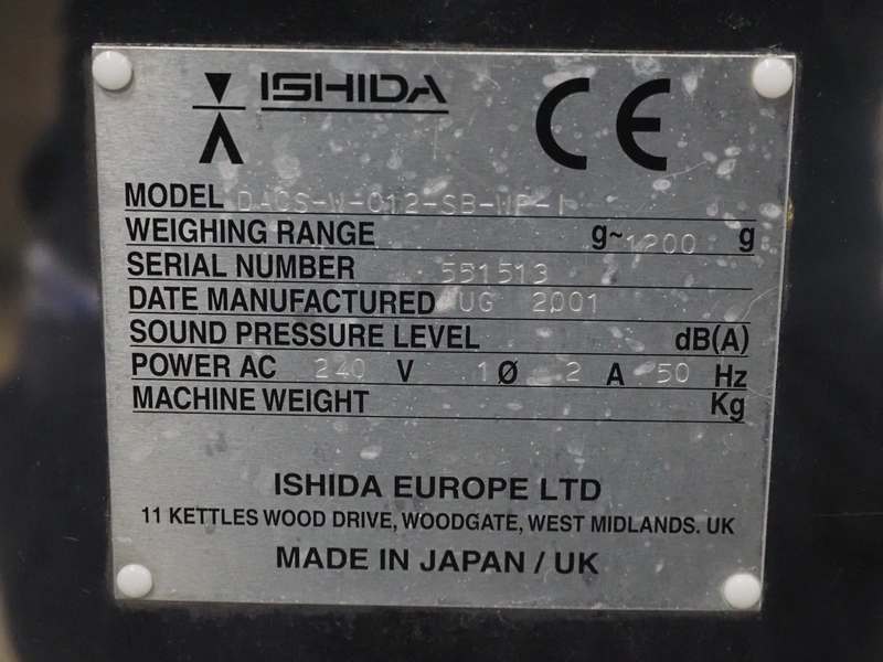 Ishida metal detector and checkweigher with rejecters, model: DACS-W-012-SB-WP-I, serial number: 551513, year of construction: 2001, 240 V, 1 Ph, 50 Hz, 2 A, clearance: 270 mm x 100 mm, plastic belt, belt width: (3x) 220 mm, total dimensions: 1670 mm x 1000 mm x 1470 mm.