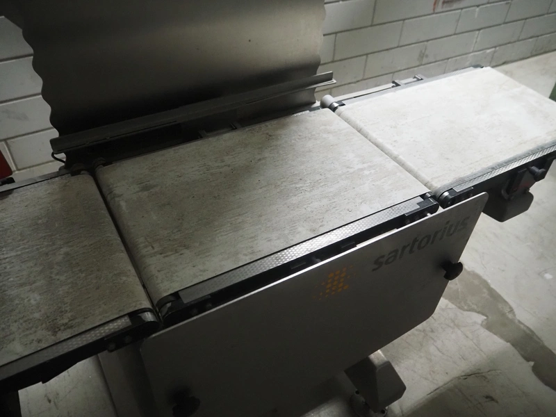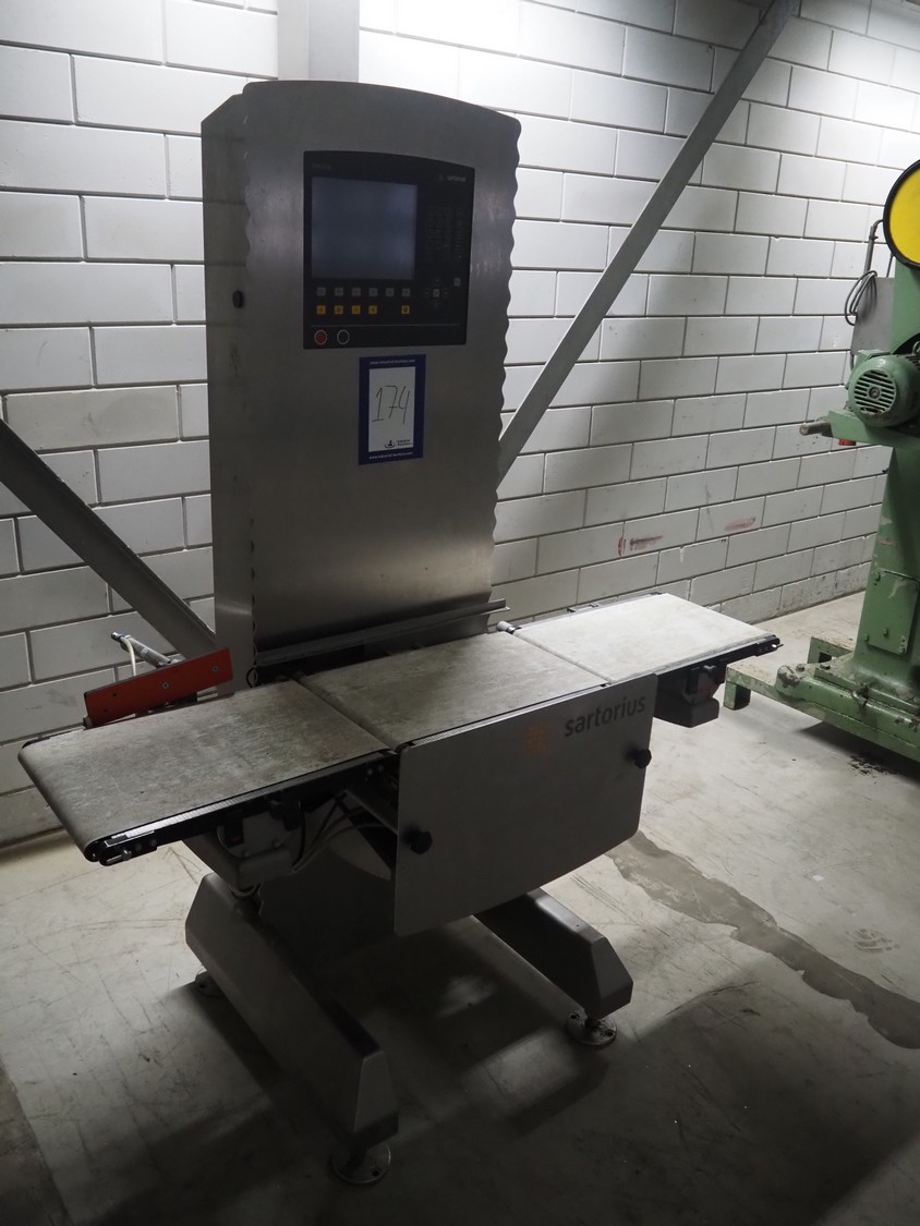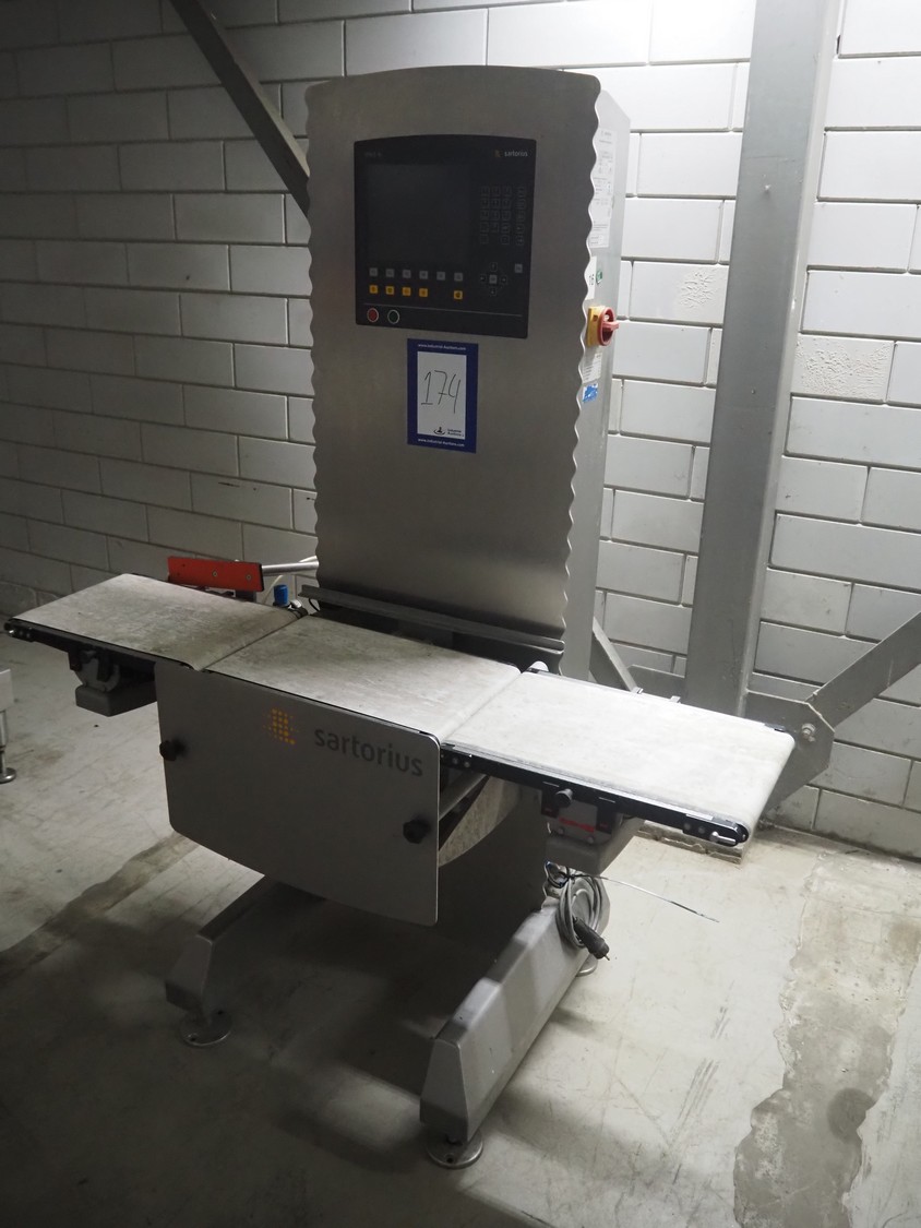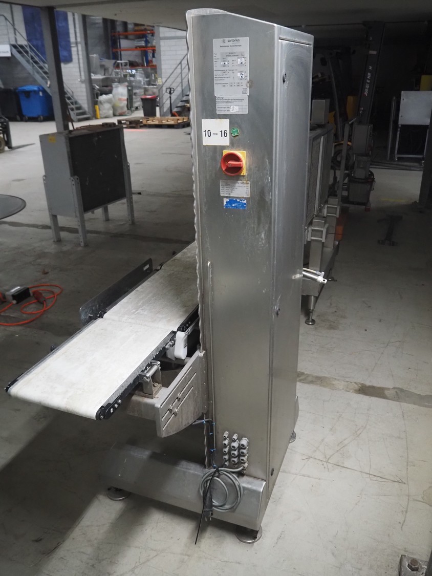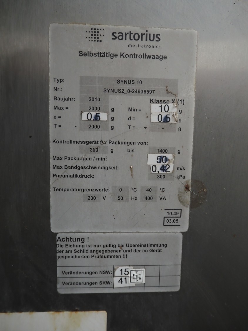 Sartorius checkweigher, type: SYNUS 10, number: SYNUS2_0-24936597, year of construction: 2010, 230 V, 50 Hz, 400 VA, maximum weight: 2000 gram, minimum weight: 10 gram, e= 0.5 gram, d= 0.5 gram, T= -2000 gram, Sartorius weighting cell, type weighing cell: WZGP-2-S, plastic belts, belt width: (3x) 300 mm, total dimensions: 1450 mm x 740 mm x 1850 mm.