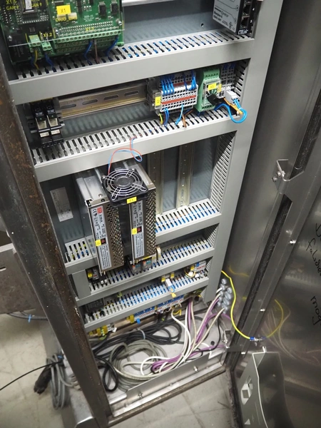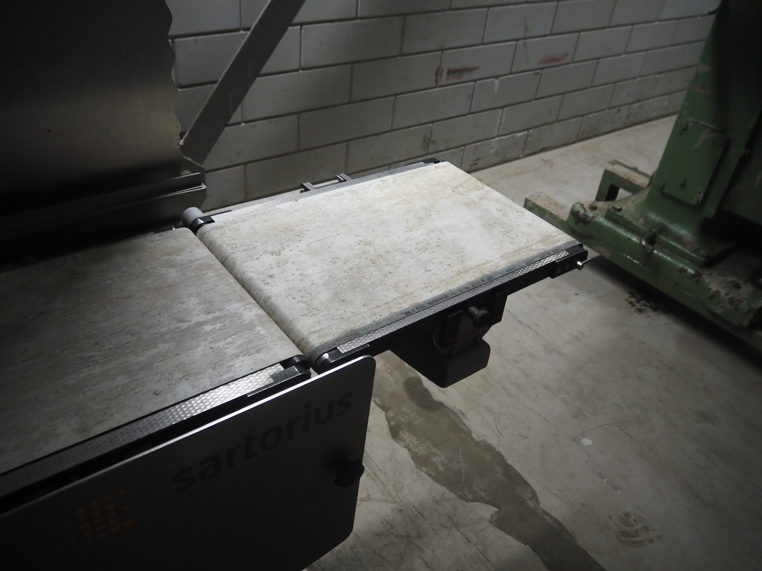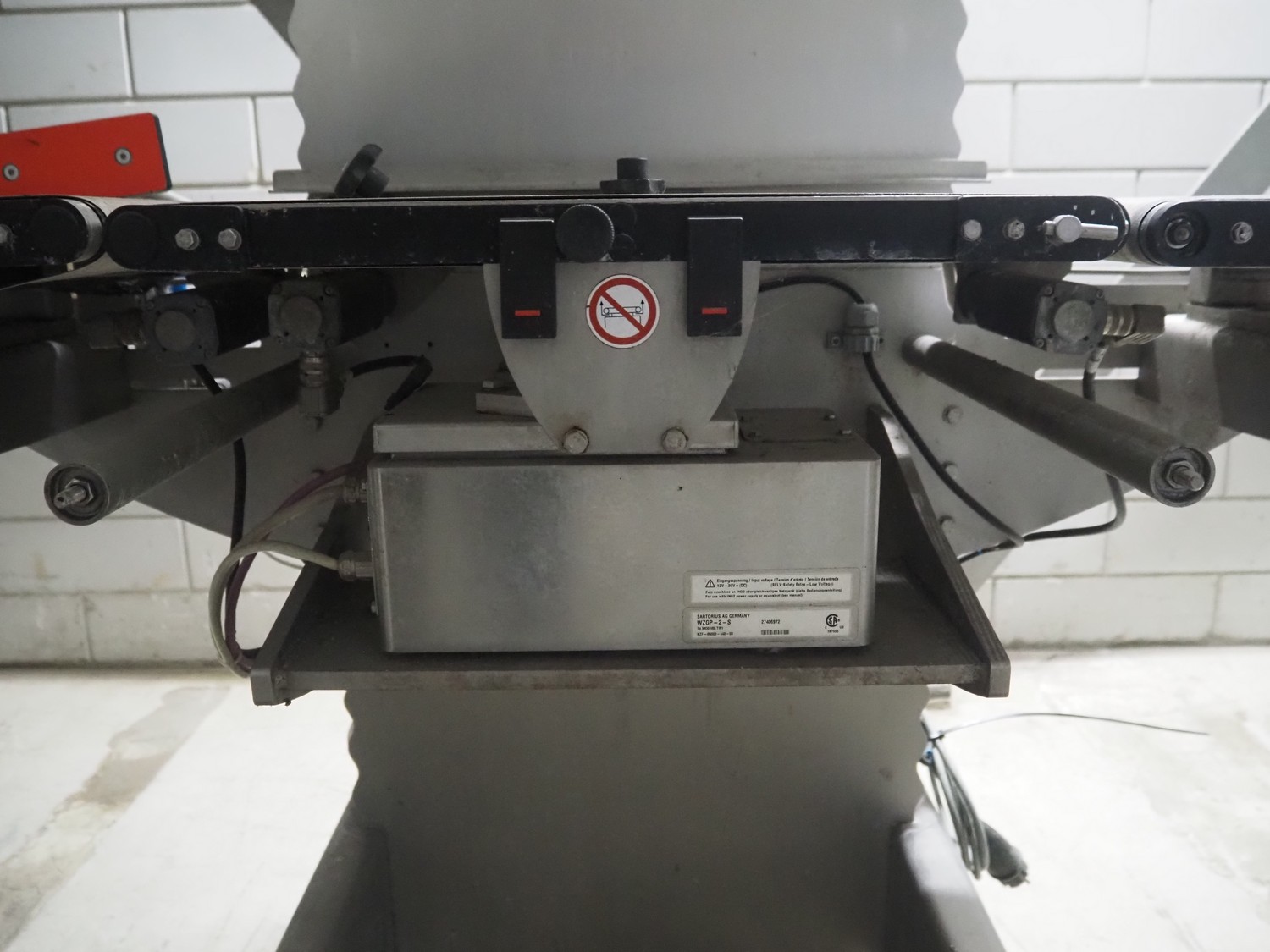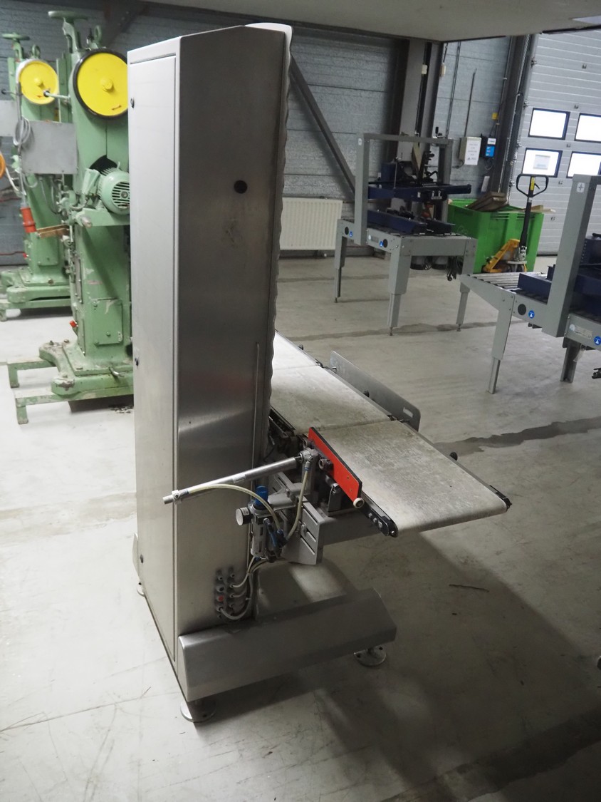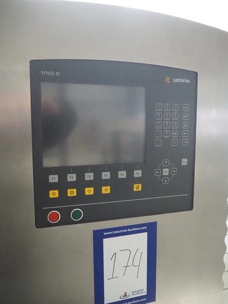 Sartorius checkweigher, type: SYNUS 10, number: SYNUS2_0-24936597, year of construction: 2010, 230 V, 50 Hz, 400 VA, maximum weight: 2000 gram, minimum weight: 10 gram, e= 0.5 gram, d= 0.5 gram, T= -2000 gram, Sartorius weighting cell, type weighing cell: WZGP-2-S, plastic belts, belt width: (3x) 300 mm, total dimensions: 1450 mm x 740 mm x 1850 mm.
