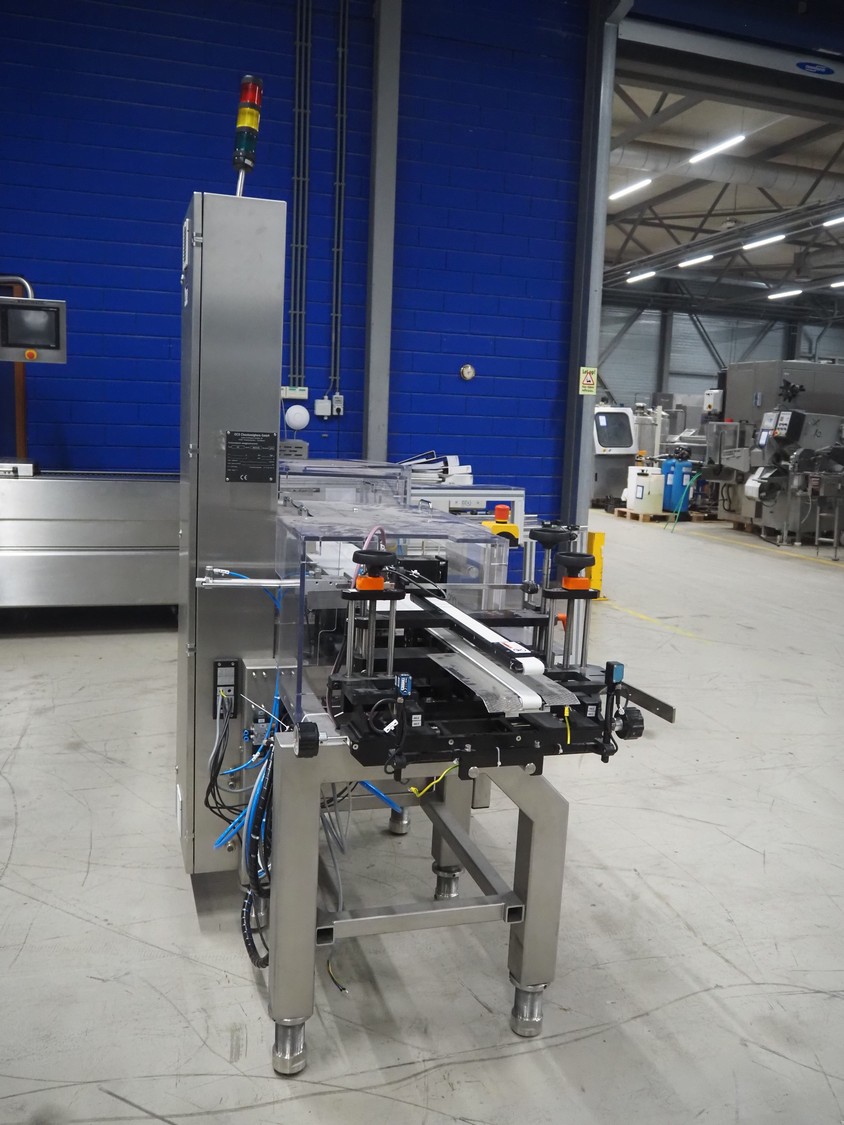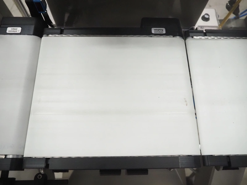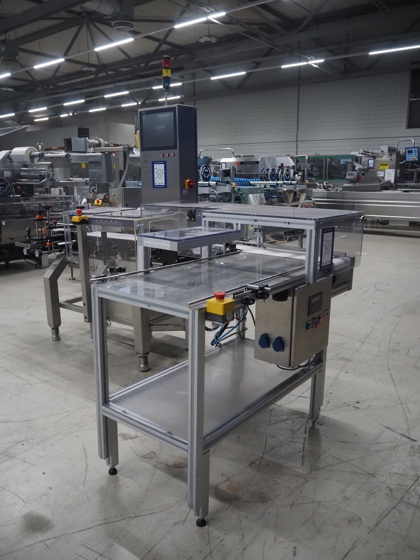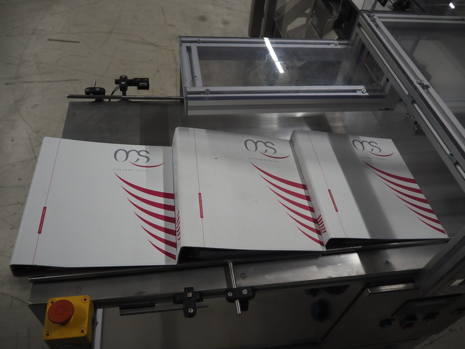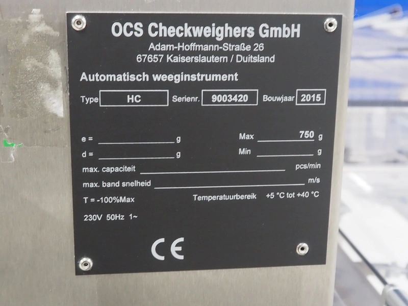 OCS Checkweighers GmbH checkweigher with 2 rejecters, type: HC, serial number: 9003420, year of construction: 2015, 230 V, 1 Ph, 50 Hz, capacity: 750 gram, plastic belts, belt width: 32 mm, 195 mm and 220 mm, total dimensions: 2800 mm x 1650 mm x 1800 mm.