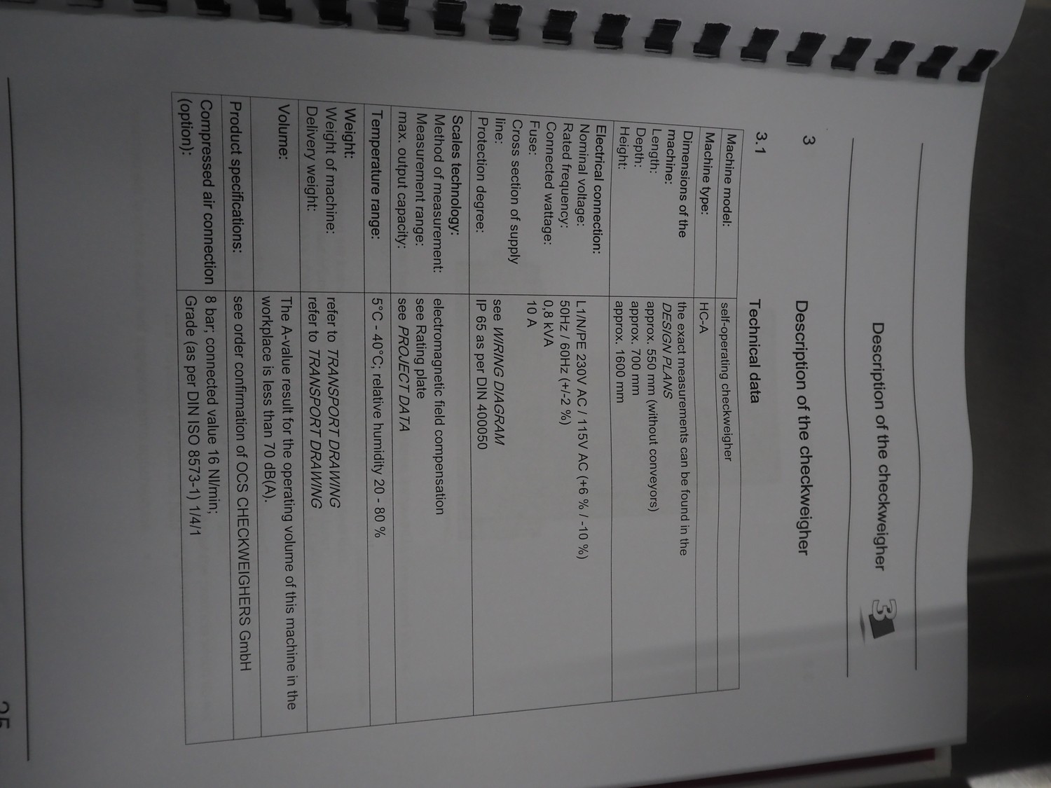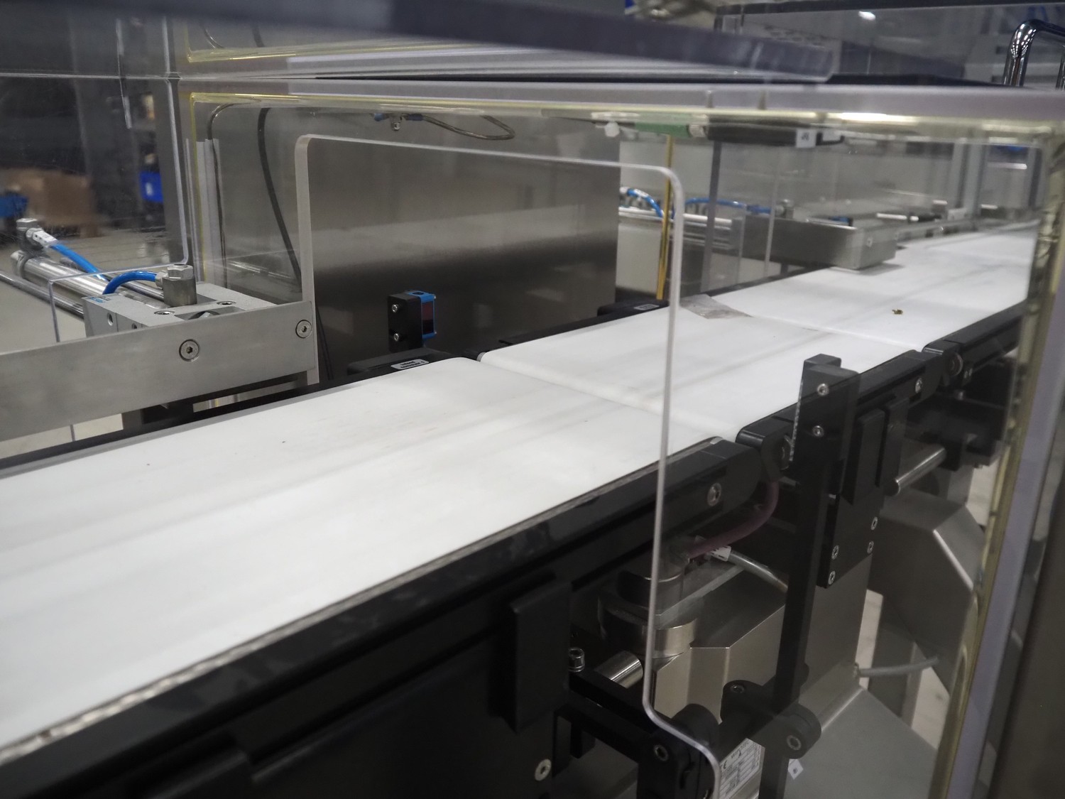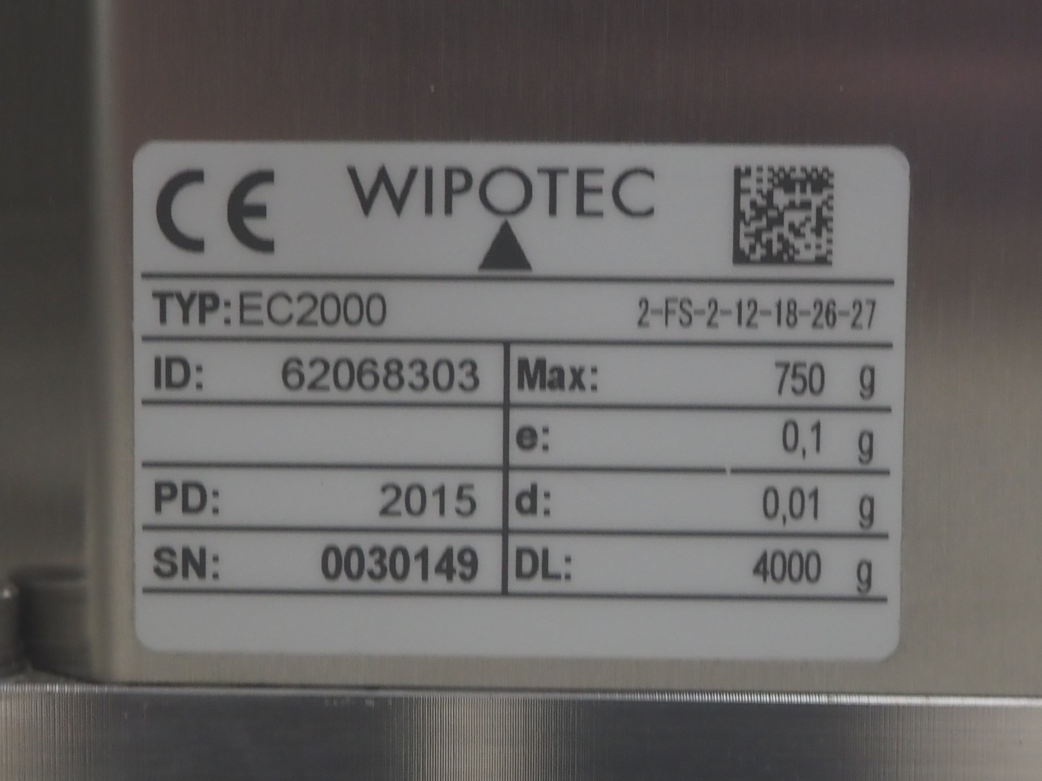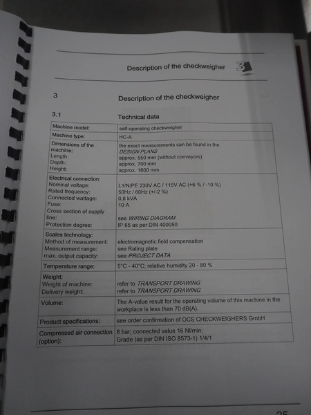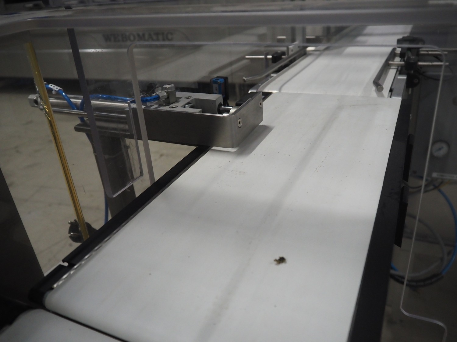 OCS Checkweighers GmbH checkweigher with 2 rejecters, type: HC, serial number: 9003420, year of construction: 2015, 230 V, 1 Ph, 50 Hz, capacity: 750 gram, plastic belts, belt width: 32 mm, 195 mm and 220 mm, total dimensions: 2800 mm x 1650 mm x 1800 mm.