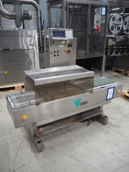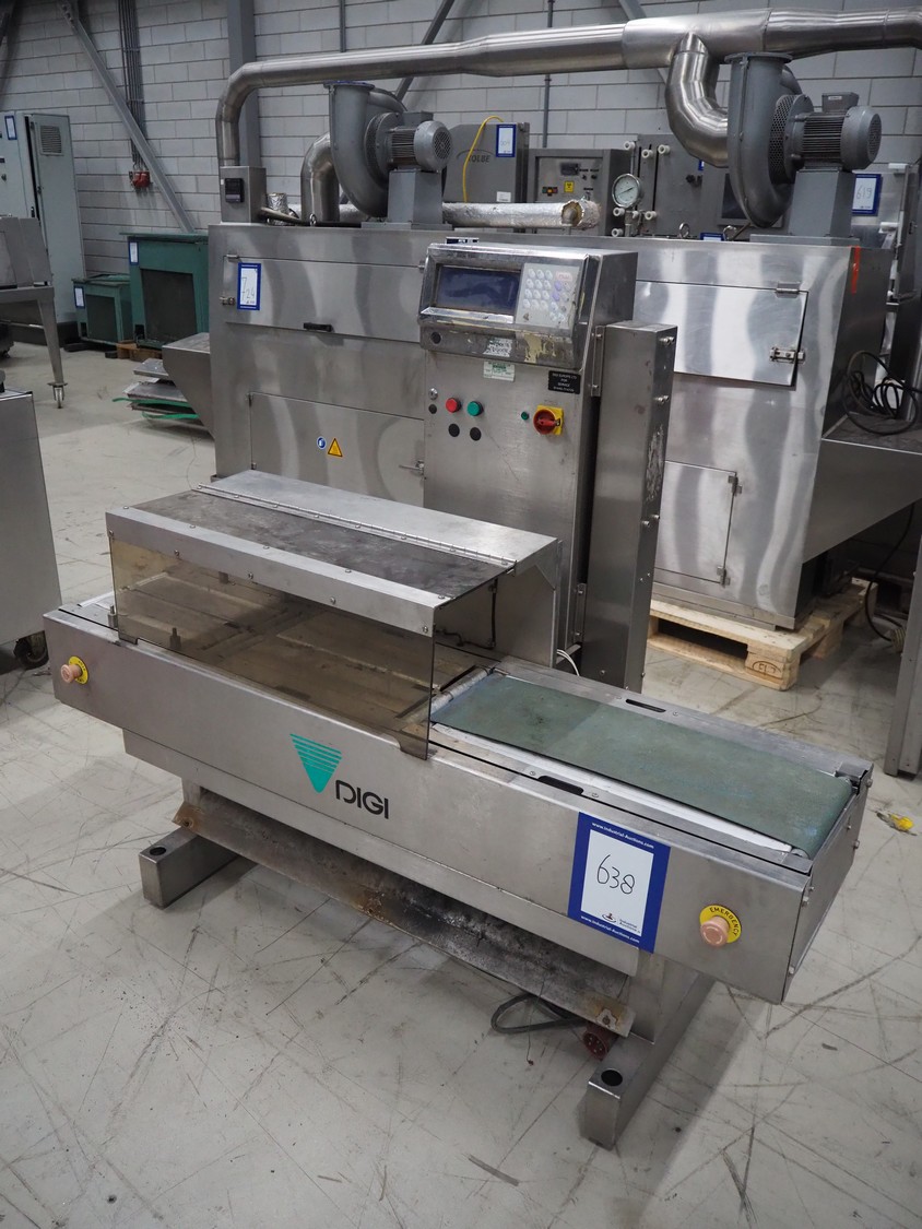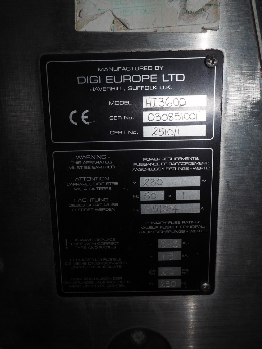 Digi Europe LTD checkweigher, model: HI3600, serial number: 030851001, 230 V, 1 Ph, 50 Hz, plastic belt, belt width: 200 mm, total dimensions: 1600 mm x 700 mm x 1400 mm.