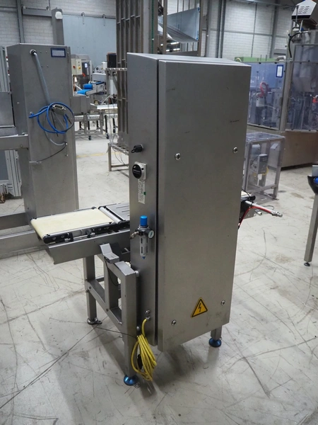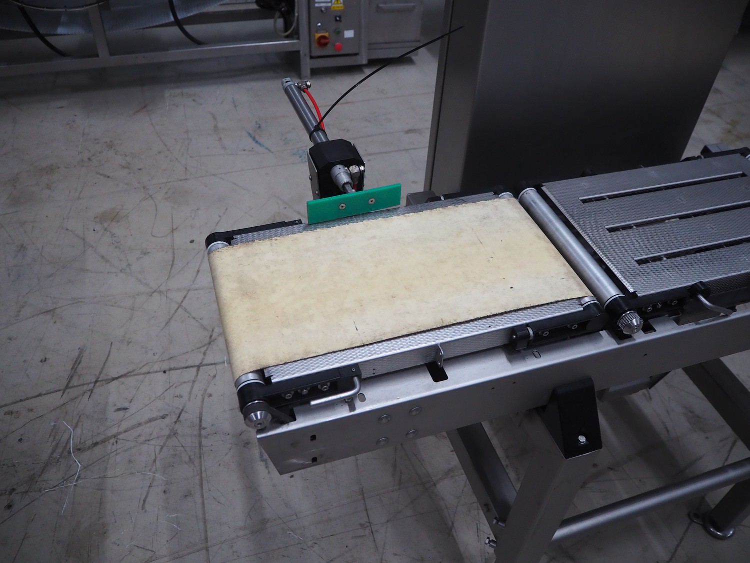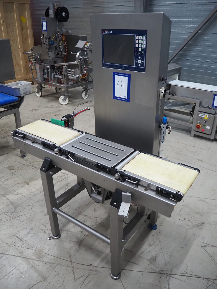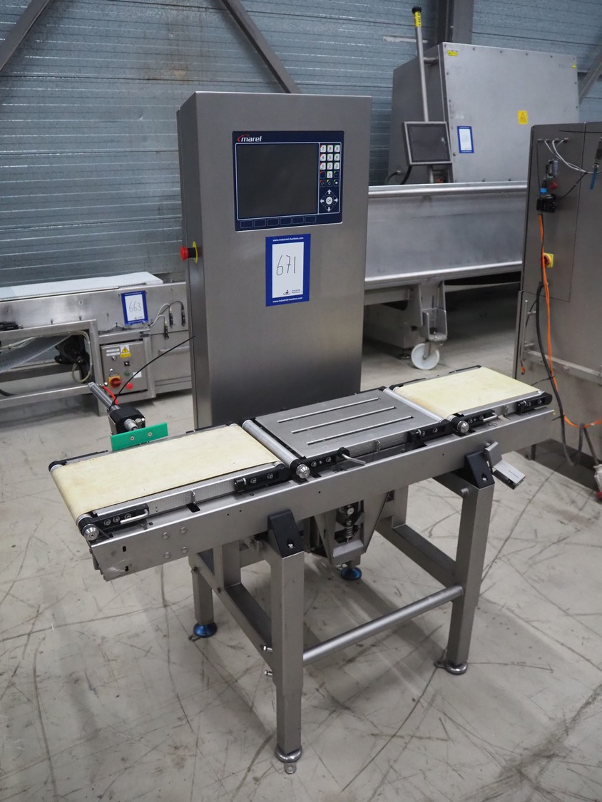 Marel checkweigher, type: M-Check RF8 8023.30, serial number: E014590, type load cell: Z6F C3, serial number: 31036805, maximum: 31036805, minimum: 0.05 kg, e= 0.001 kg, T= -Max, plastic belt, belt width: 230 mm, total dimensions: 1400 mm x 850 mm x 1680 mm. Missing one transport belt.