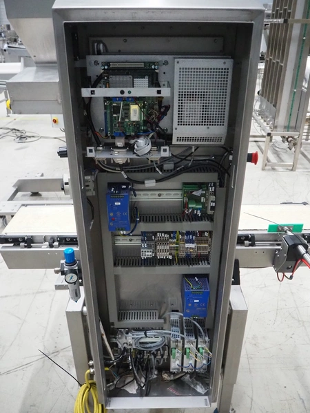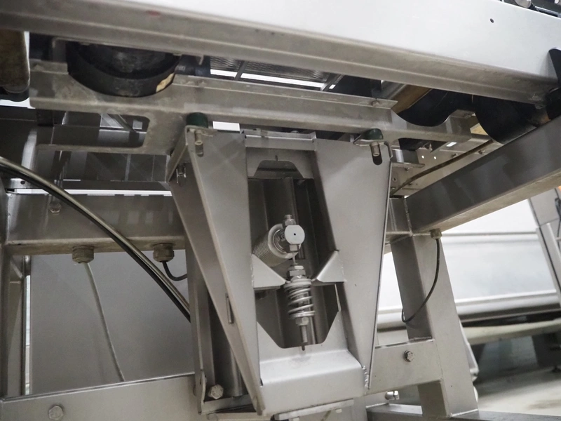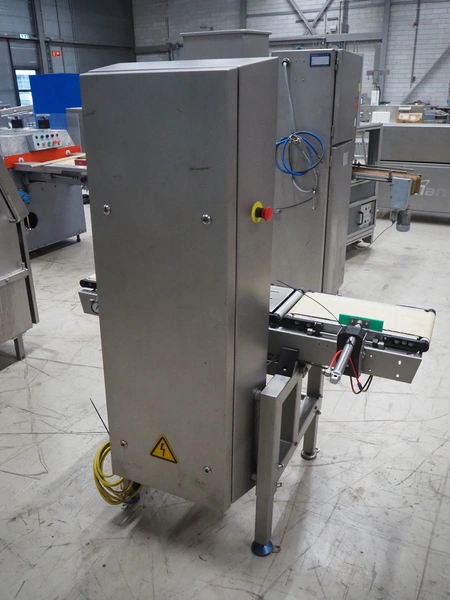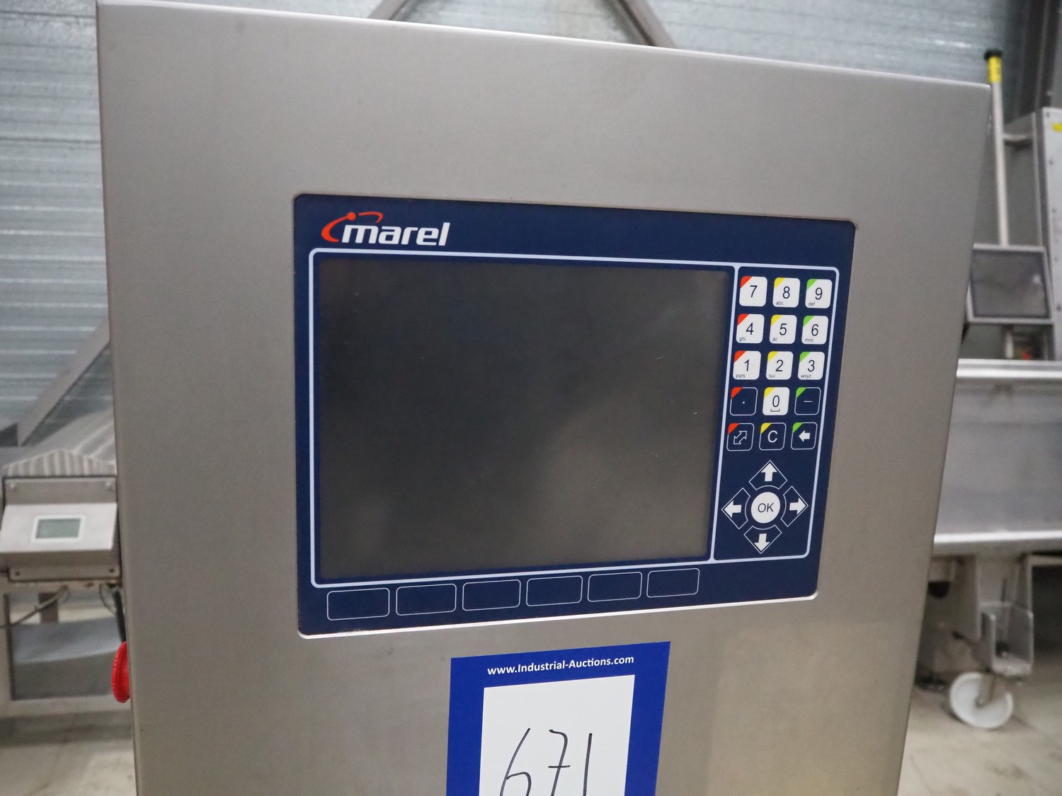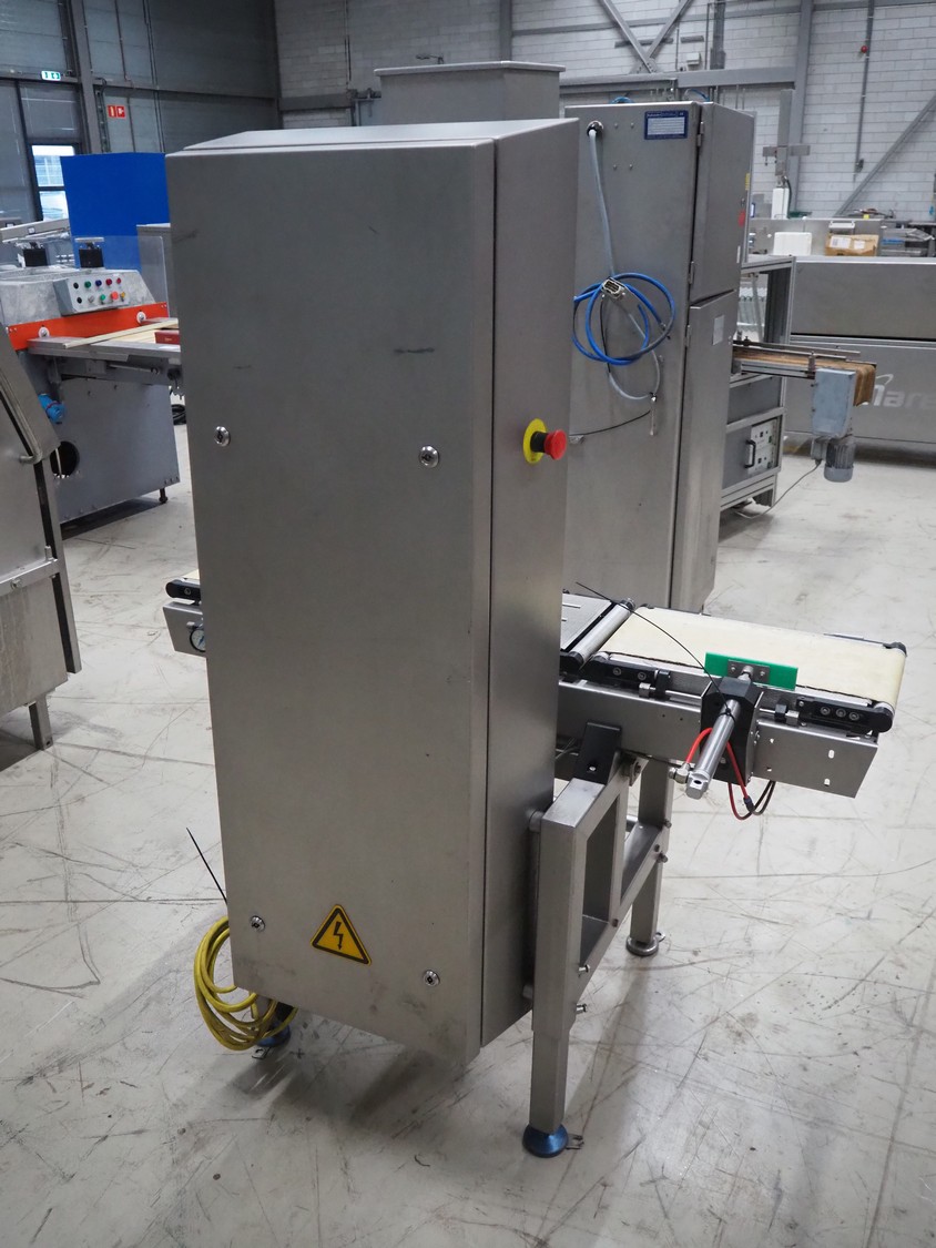 Marel checkweigher, type: M-Check RF8 8023.30, serial number: E014590, type load cell: Z6F C3, serial number: 31036805, maximum: 31036805, minimum: 0.05 kg, e= 0.001 kg, T= -Max, plastic belt, belt width: 230 mm, total dimensions: 1400 mm x 850 mm x 1680 mm. Missing one transport belt.