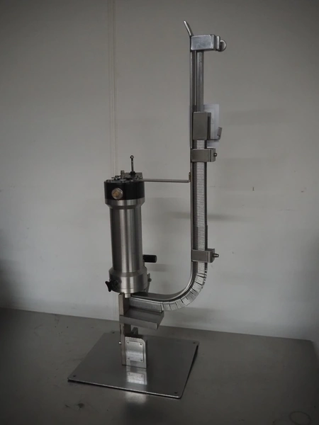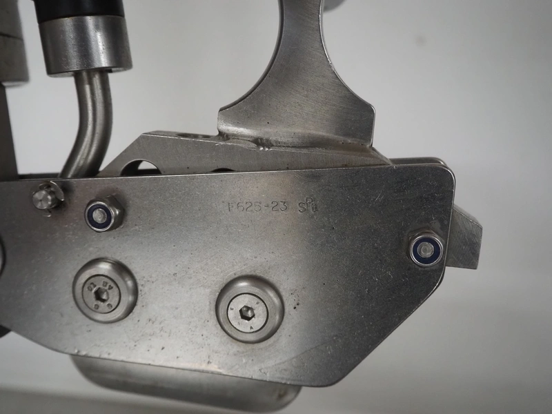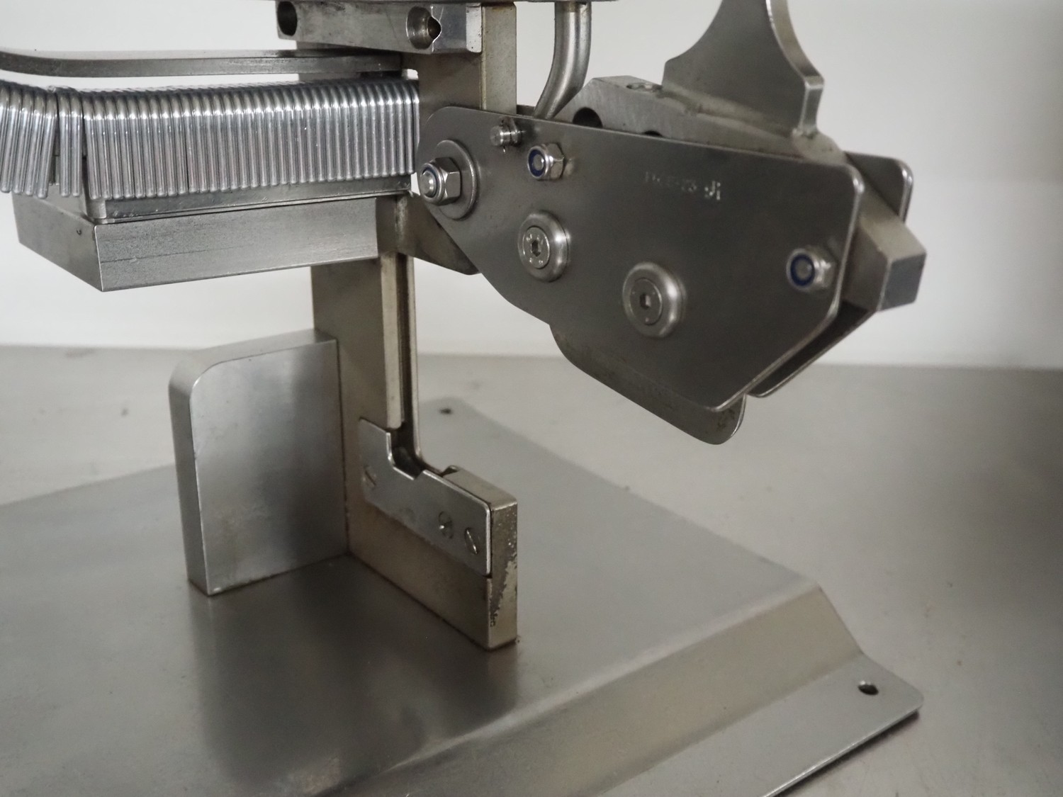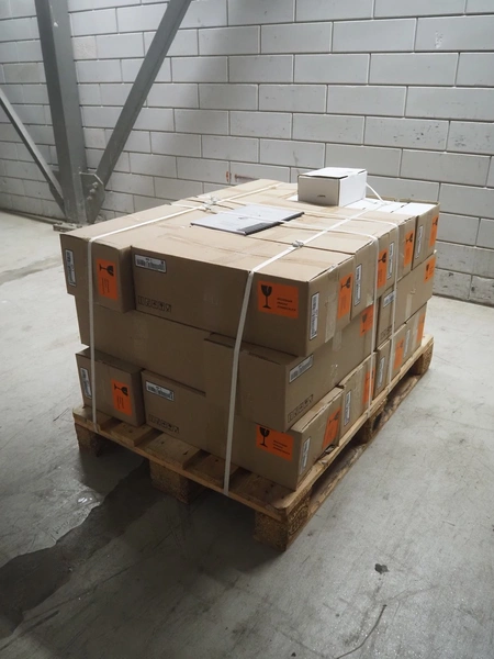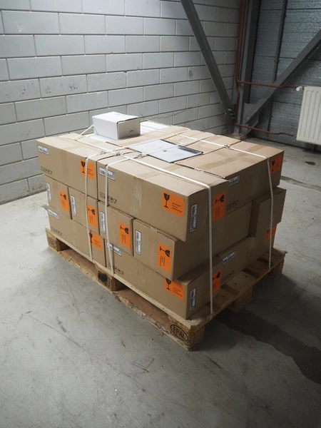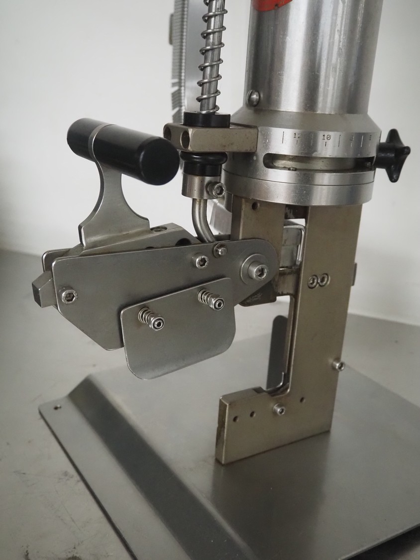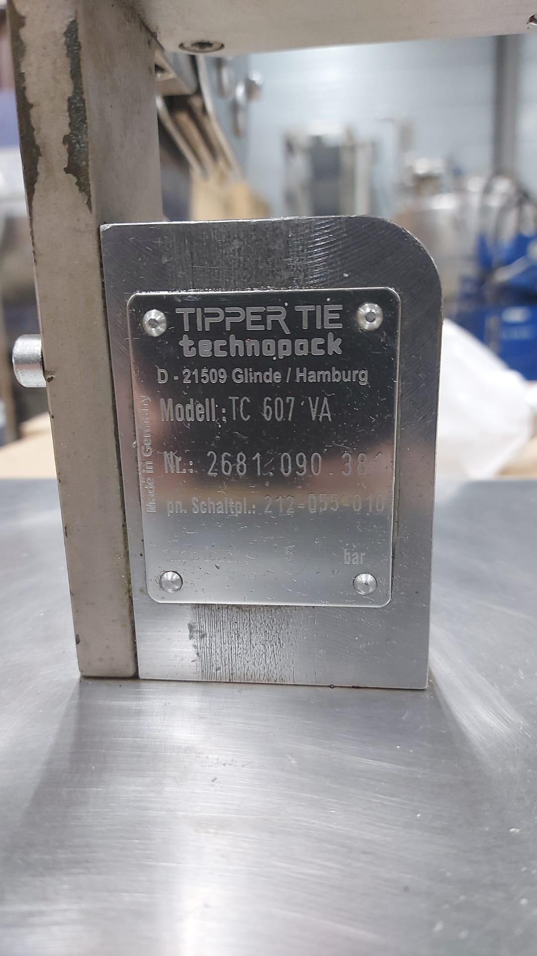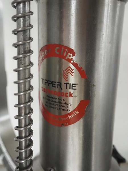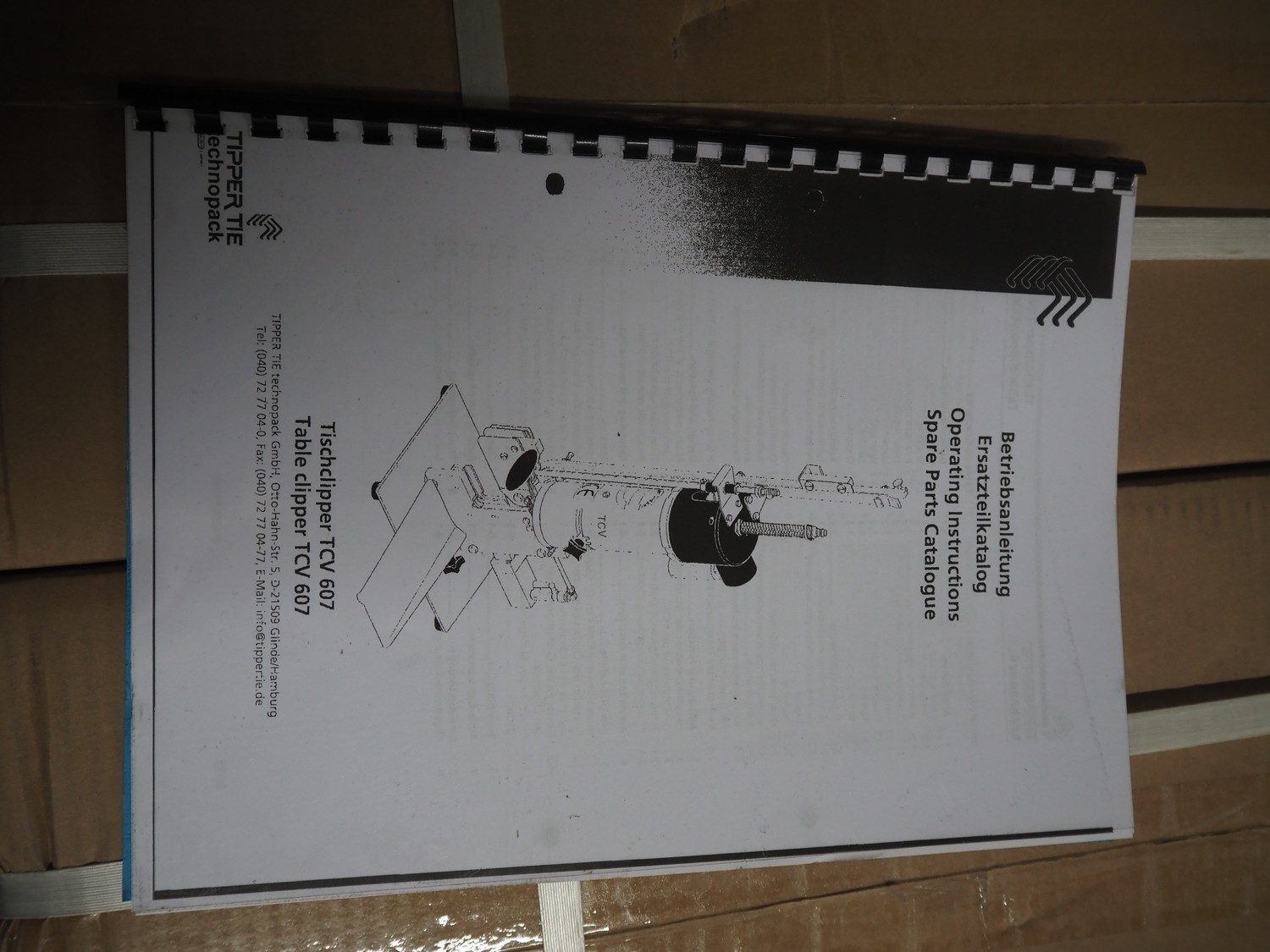 TipperTie Technopack clipper, type: TCV 607 VA, number: 2681.090.38, air pressure: 5 bar, dimensions: 450 mm x 370 mm x 920 mm. Including pallet with large amount of boxes with clips, type: 603 T, 1400 clips per box, dimensions pallet: 1200 mm x 800 mm x 710 mm.