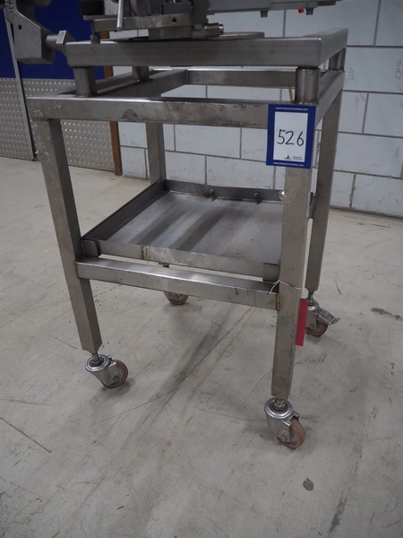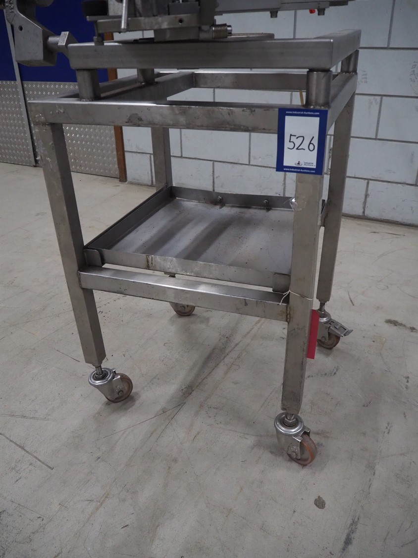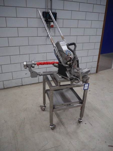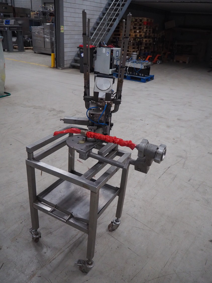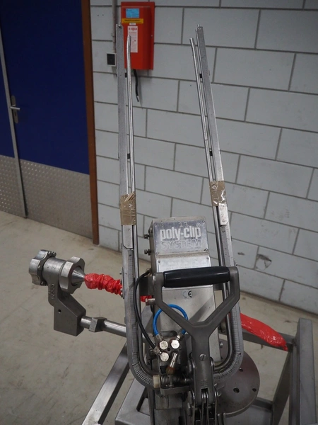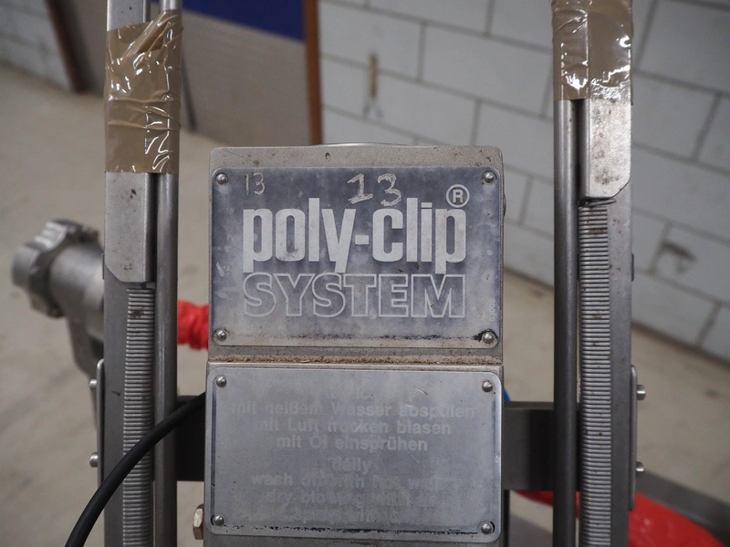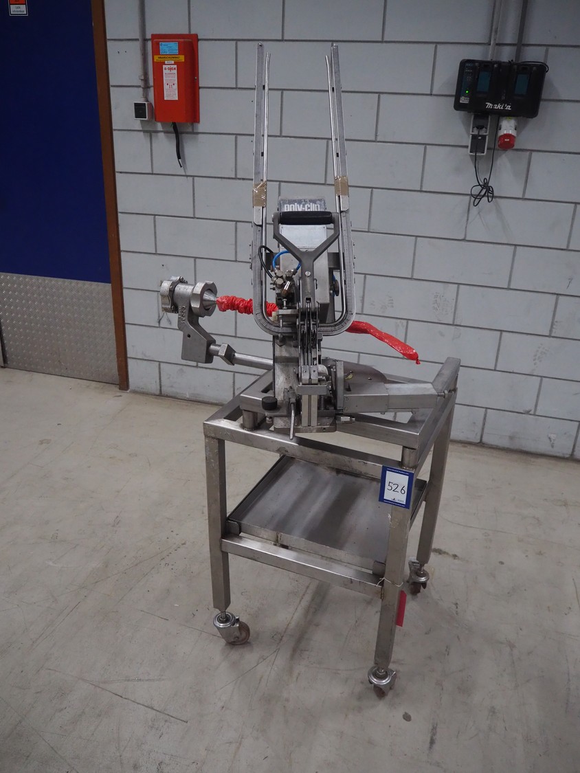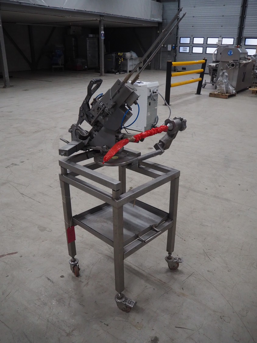 Poly-clip System GmbH clipper on s/s trolley, type: DCD-E, number: 59539, bar: 5-7, dimensions: 830 mm x 700 mm x 1700 mm.