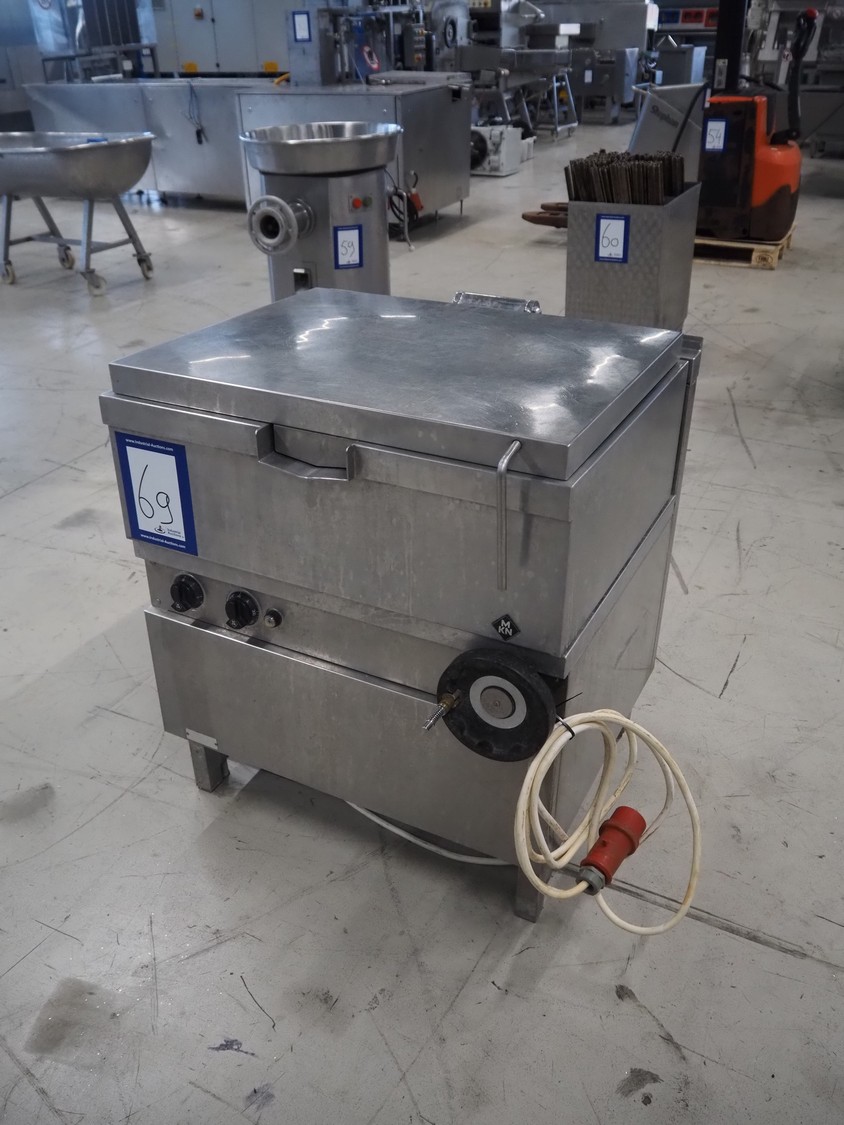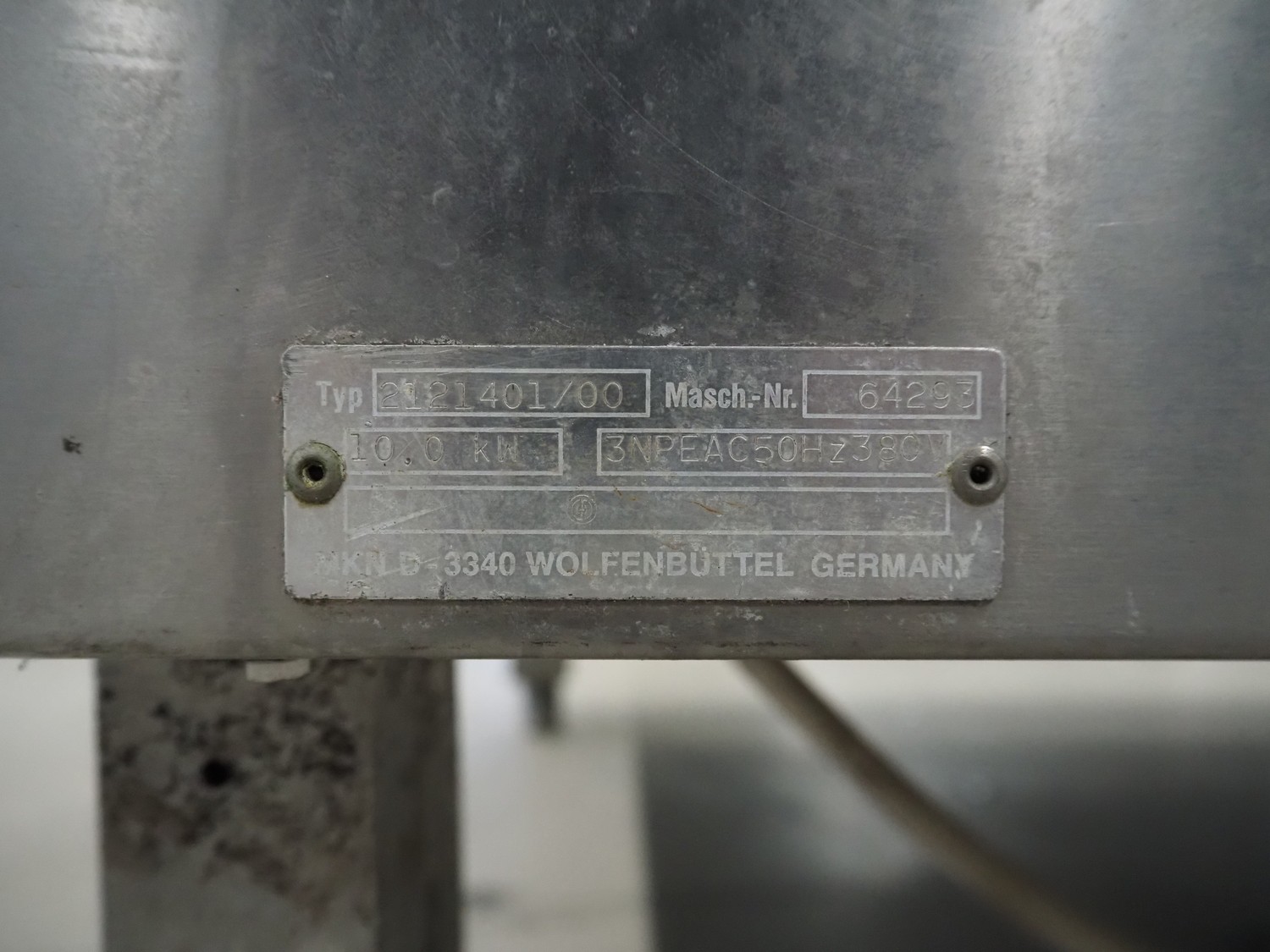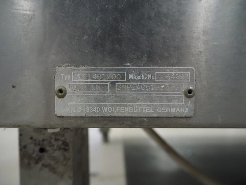 MKN cooking vessel, type: 2121401/00, machine number: 64293, 380 V, 3 Ph, 50 Hz, 10.0 kW, inside dimensions: 725 mm x 535 mm x 150 mm, total dimensions: 800 mm x 750 mm x 930 mm.