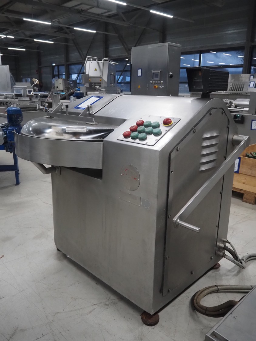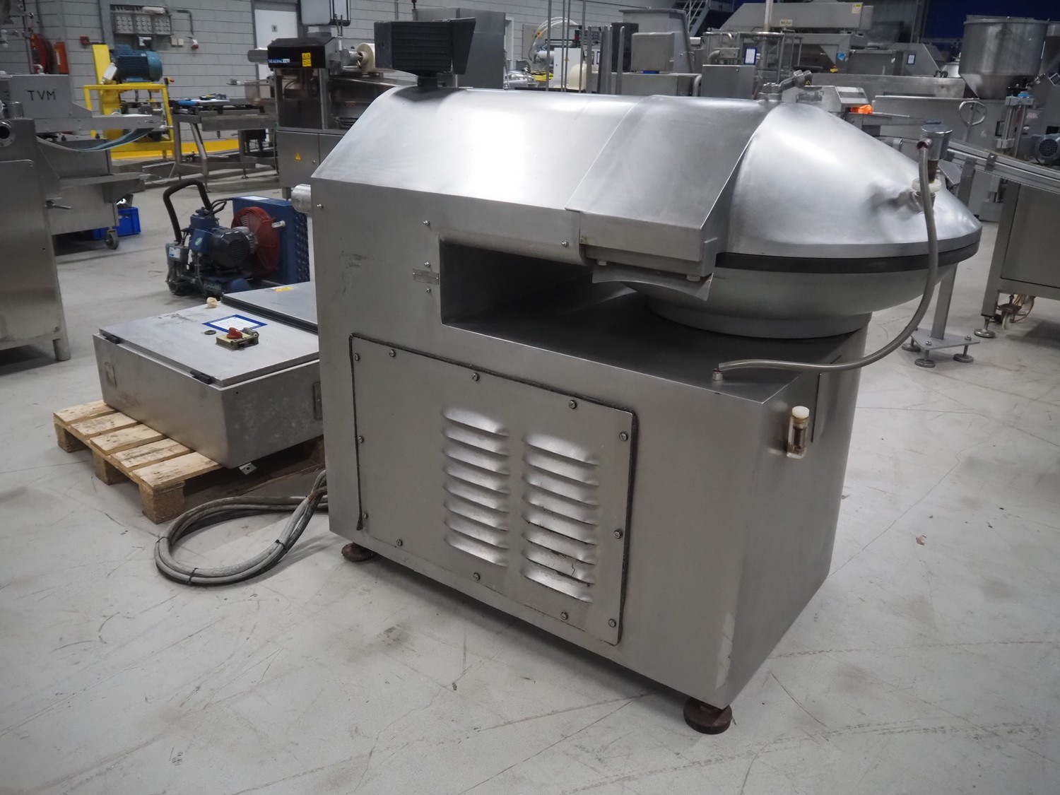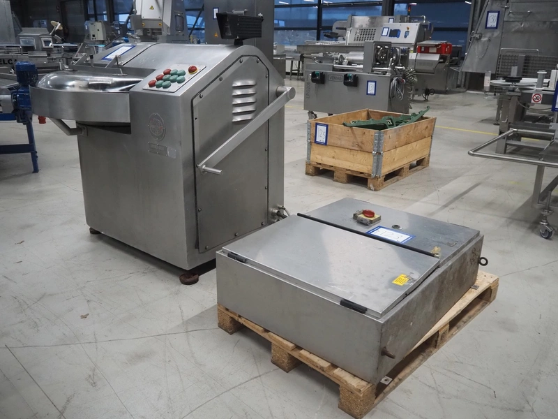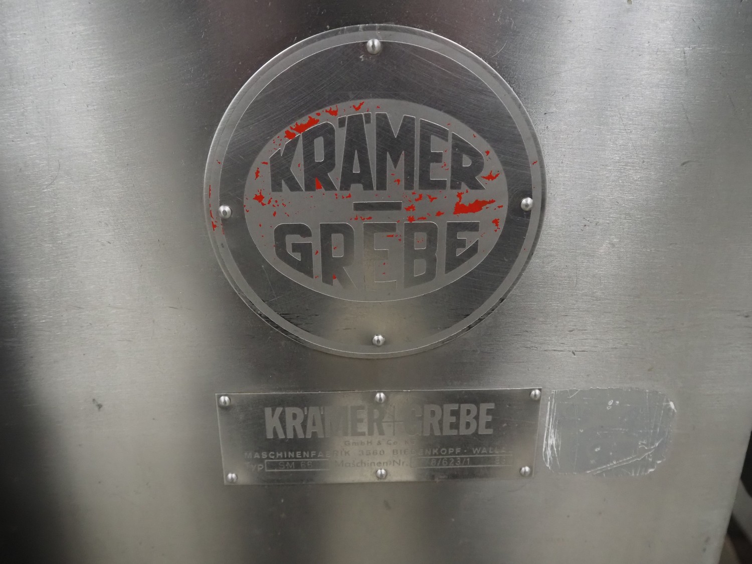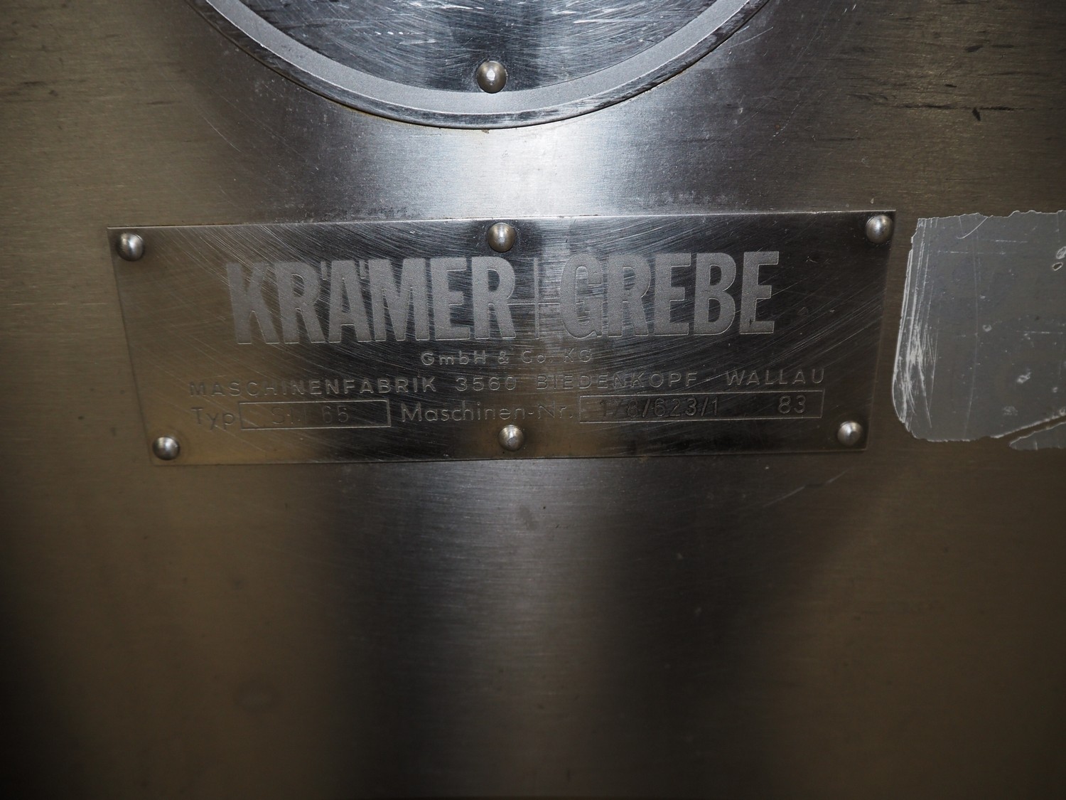 Kramer + Grebe cutter with s/s switch cabinet, type: SM 65, machine number: 1 8/623/1 83, year of construction: 1983, 380/220 V, 3 Ph, 50 Hz, 53 A, steel bowl, volume: 65 liter, dimensions: 1600 mm x 1150 mm x 1400 mm, dimensions switch cabinet: 1000 mm x 300 mm x 850 mm. Including extra knives.