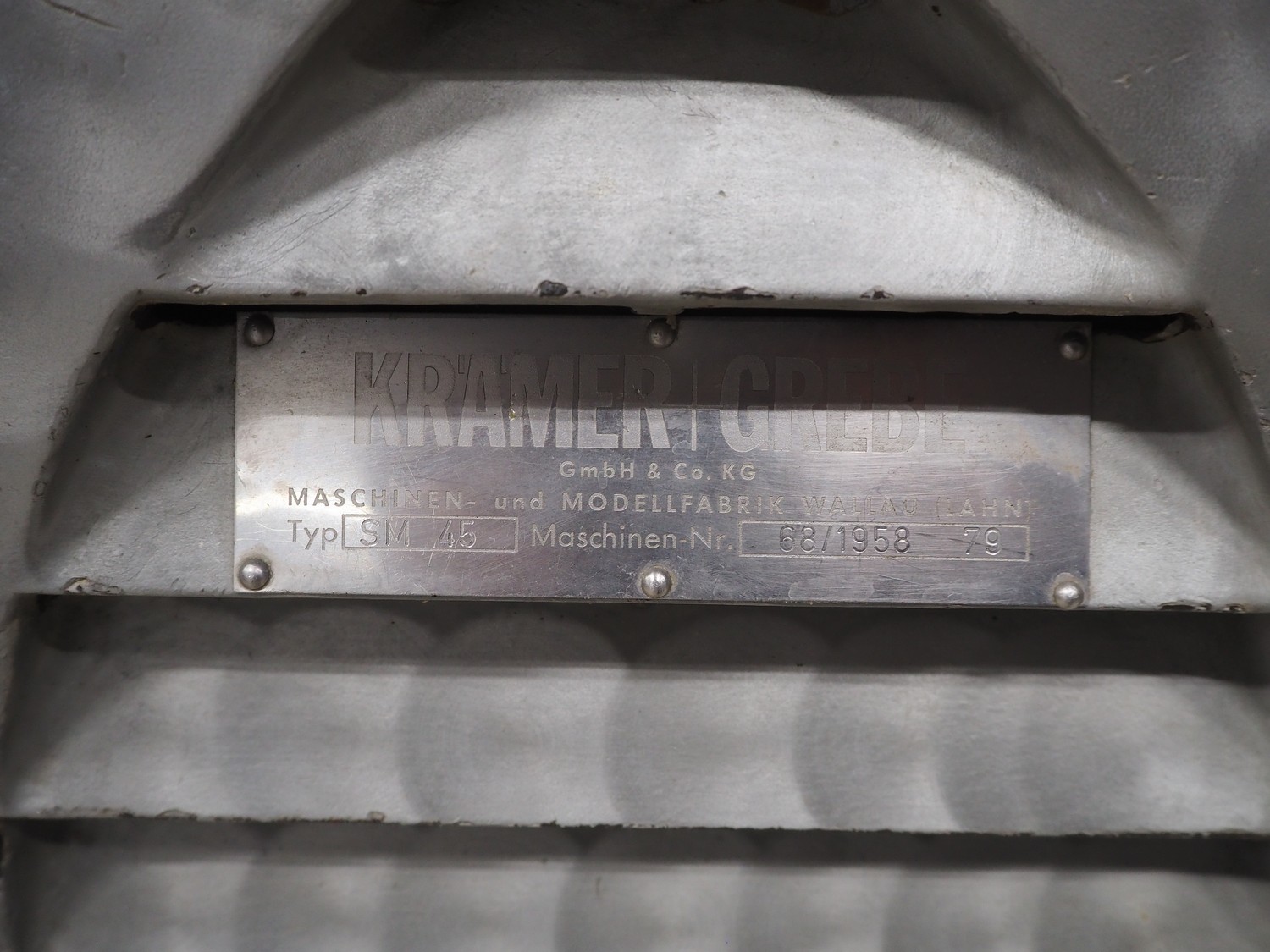 Krämer+Grebe cutter, type: SM 45, machine number: 68.1958 79, steel bowl, volume: 45 liter, dimensions: 1100 mm x 1000 mm x 1150 mm.