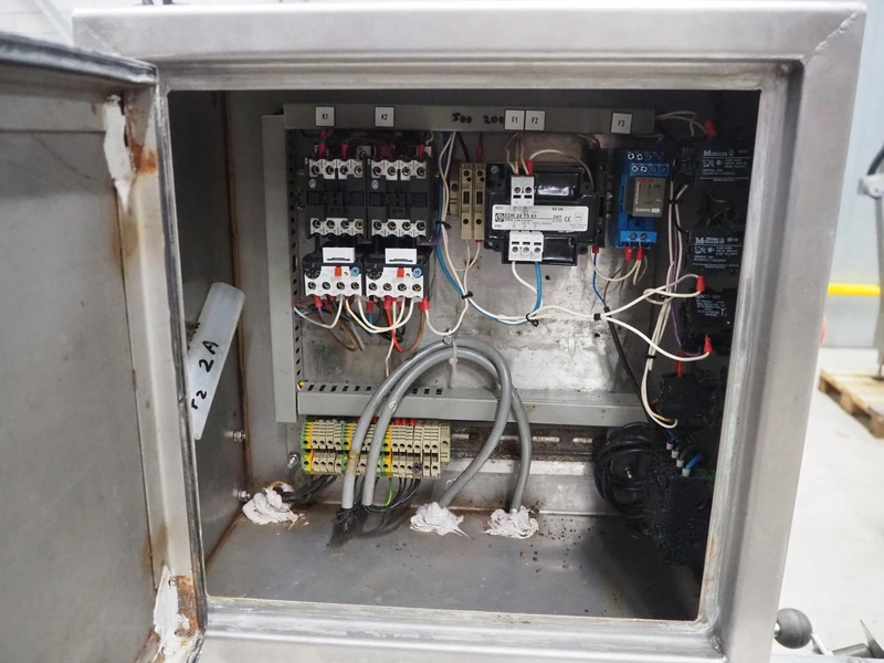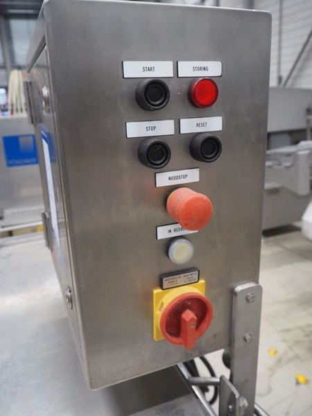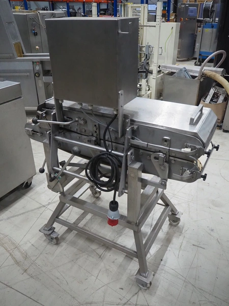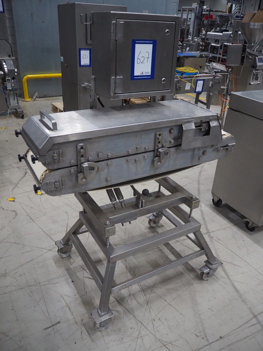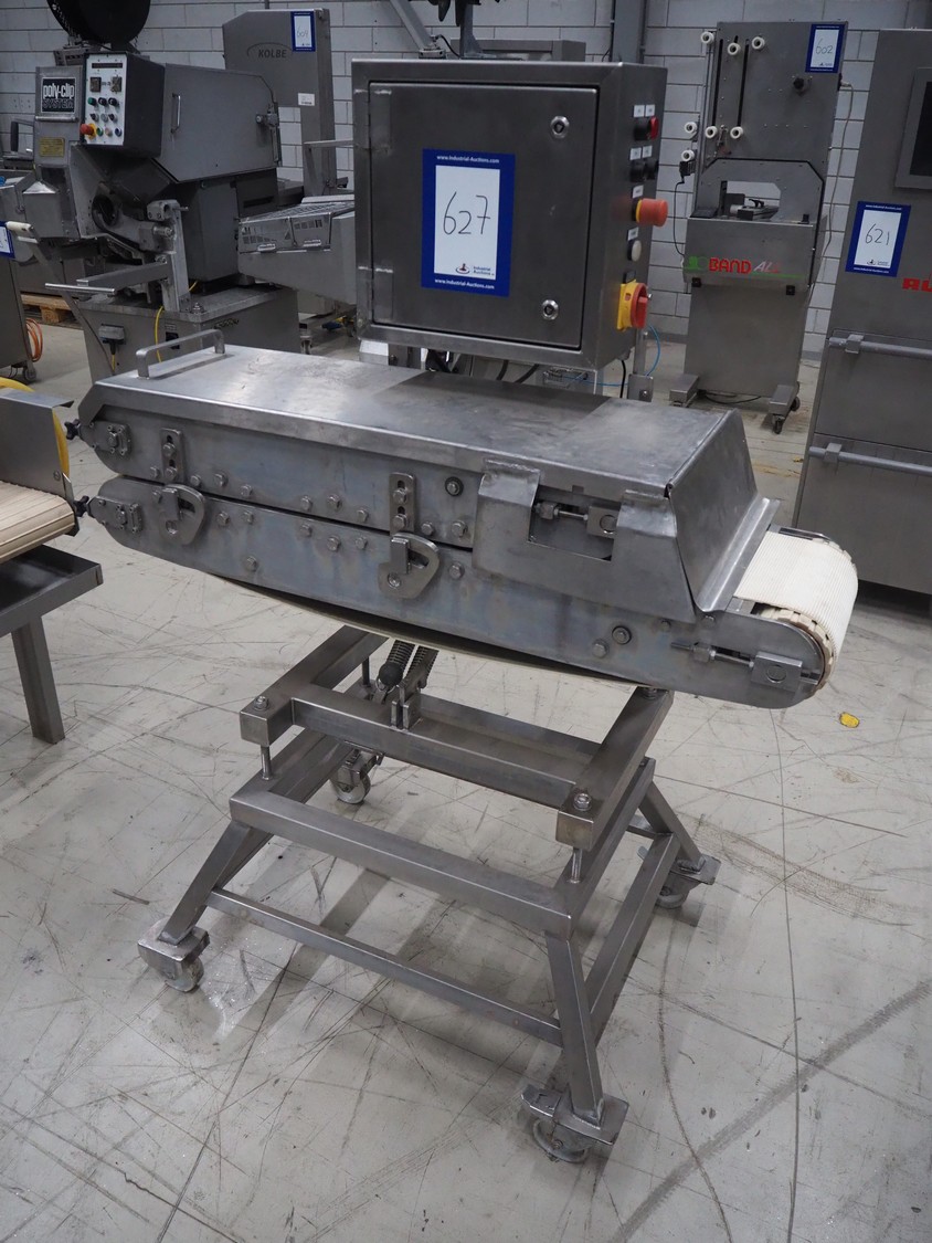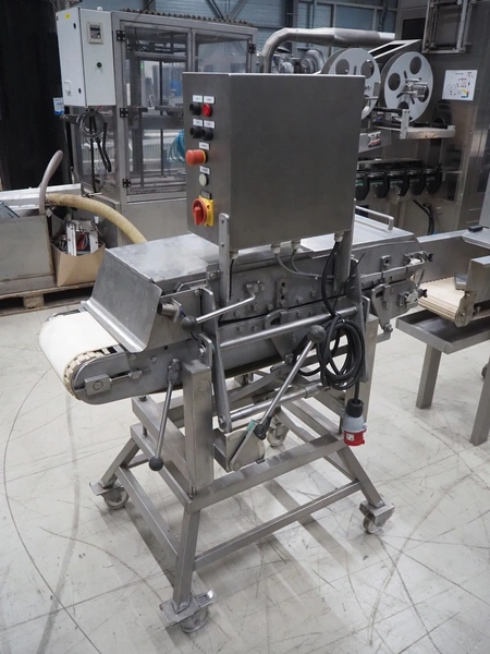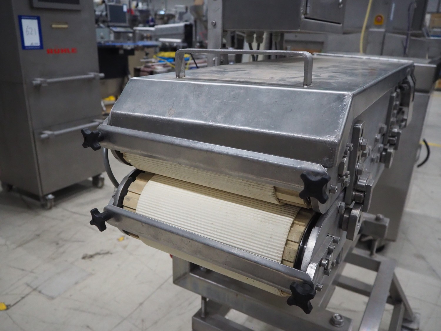 Mobile flattener, plastic belts, belt width: 250 mm, total dimensions: 1300 mm x 750 mm x 1630 mm.