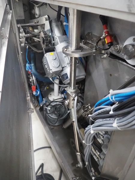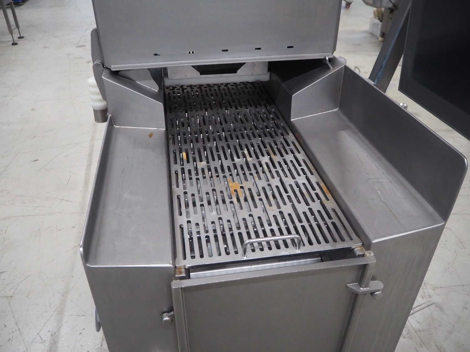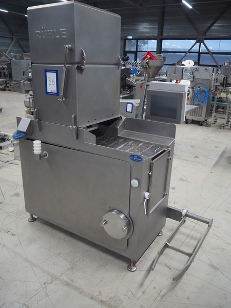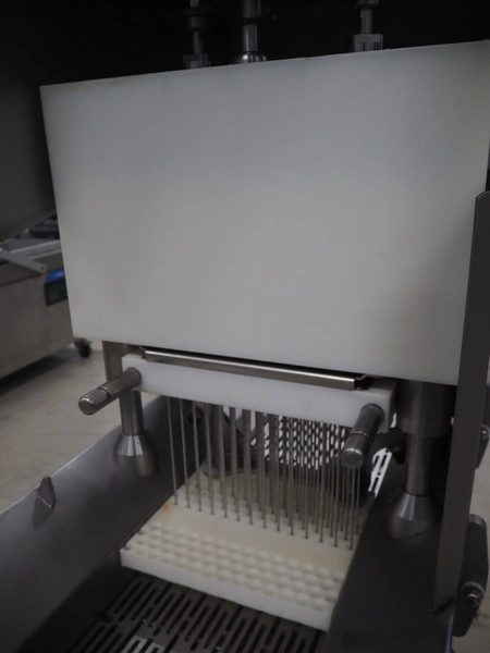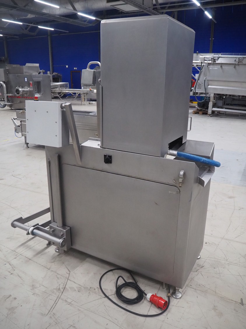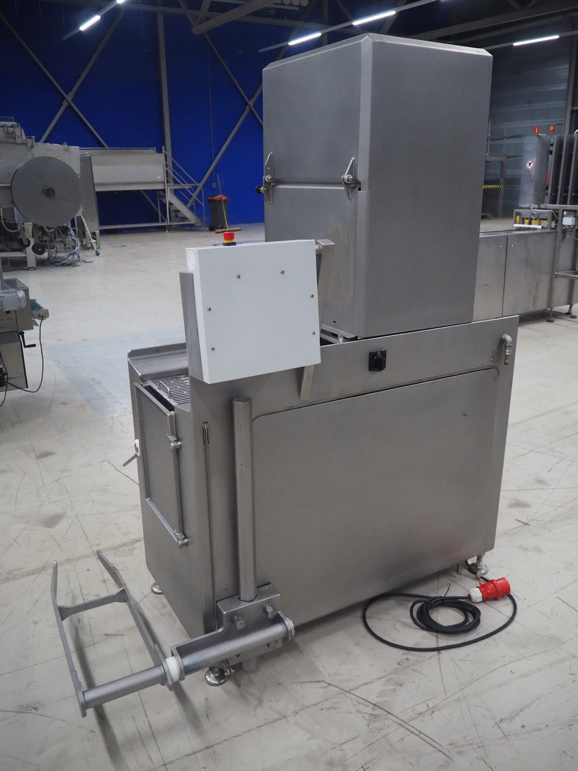Rühle GmbH injector with lifter for crates, 56 needles, s/s walking beam, beam width: 340 mm, total dimensions: 1700 mm x 900 mm x 2000 mm.