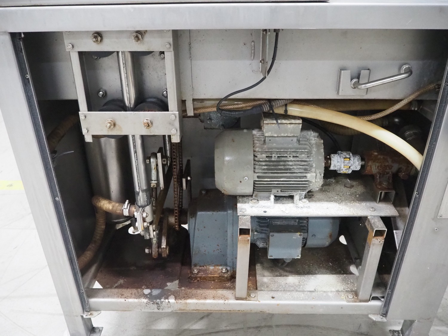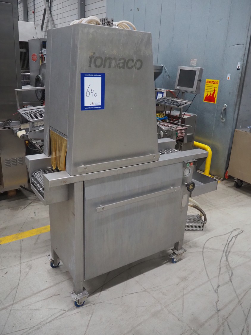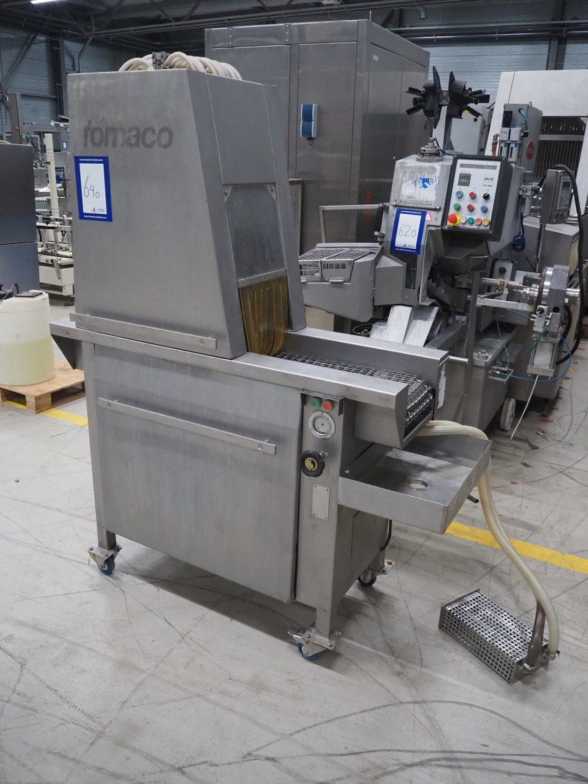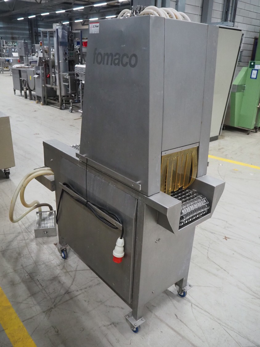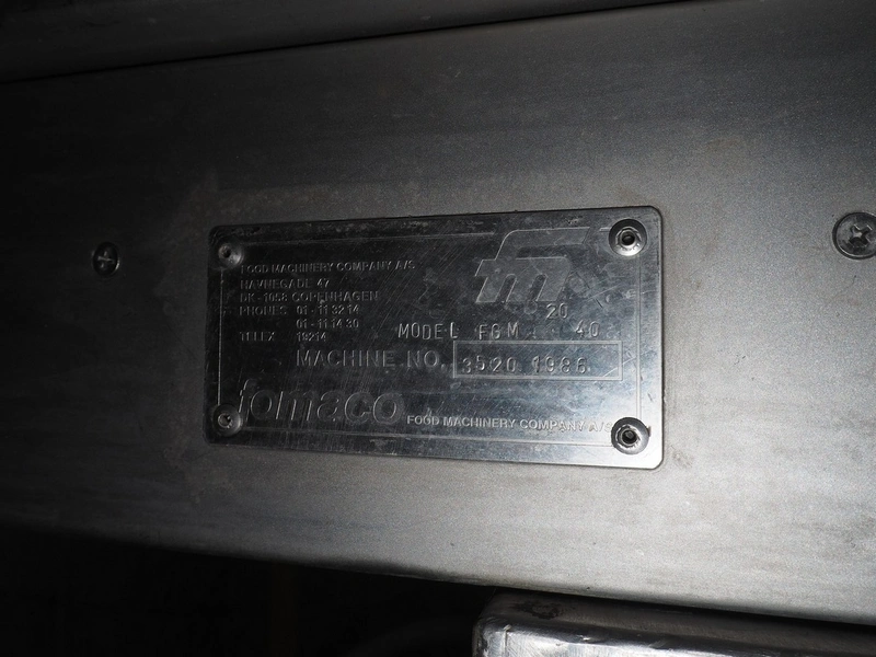 Fomaco Food Machinery Company A/S mobile injector, model: FGM 20 40, machine number: 3520 1986, s/s mesh belt, belt width: 235 mm, clearance: 280 mm x 240 mm, total dimensions: 1450 mm x 580 mm x 1880 mm.