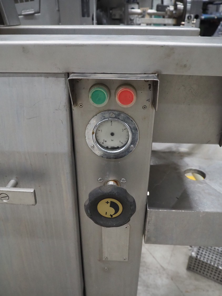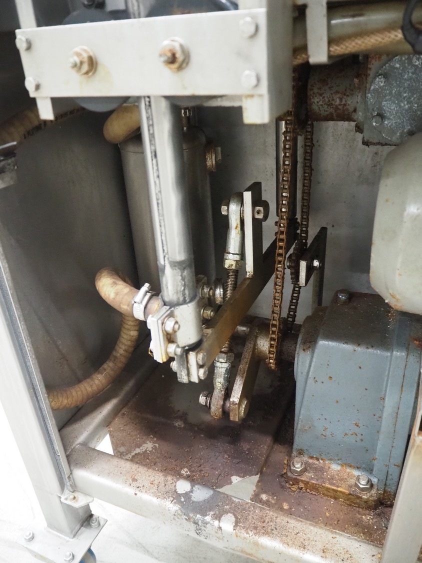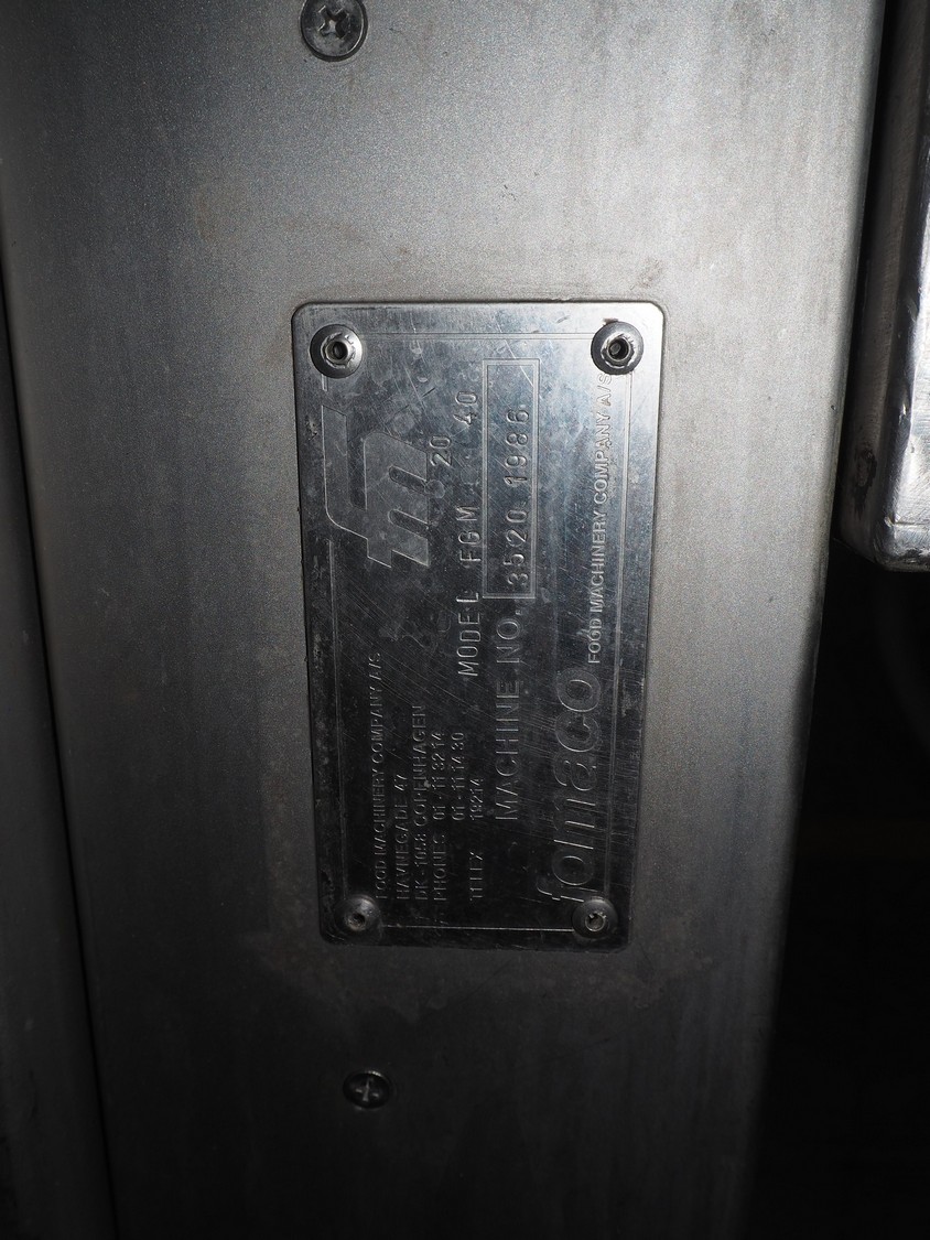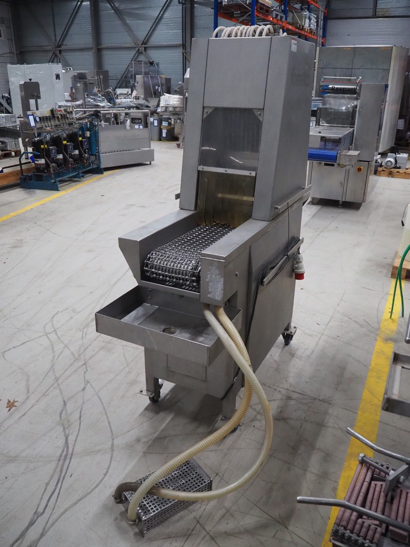 Fomaco Food Machinery Company A/S mobile injector, model: FGM 20 40, machine number: 3520 1986, s/s mesh belt, belt width: 235 mm, clearance: 280 mm x 240 mm, total dimensions: 1450 mm x 580 mm x 1880 mm.