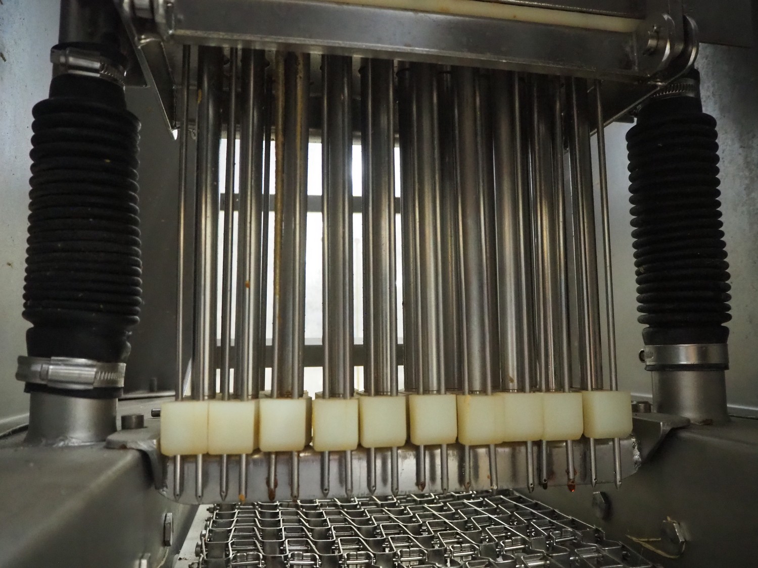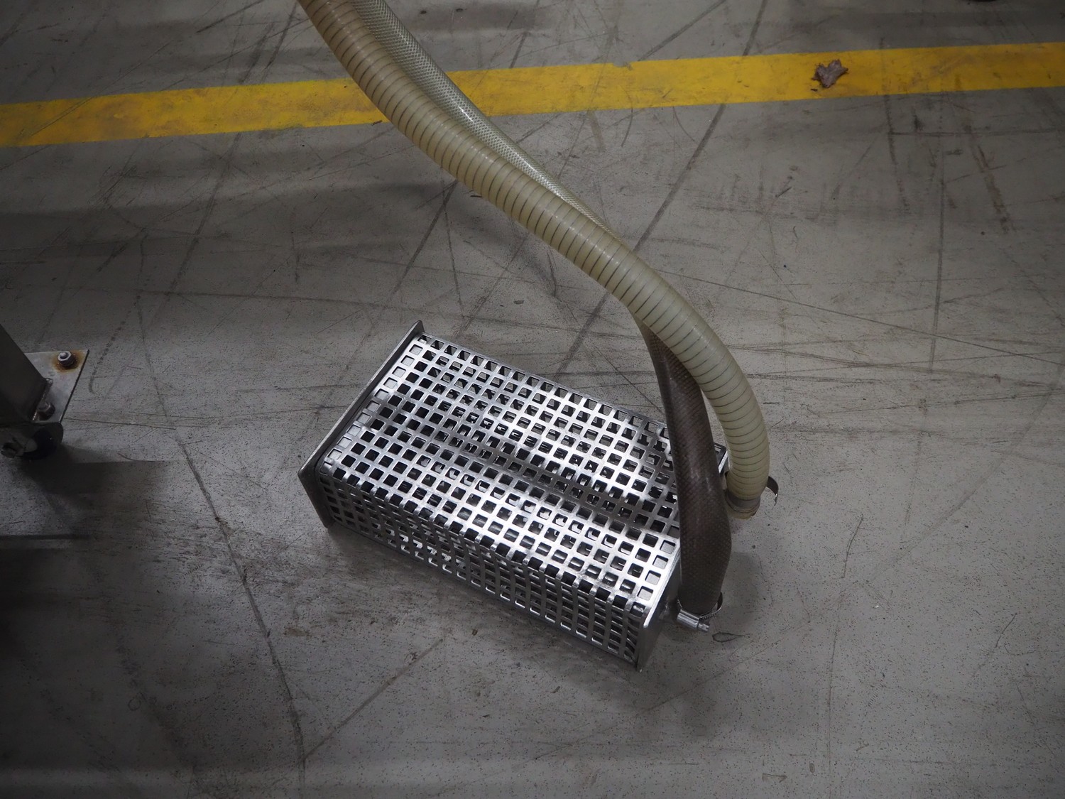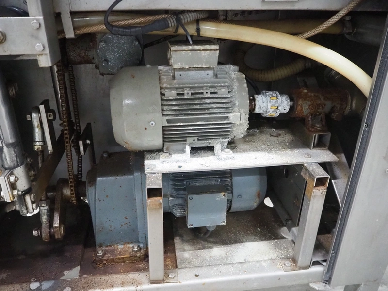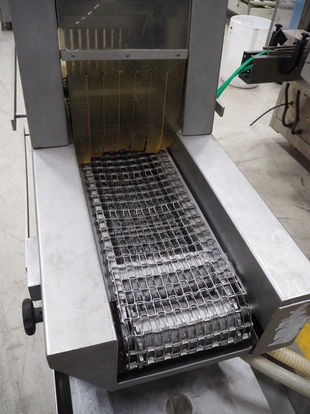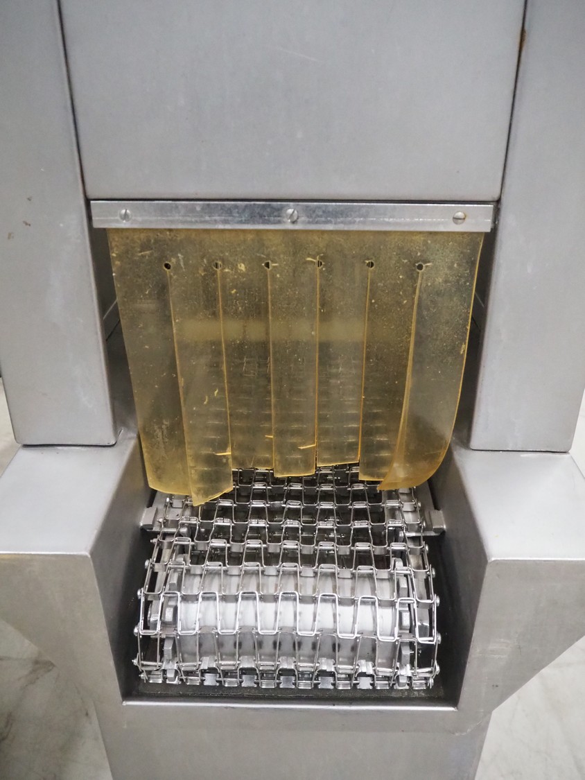 Fomaco Food Machinery Company A/S mobile injector, model: FGM 20 40, machine number: 3520 1986, s/s mesh belt, belt width: 235 mm, clearance: 280 mm x 240 mm, total dimensions: 1450 mm x 580 mm x 1880 mm.