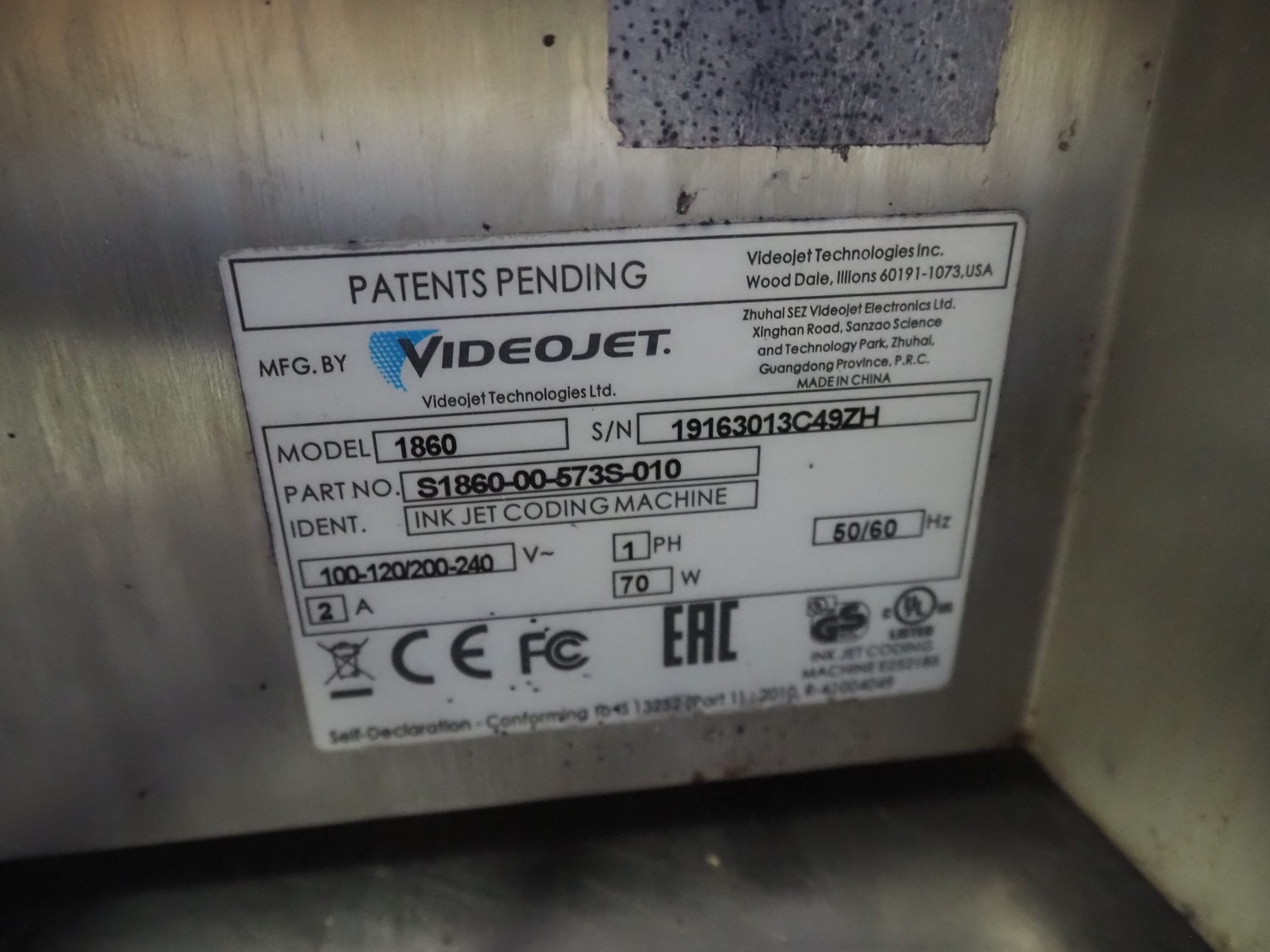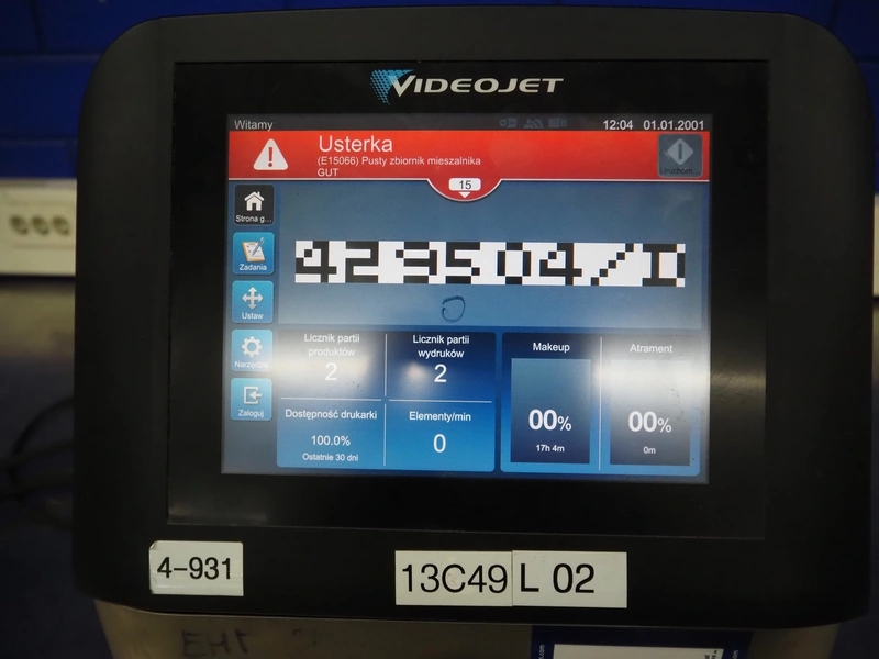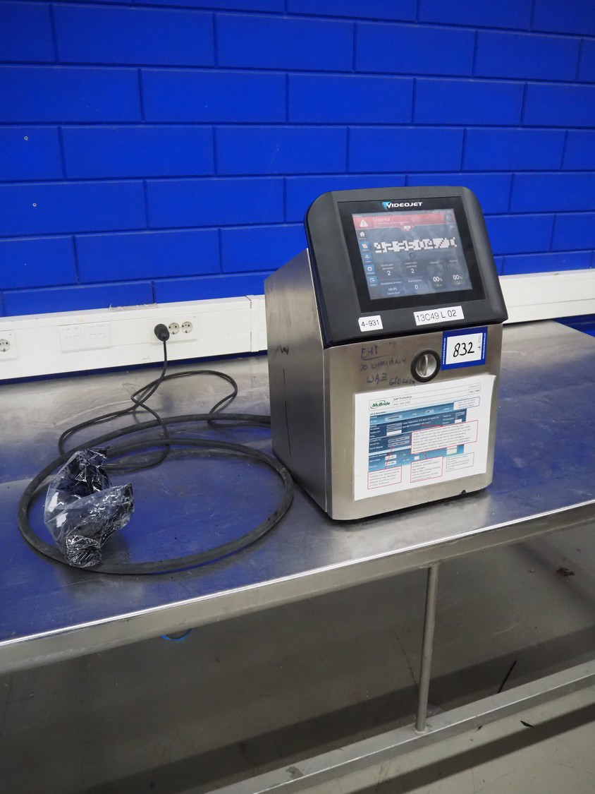 Videojet inkjet printer, model: 1860, serial number: 19163013C49ZH, 100-120/200-240 V, 1 Ph, 50/60 Hz, 2 A, 70 W, toner: V7206L, make-up: V901Q- 1l, ink: V4211-L, dimensions: 370 mm x 400 mm x 610 mm.