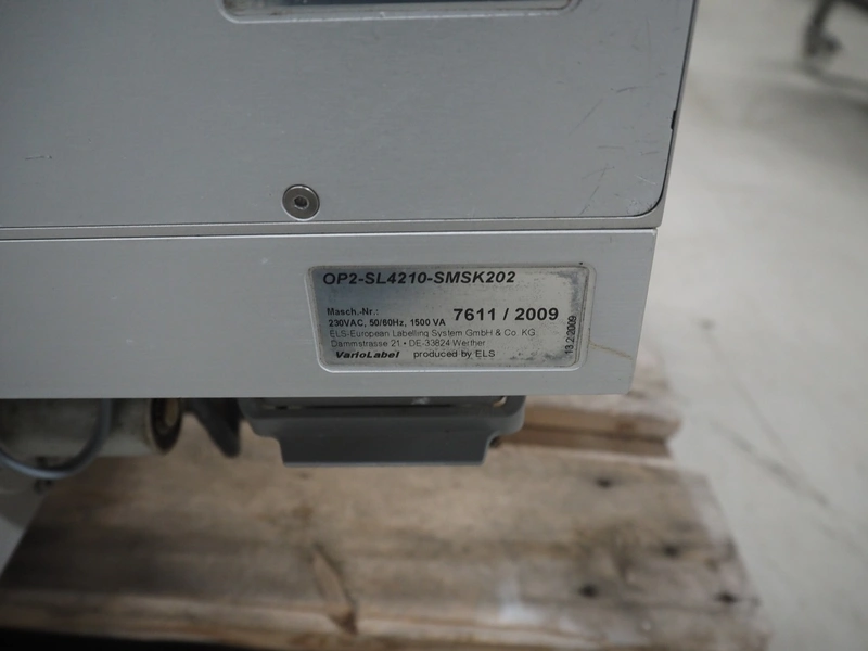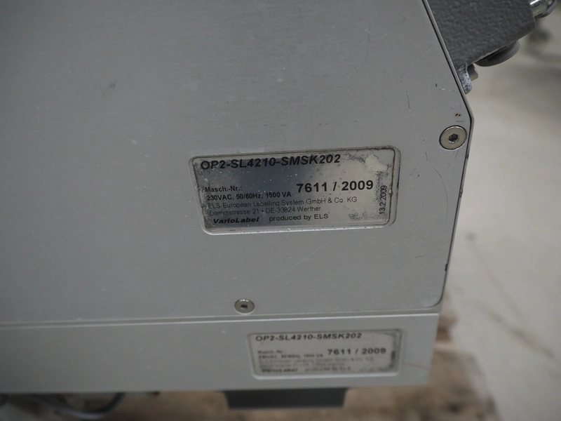 ELS labelling machine for Variovac thermoformer, OP2-SL4210-SMSK202, machine number: 7611/2009, 230 V, 50/60 Hz, dimensions: 1000 mm x 900 mm x 1400 mm.